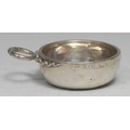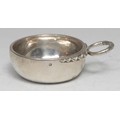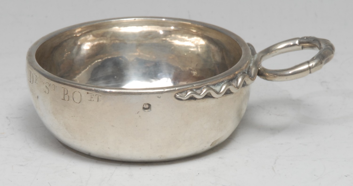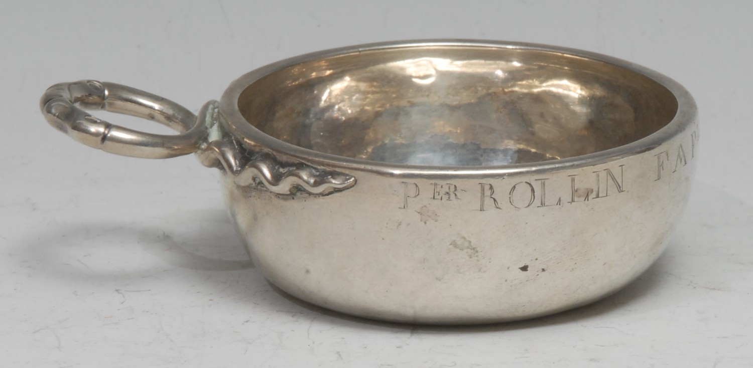 An 18th century French silver wine taster, vine-and-tedril loop handle, 7.5cm diam, 3.5oz