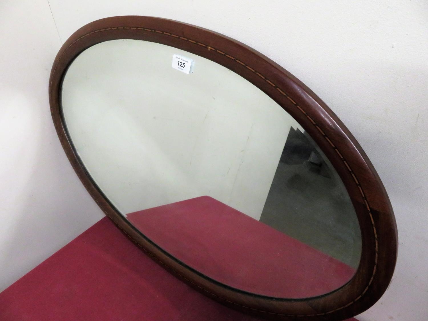 Edwardian oval bevelled edge wall mirror in inlaid mahogany frame
