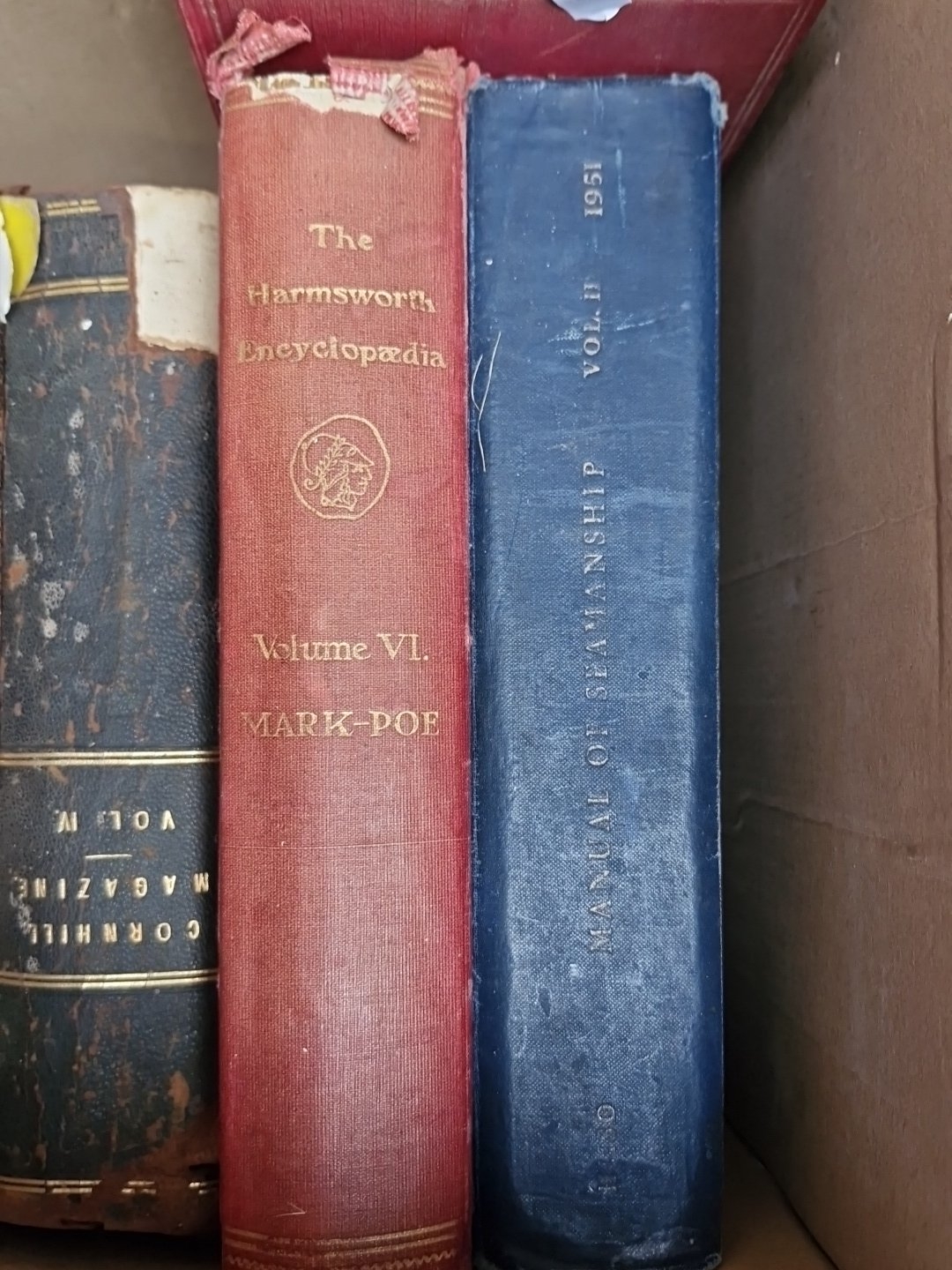 A group of vintage and earlier hardback books, including The Cornhill Magazine (Vol. II–IV), The Harmsworth Encyclopaedia (Vol. VI, Mark–Poe) and a 1951 Manual of Citizenship, with assorted cloth and decorative bindings.