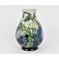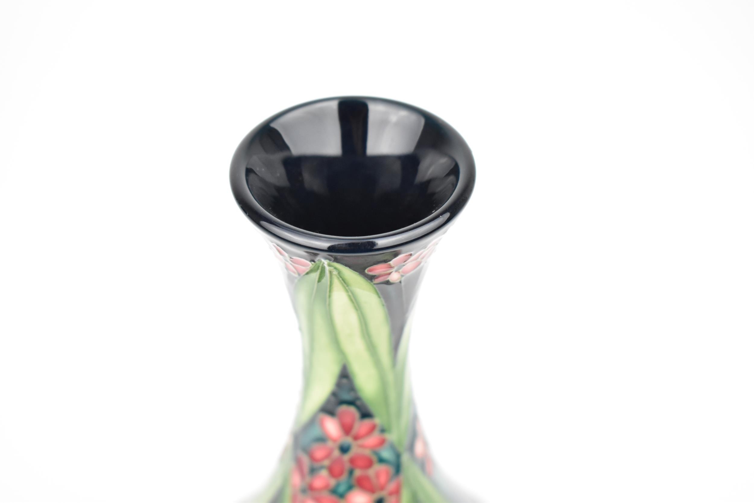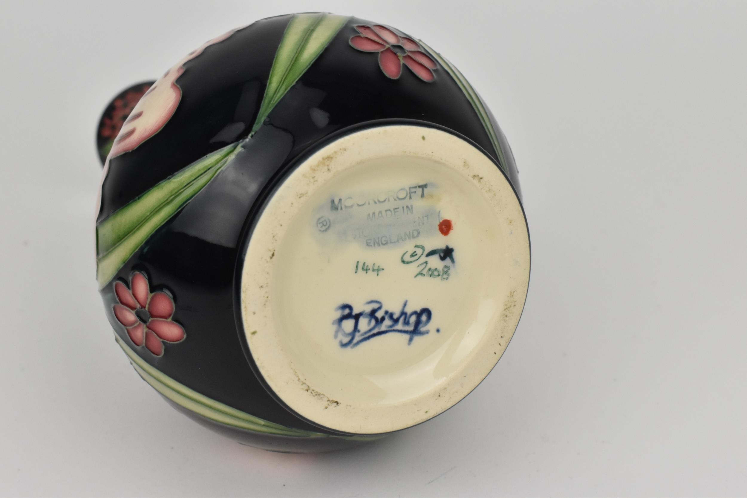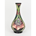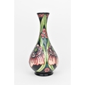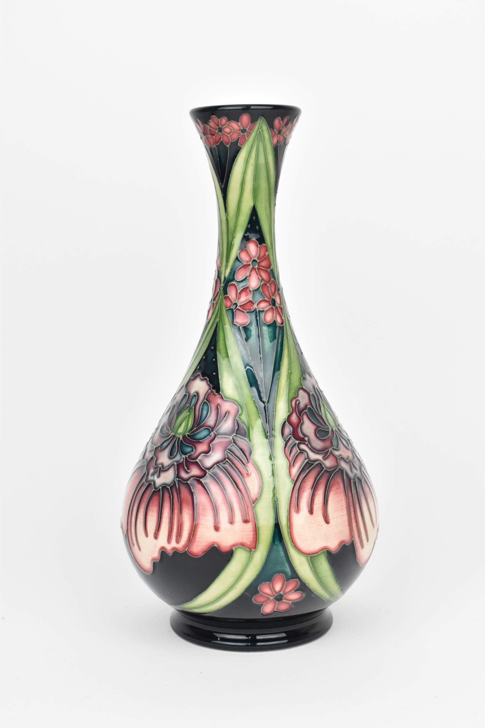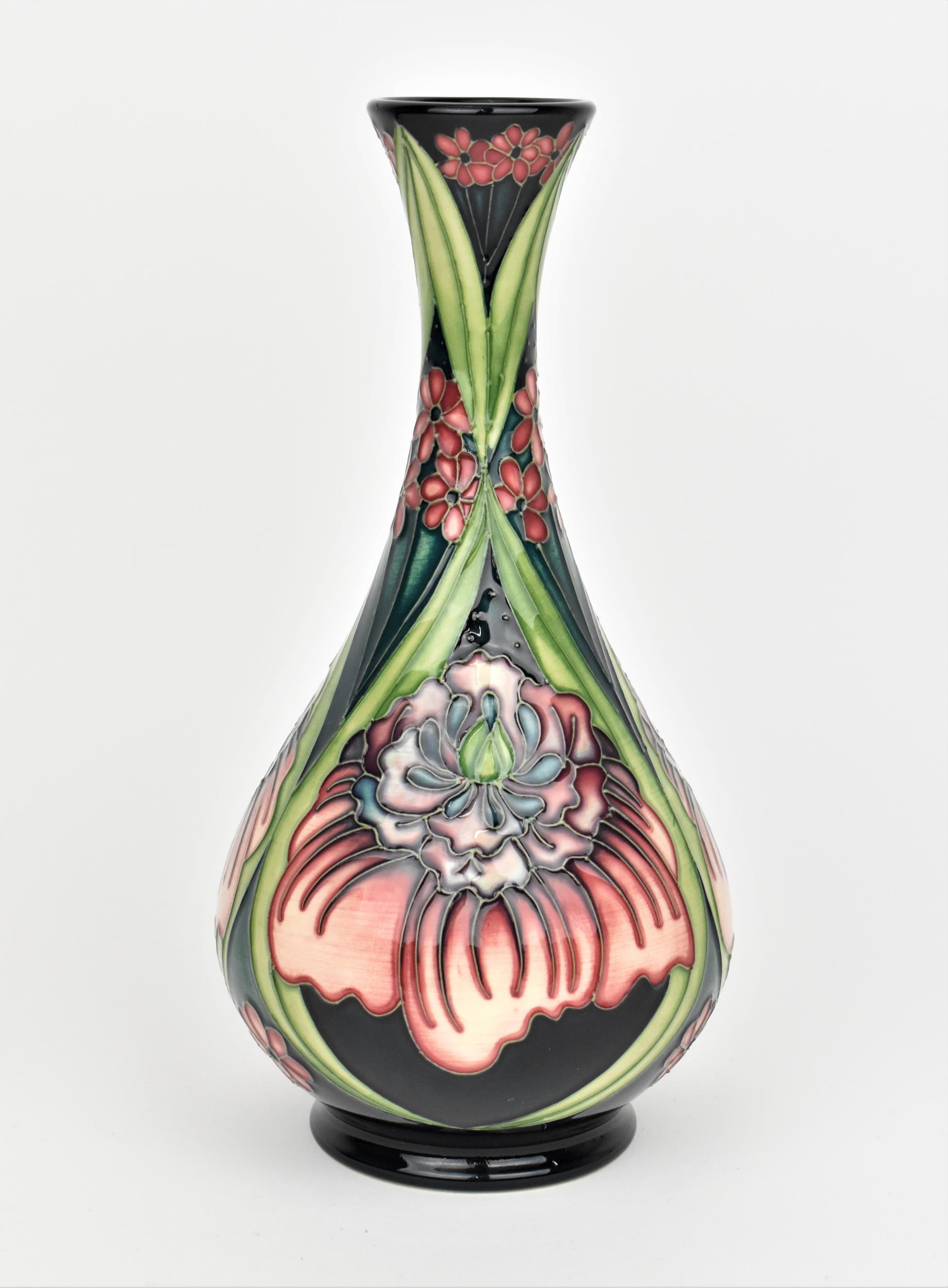 A Moorcroft pottery vase by Rachel Bishop, limited edition no. 144, 2008, of baluster form with slender neck, with tubelined floral decoration in pinks and greens, signed by R.J. Bishop to underside, 23 cm high