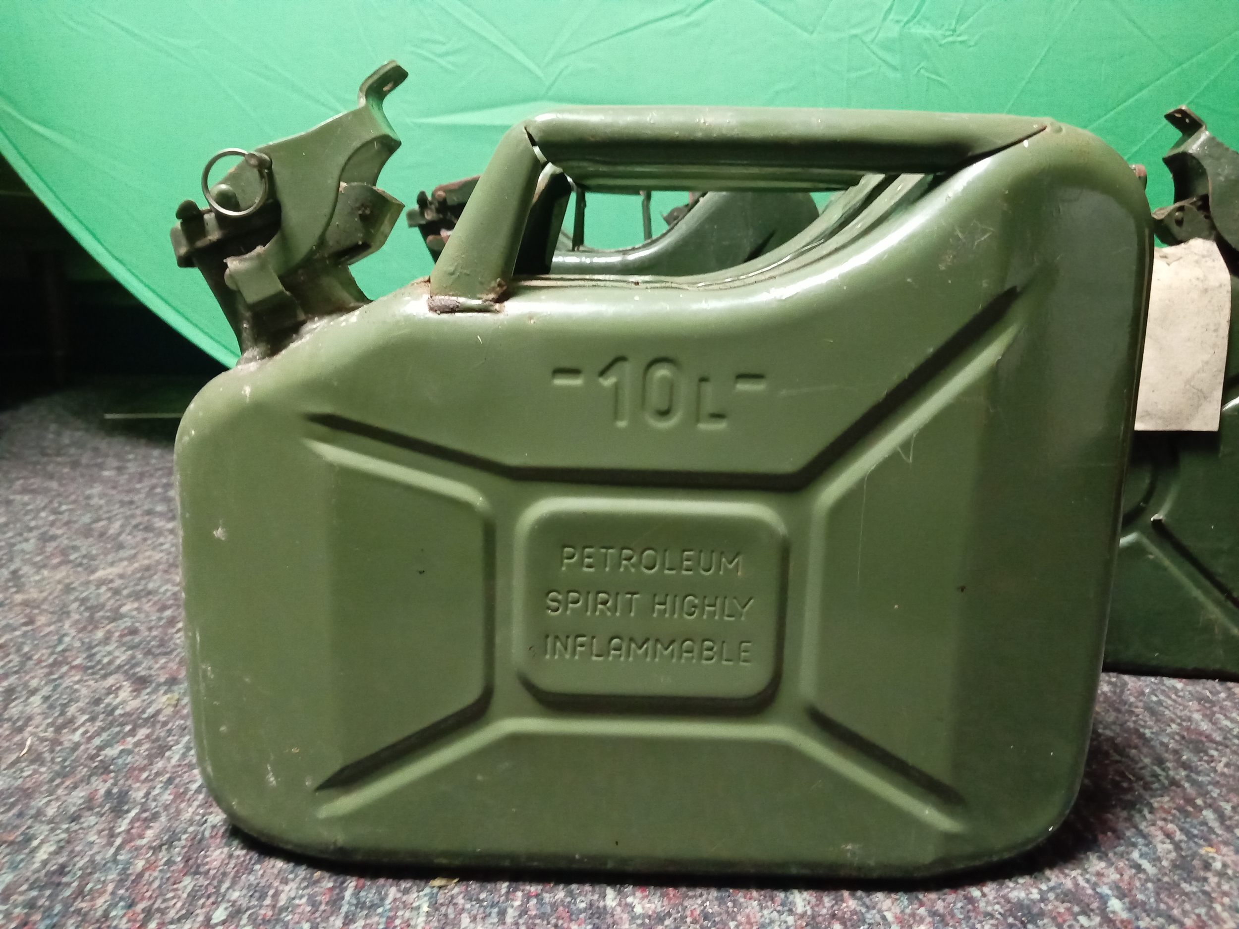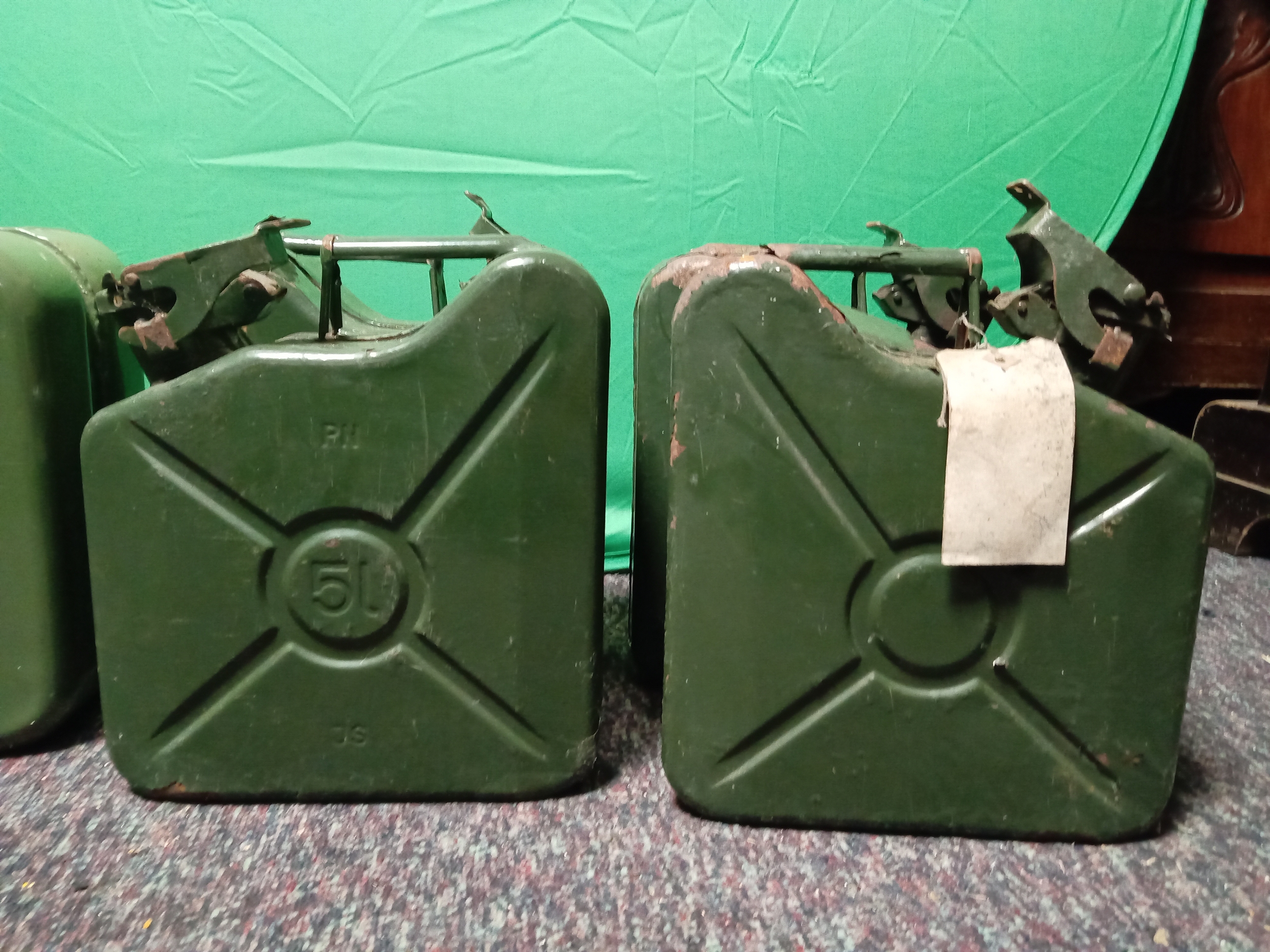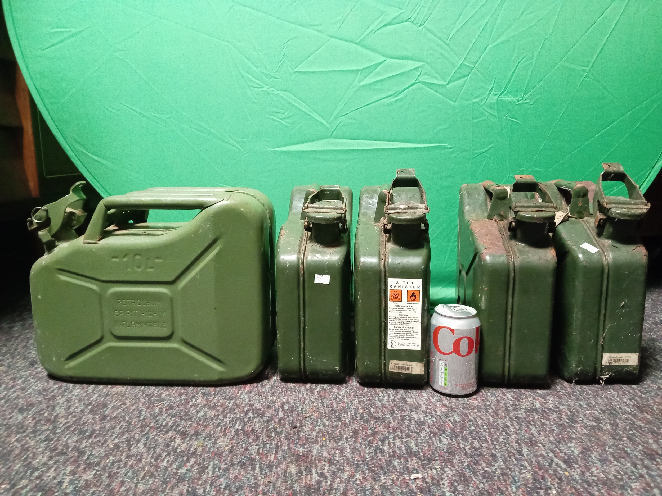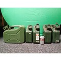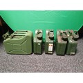A collection of vintage metal Jerry cans. To include 4 5 litre cans & 1 10 litre can.