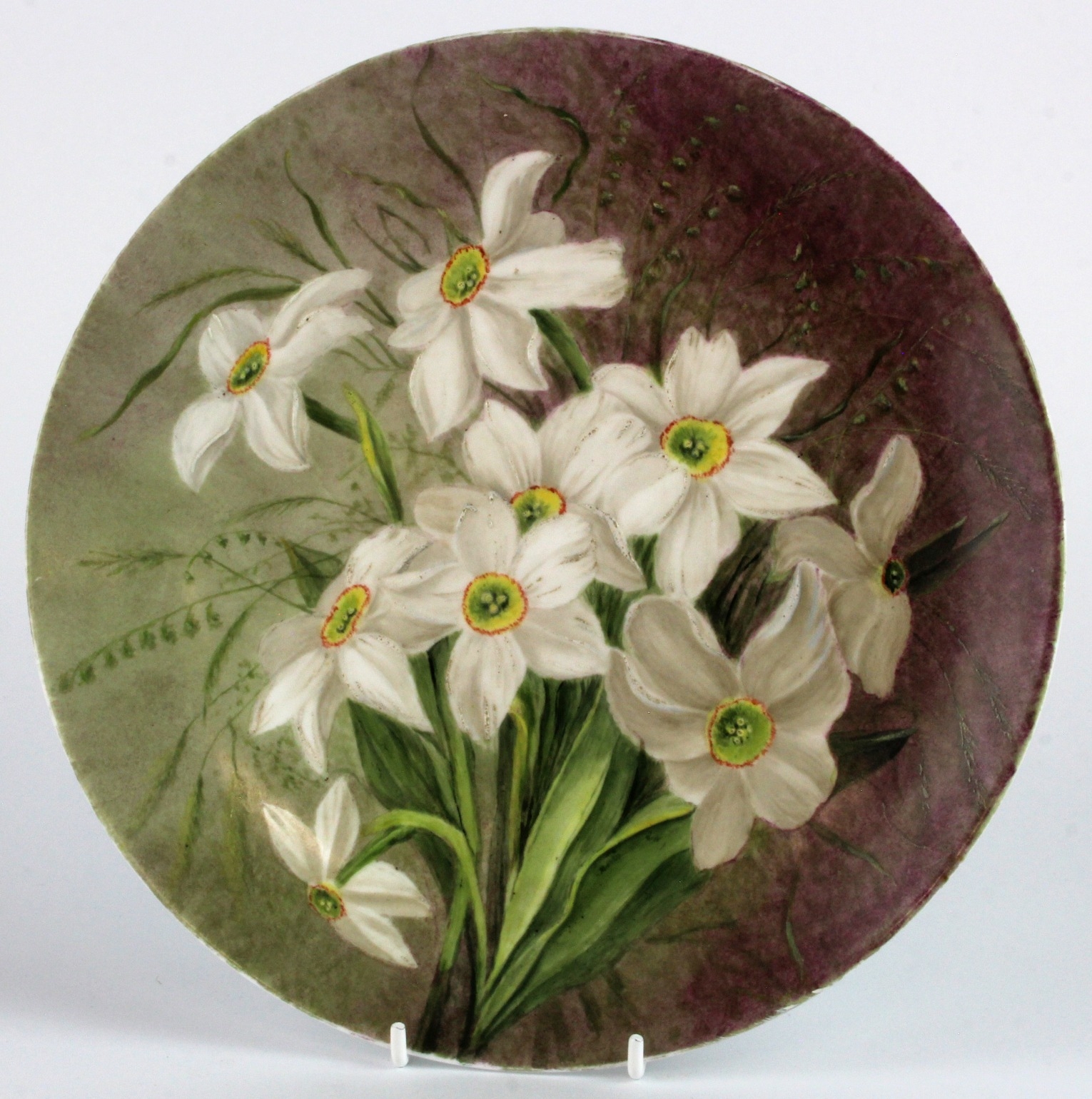 Hand painted plate, depicting Narcissus flowers, by S. Boulton, dated 1804, made for Bodley, signed by artist to reverse with imbossed makers name, diameter 24cm approx.