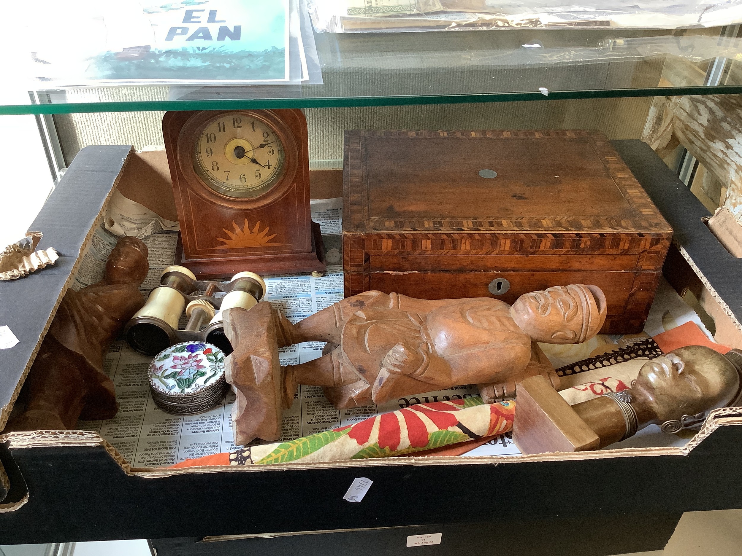 A mixed selection of assorted items to include an inlaid sewing box, an inlaid Victorian clock etc