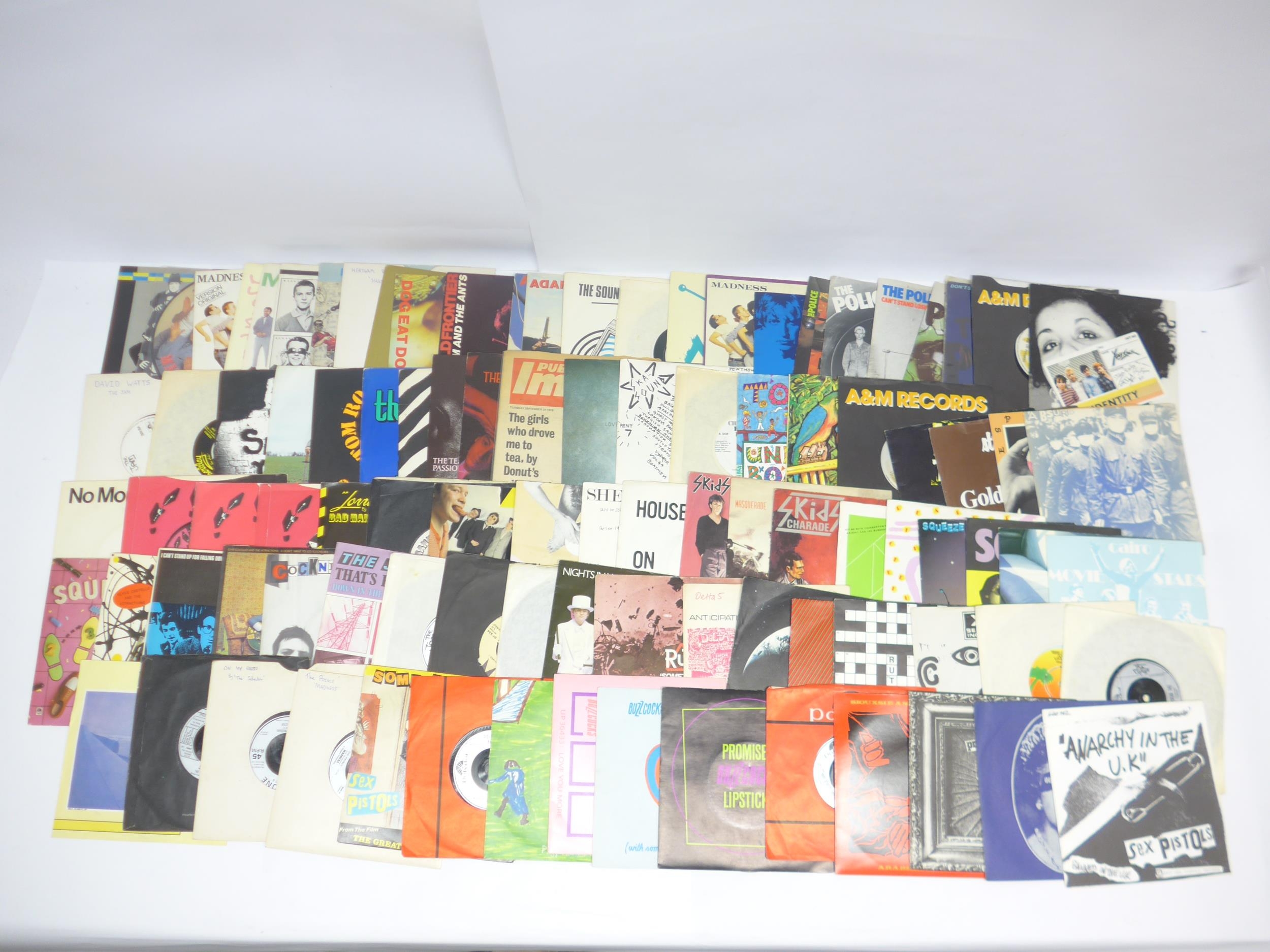 Punk / New Wave / Ska - A good collection of approximately ninety-five 7" singles, mostly in picture sleeves or company sleeves, artists include The Chords, Buzzcocks, Madness, The Selecter, The Lambrettas, The Jags, XTC, Cairo, Ruts, Delta 5, The Dickies, The Motors, X-Ray Spex, The Vapors, Cockney Rejects, Siouxsie & The Banshees, The Undertones, Blondie, The Members, Blondie, Adam & The Ants, Sham 69, The Police, Tom Robinson Band, The Skatalites, Tenpole Tudor, Alberto Y Lost Trios Paranoias, Jonathon Richman & The Modern Lovers, The Jam, King Trigger, Joe Jackson, The Piranhas, Tom Tom Club, The Ska-Dows, Joy Division, Public Image Ltd, The Teardrop Explodes, The Stranglers, The Beat, Bad Manners, The Boomtown Rats, Skids, Ian Dury & The Blockheads, Squeeze, Elvis Costello & The Attractions (approx. 95, vinyl and sleeves generally VG+)