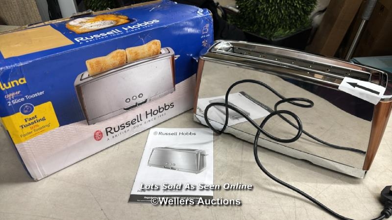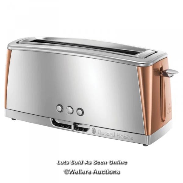 RRP: 32.99 - RUSSELL HOBBS RUSSELL HOBBS LUNA COPPER 2 SLICE TOASTER LONG SLOT WITH LIFT & LOOK / SEE IMAGES FOR CONDITION / STOCK IMAGES USED FOR ILLUSTRATION / E9