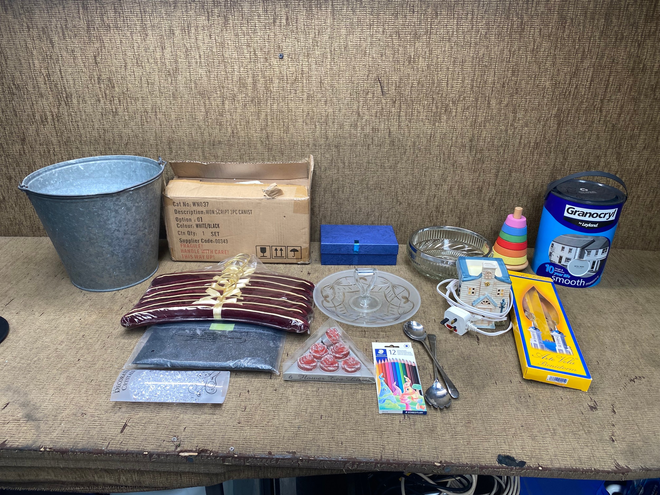 Mixed items including: Galvanised bucket, condiment sets and Leyland Grey skies paint.