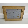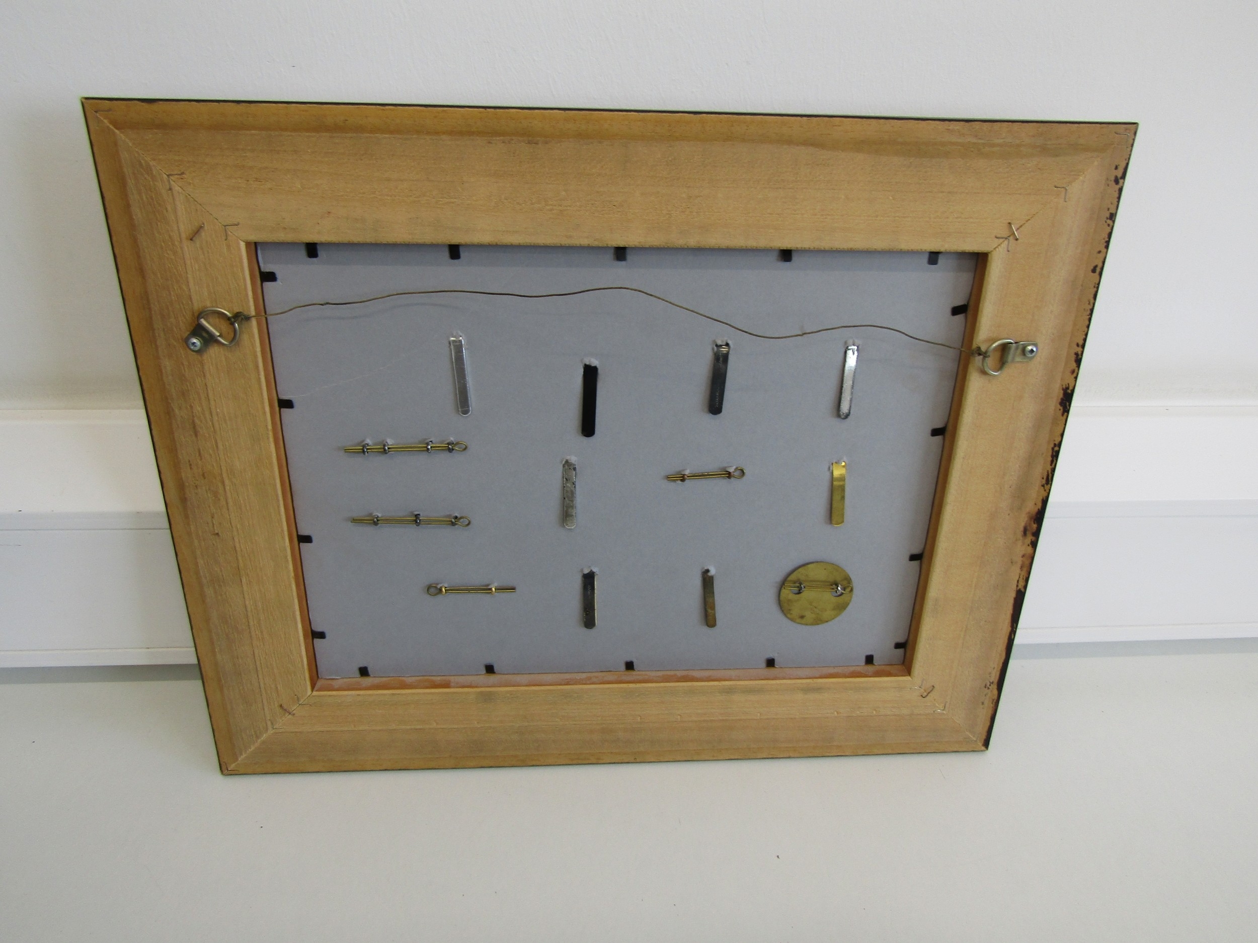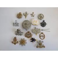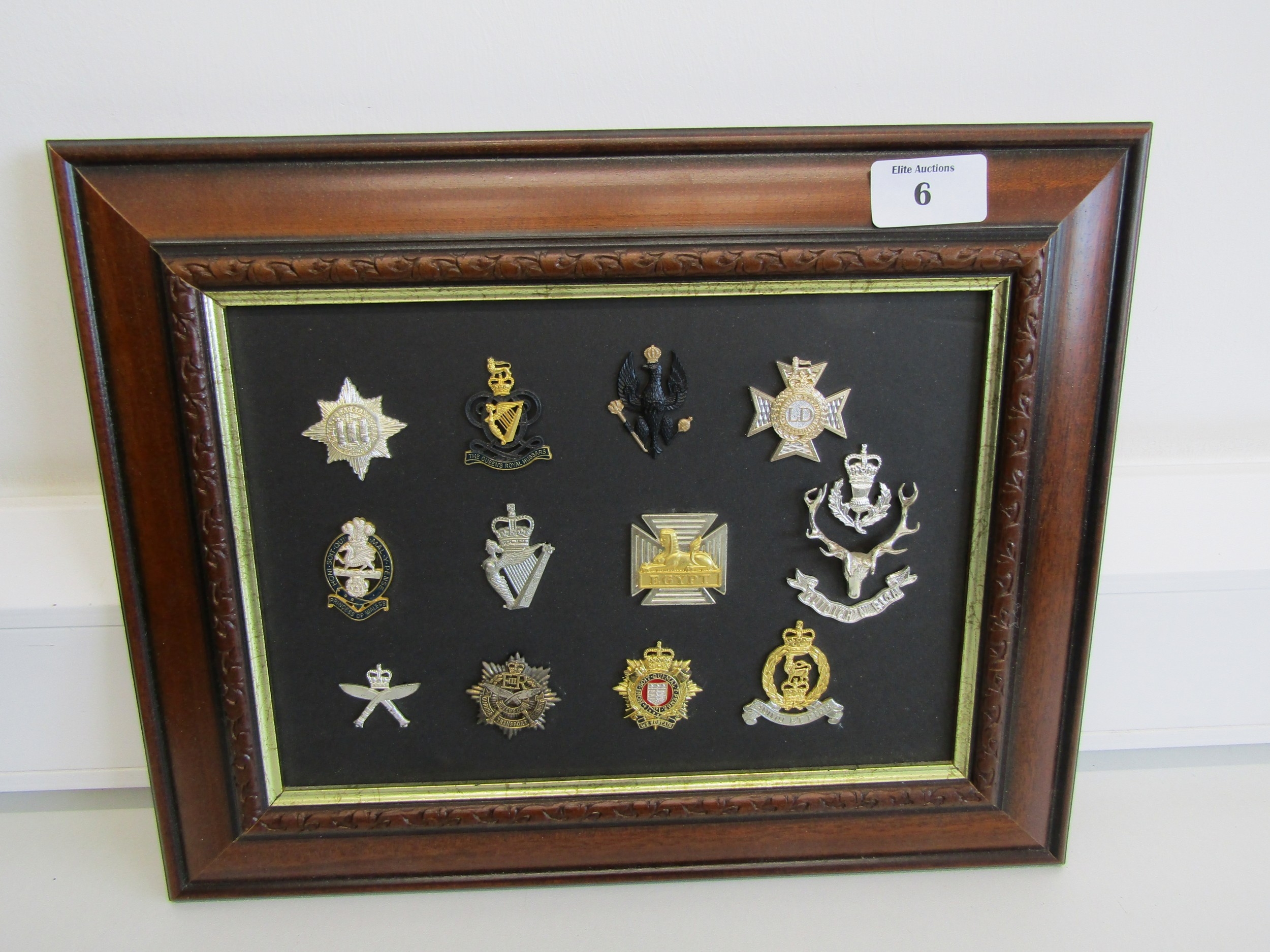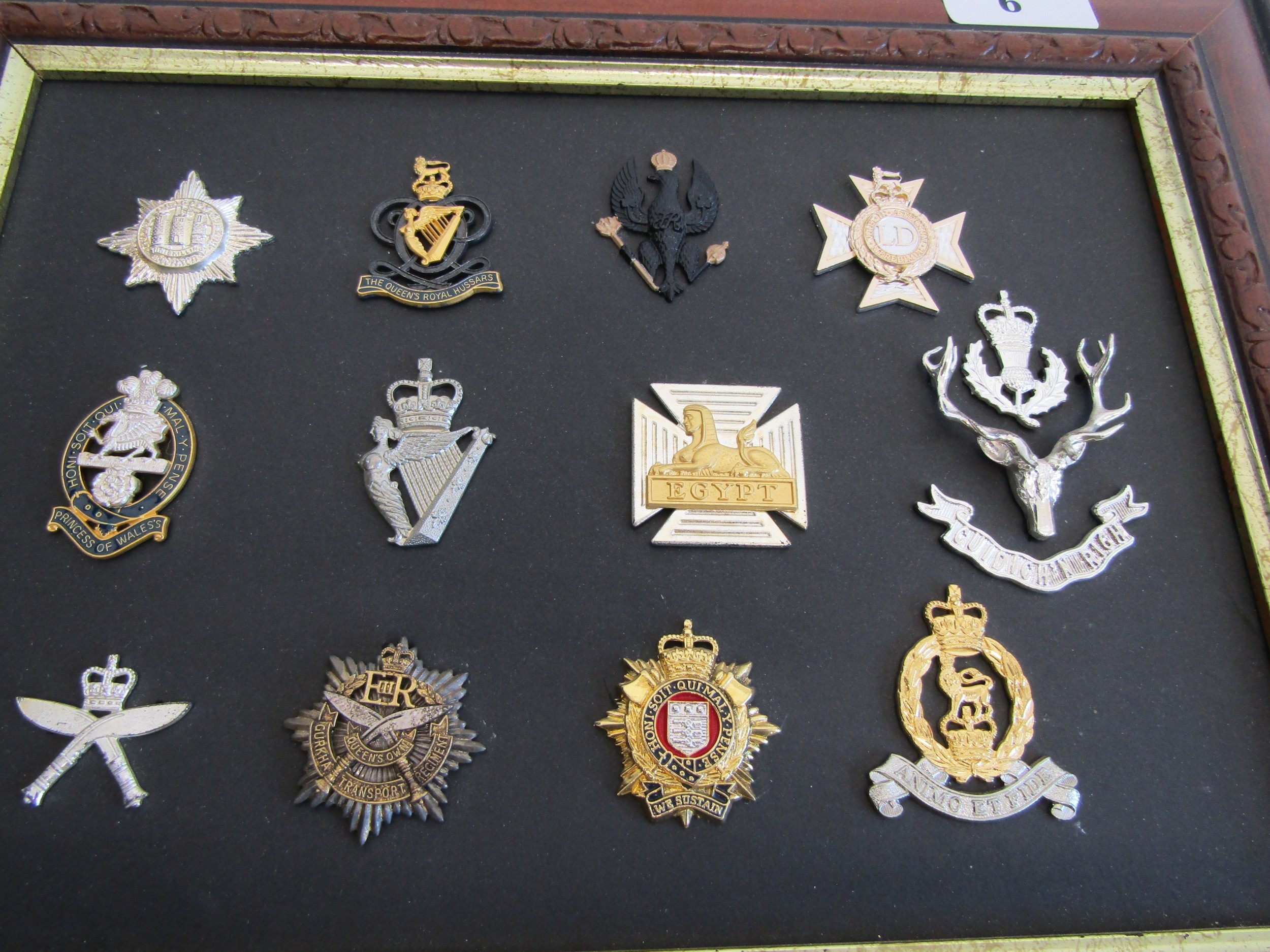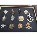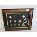 A collection of framed military cap badges.