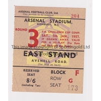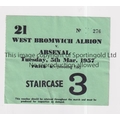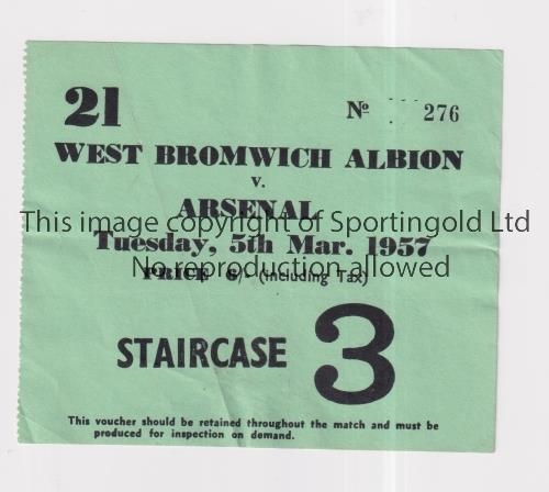 ARSENAL Ticket for the home FA Cup tie v West Bromwich Albion 5/3/1957, slightly creased. Generally good