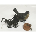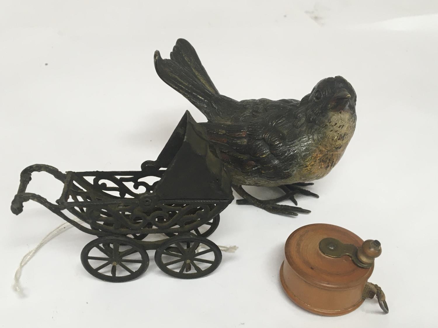 An Austrian cold painted bronze figure of a bird. A miniature tape measure and pram (3)