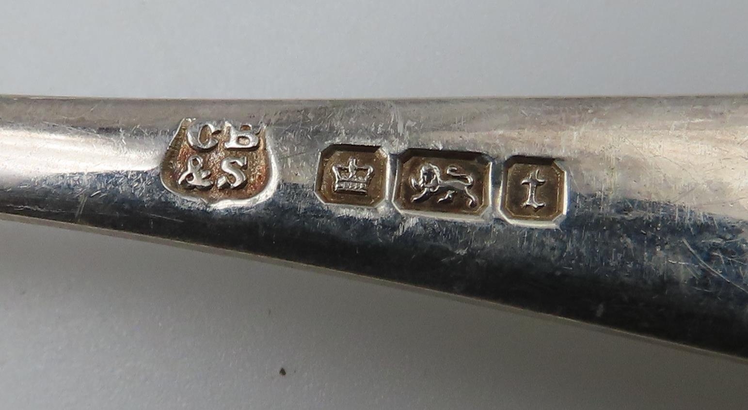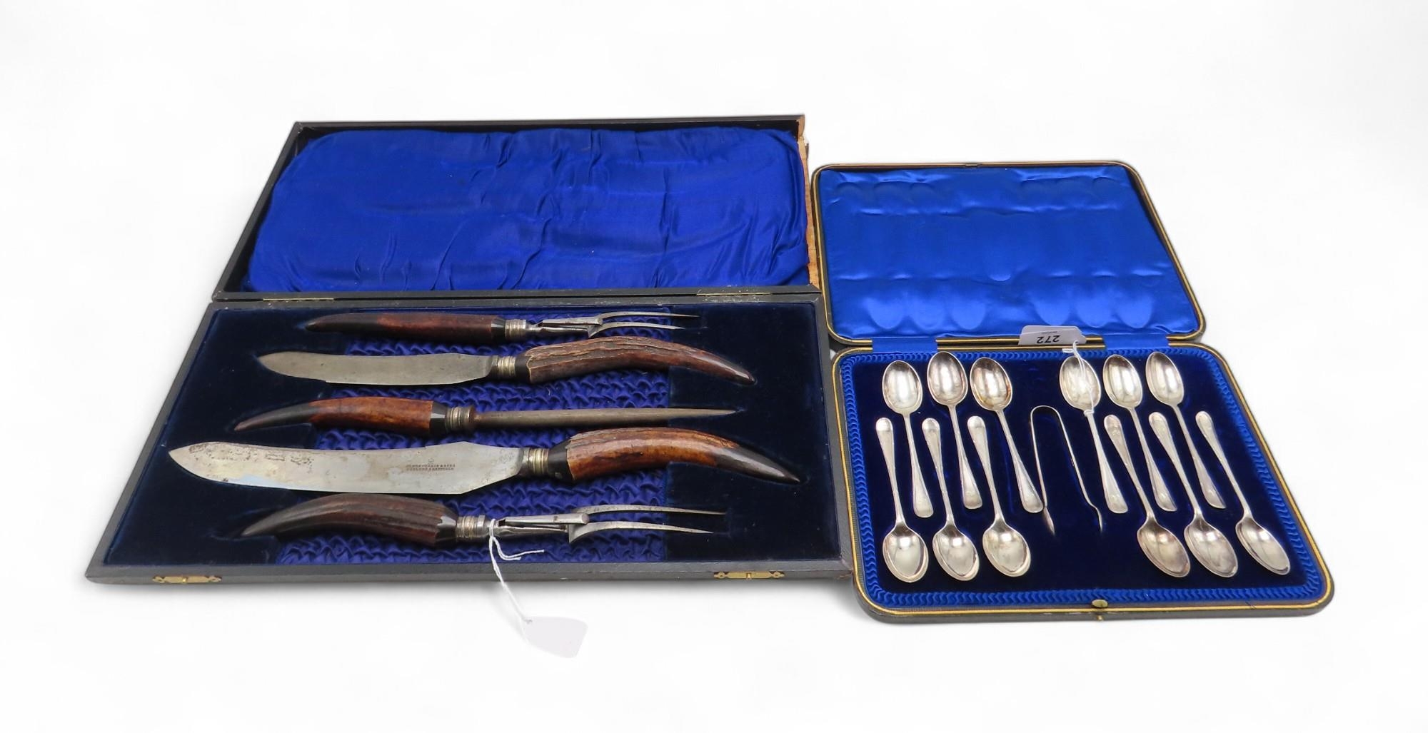 A cased set of silver teaspoons and sugar tongs, by Cooper Brothers & Sons, Sheffield 1911, a cased horn carving set by James Deakin & Sons, weighable silver 193gms (2)