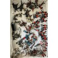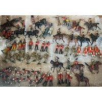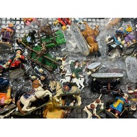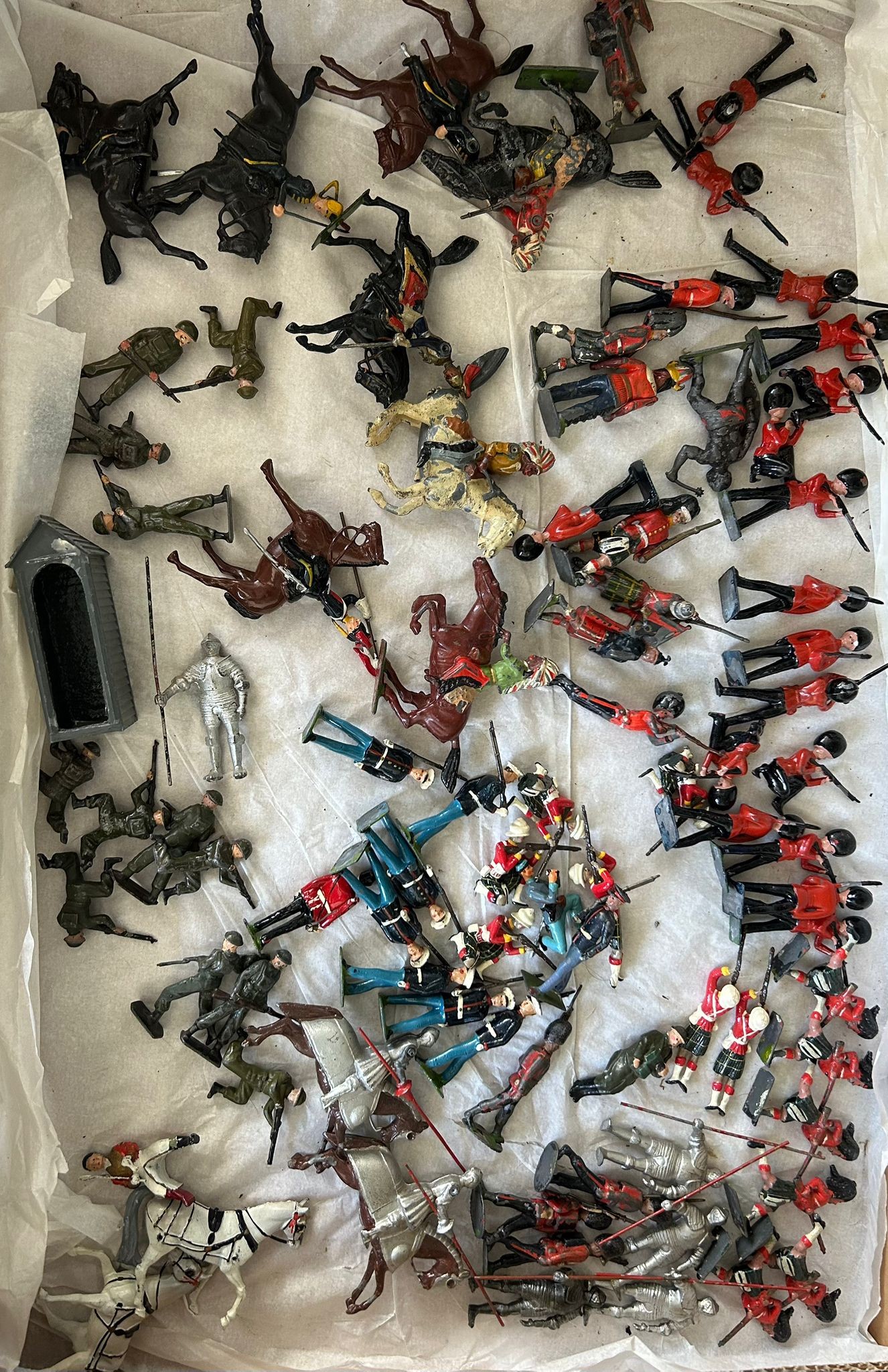 60+ lead and metal soldiers and figures, including marines, Scottish, Indians, Lancers, Knights, mounted and foot. Also includes century box. Some paint loss and possibly parts broken or missing. GC-
