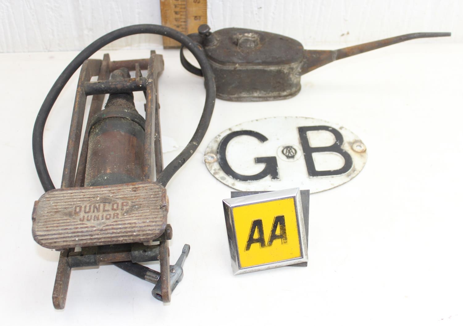 Vintage Dunlop foot pump, AA badge and GB plaque, oil can (4)