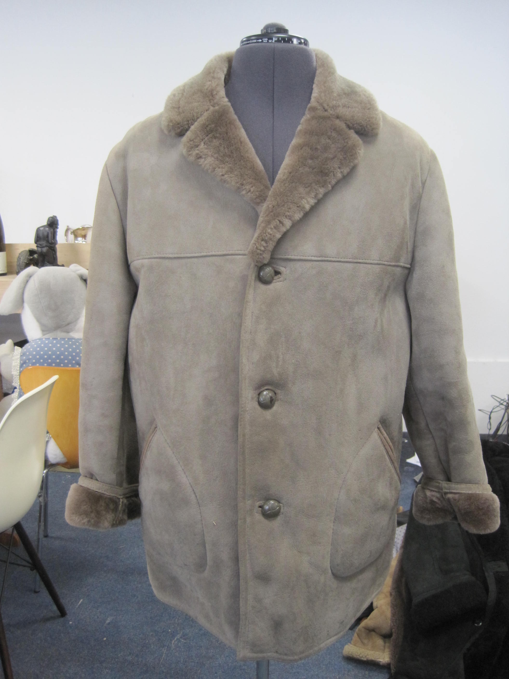 Baily's of Glastonbury gents single-breasted grey sheepskin coat. A/f particular wear to cuffs. This item is not new and shows normal signs of wear. It would benefit from cleaning. Inspection recommended.