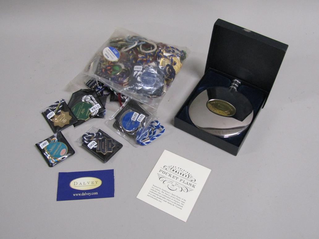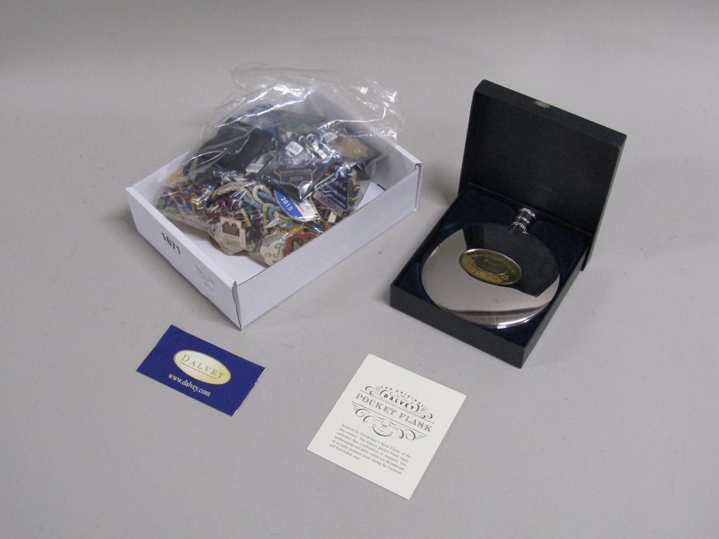 BOX TO INCL RACING BADGES, DALVEY HIP FLASK