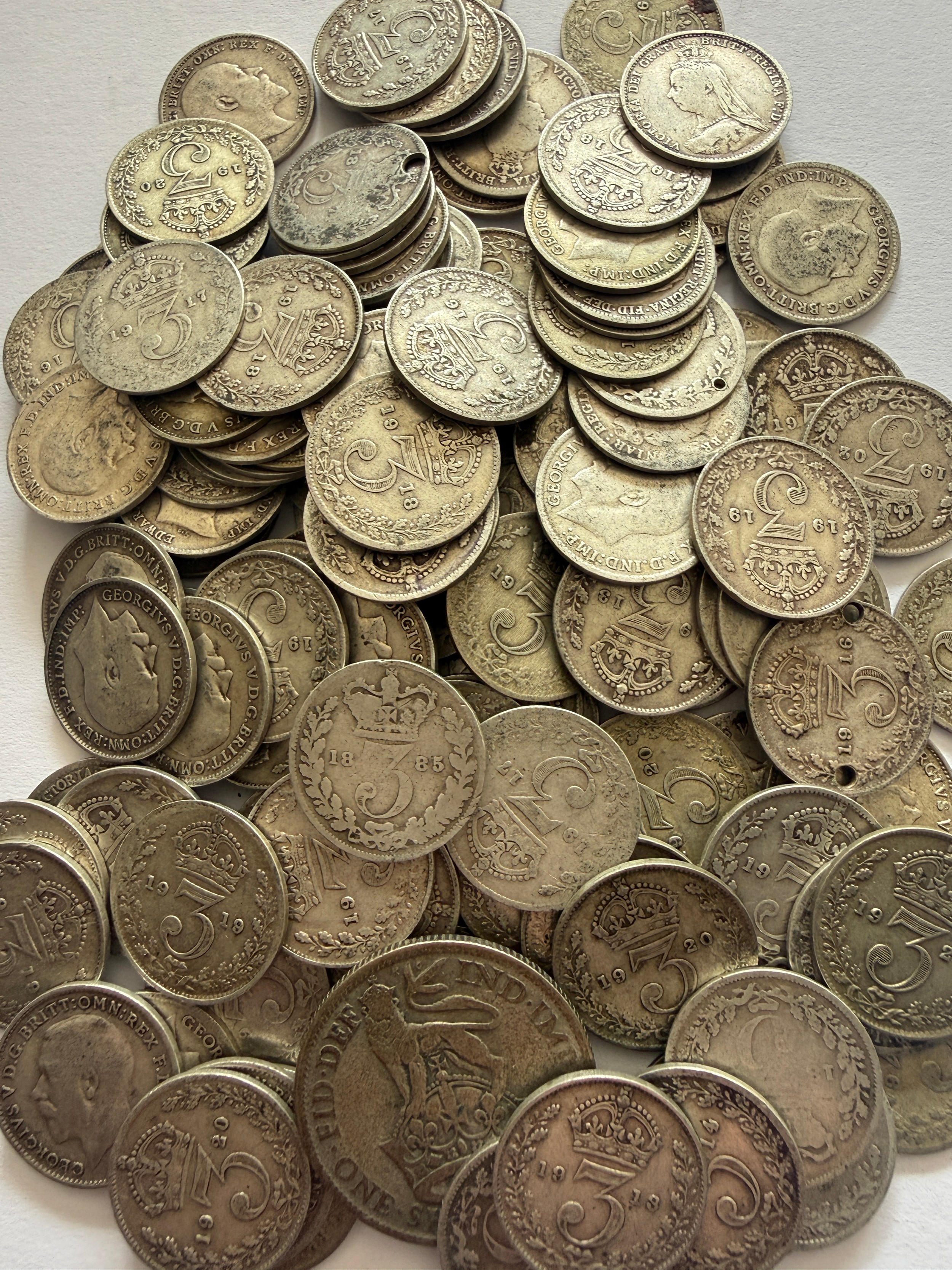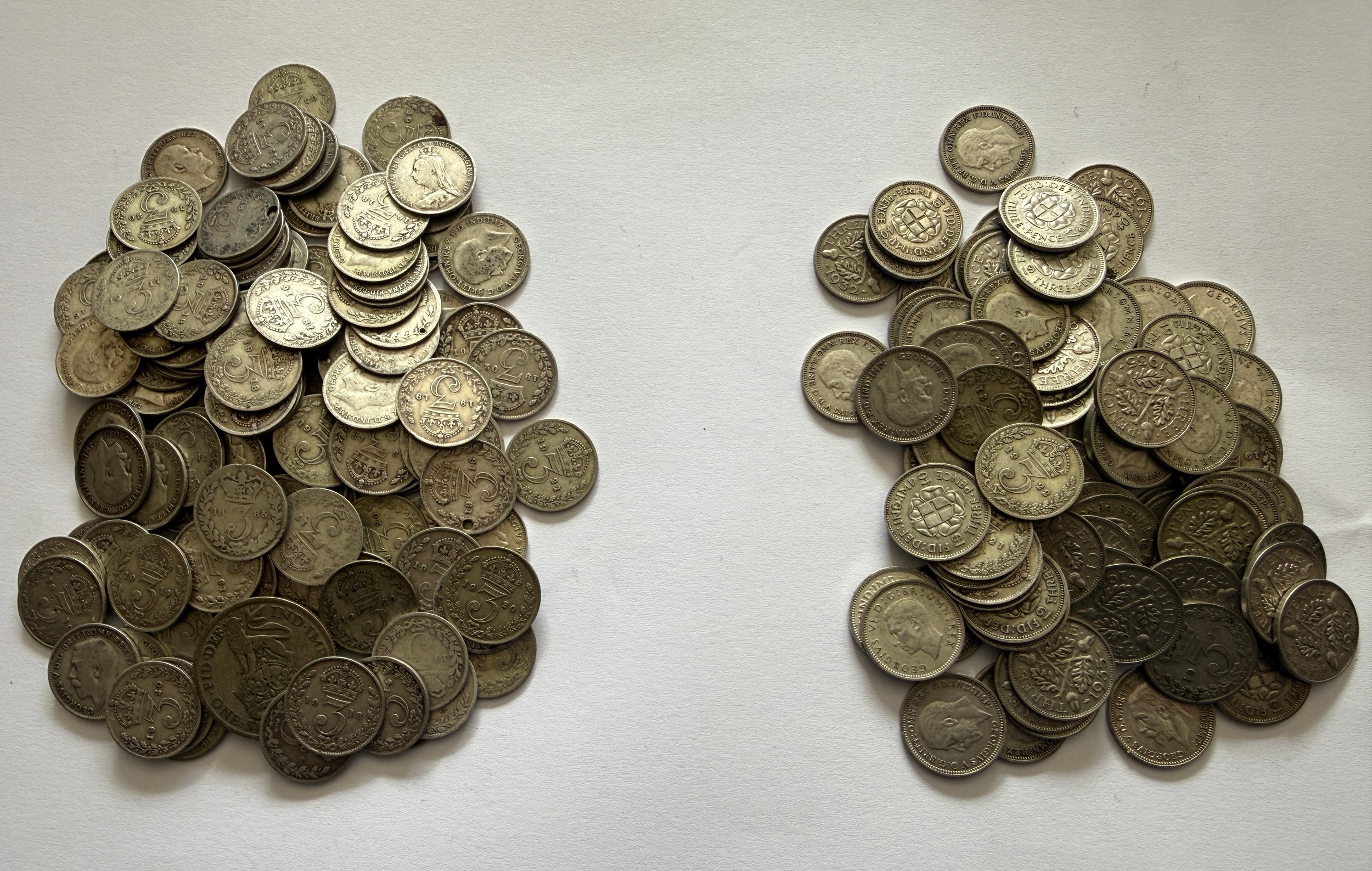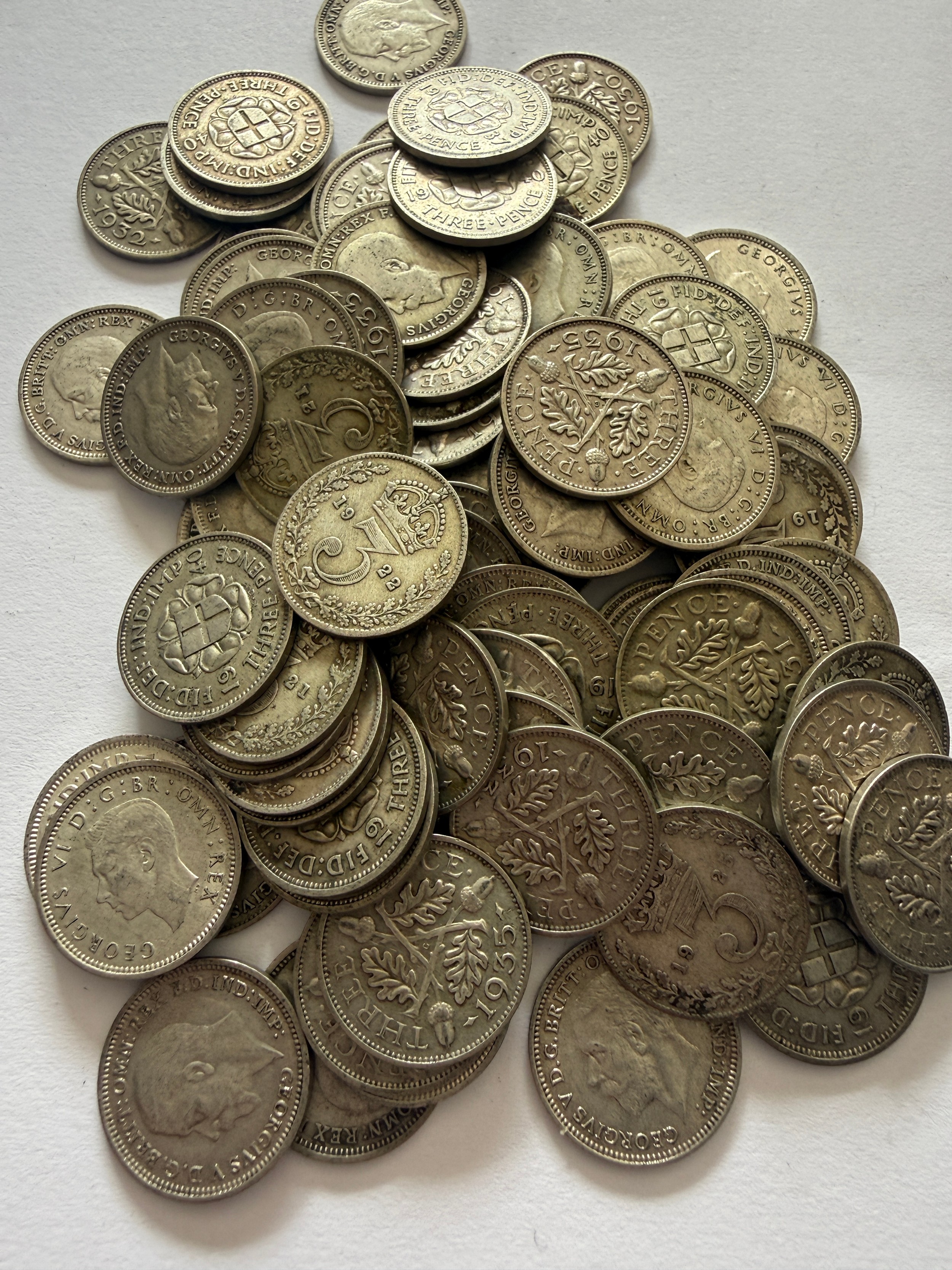 A quantity of pre 1947 3d coins, approximately 301 grams. 185gm pre 1921.