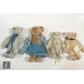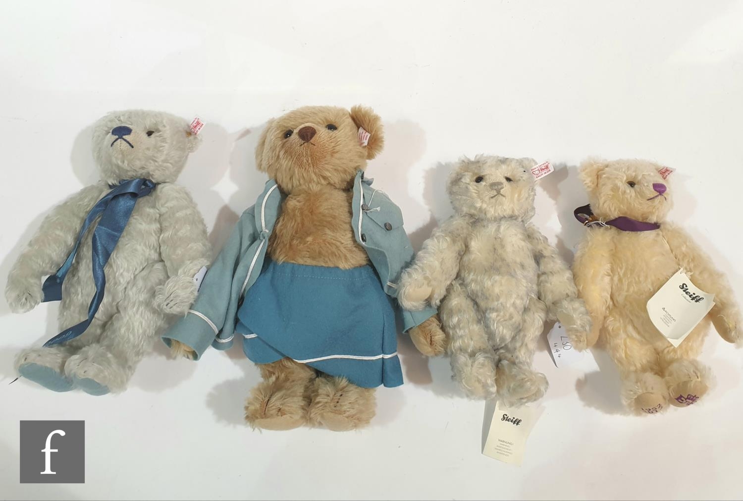 Four Steiff teddy bears, Bagi Club Edition 2006, white tag 420559, beige mohair, based on a Lady Bear sold at Christie's in 2003, wearing two piece blue felt outfit, height 33cm, QVC Exclusive Bear of the Year 2009, white tag 663062, pale blue / grey mohair, Flurrie Swarovski 2008 teddy bear, white tag 681295, blue tipped mohair, with Xilion crystal to ear, and Queen Elizabeth II Diamond Jubilee teddy bear, white tag 663659, vanilla mohair. (4)