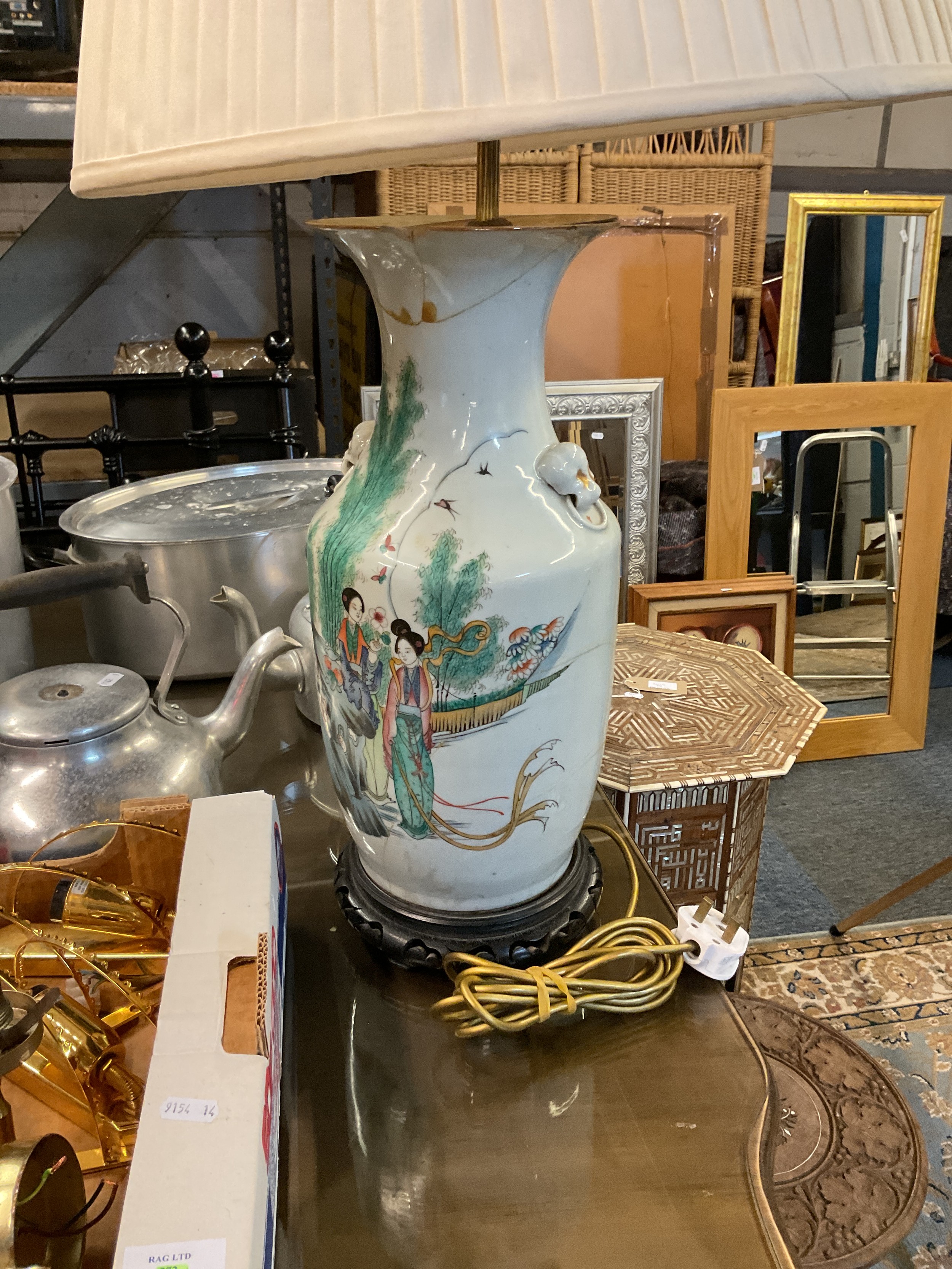 A large Oriental lamp with pictorial panel and quote A/F new silk shade