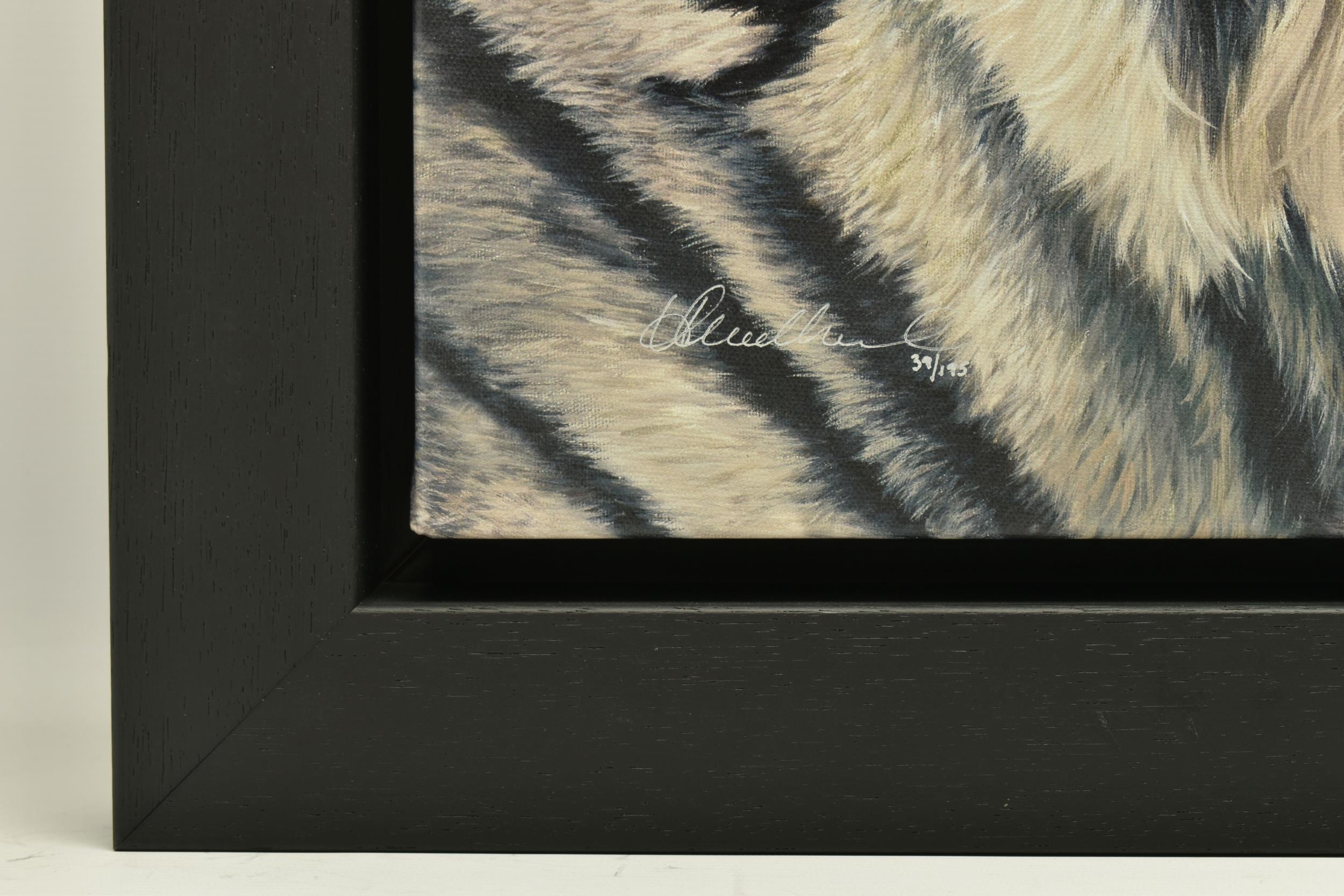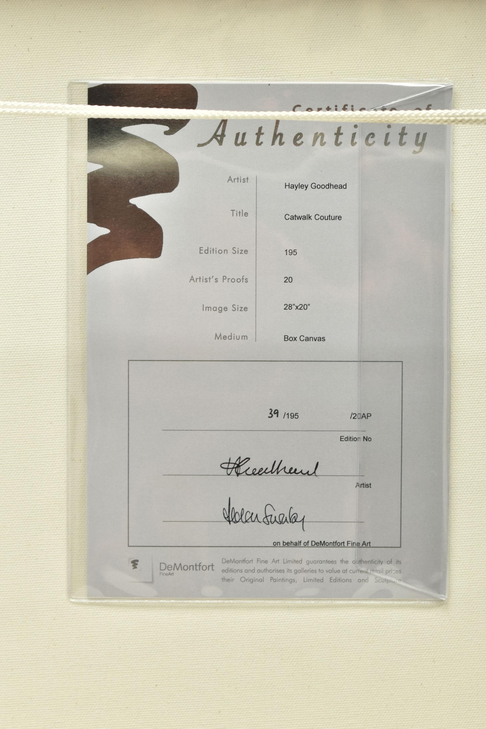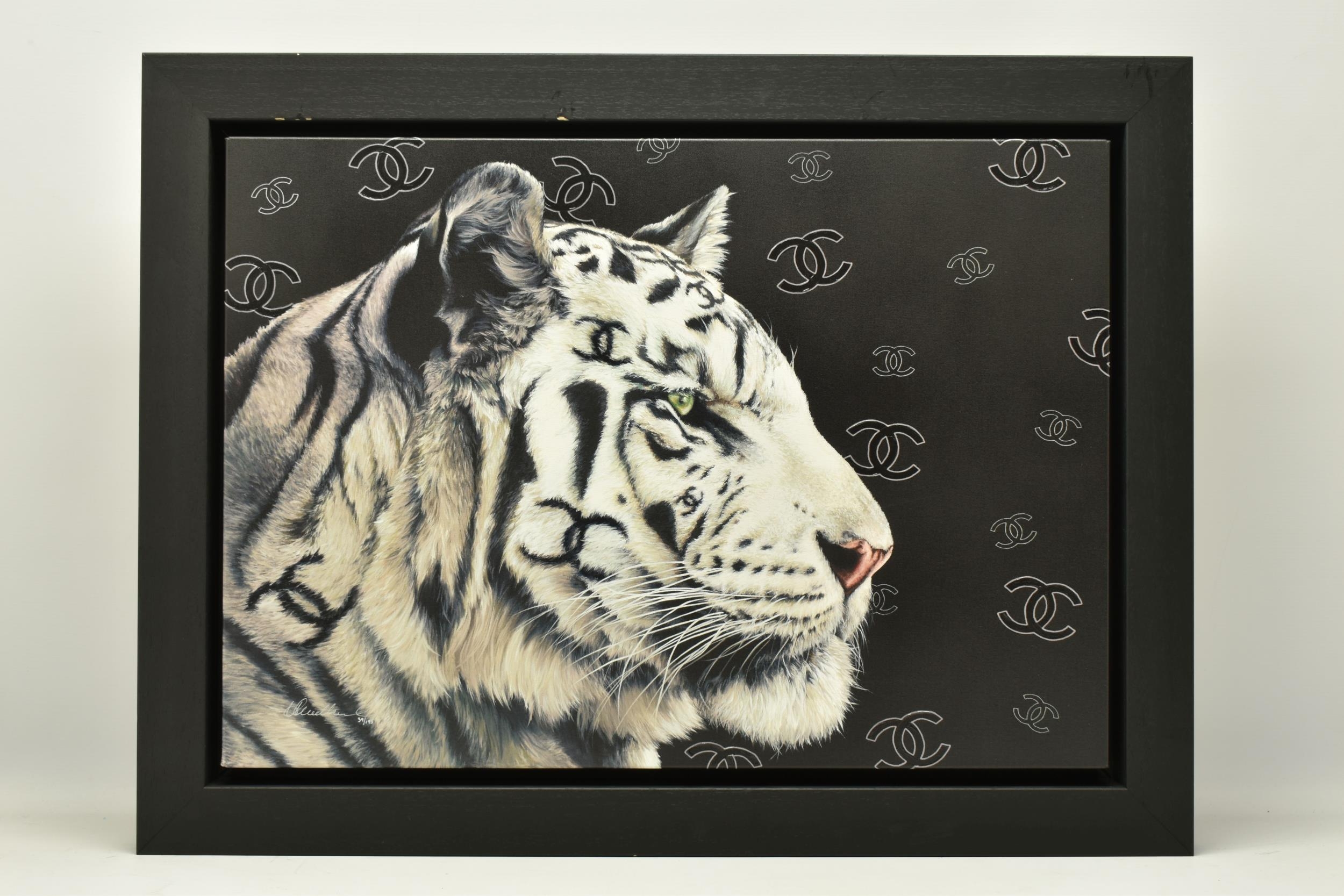 HAYLEY GOODHEAD (BRITISH CONTEMPORARY) 'CATWALK COUTURE', a signed limited edition print on canvas, depicting a portrait of a Tiger, 38/195 with certificate, approximate sizes - image 51cm x 71cm Frame 65cm x 85cm, Condition Report: frame chipped (artist resale rights apply)
