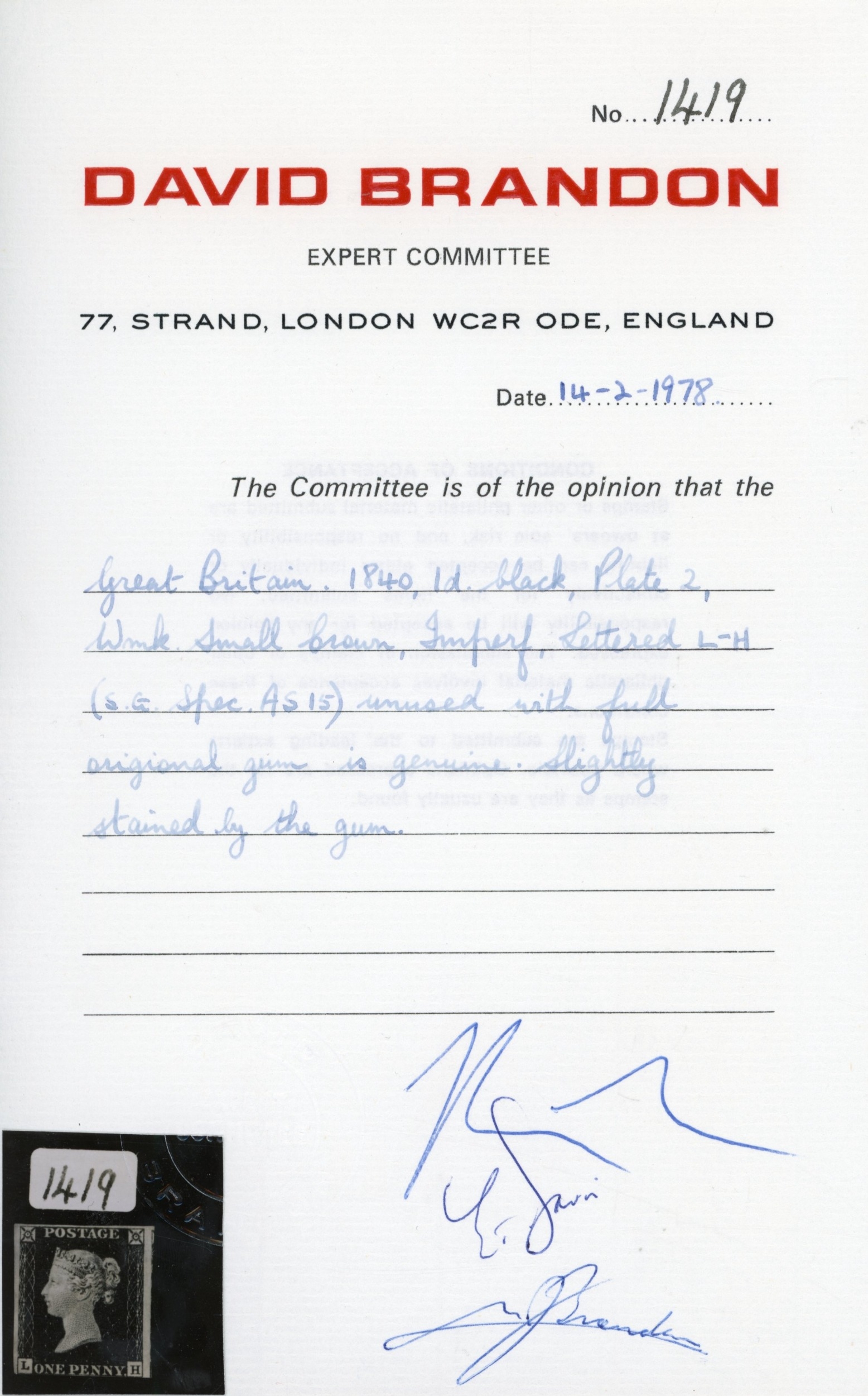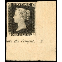 1840 1d black, Pl. 2 (LH), with 3 good to large margins, just touching at foot and showing trace of adjacent stamp at right, mint, large part o.g., slightly toned, still an attractive and desirable example. Brandon cert (1978), SG 2, £7,500