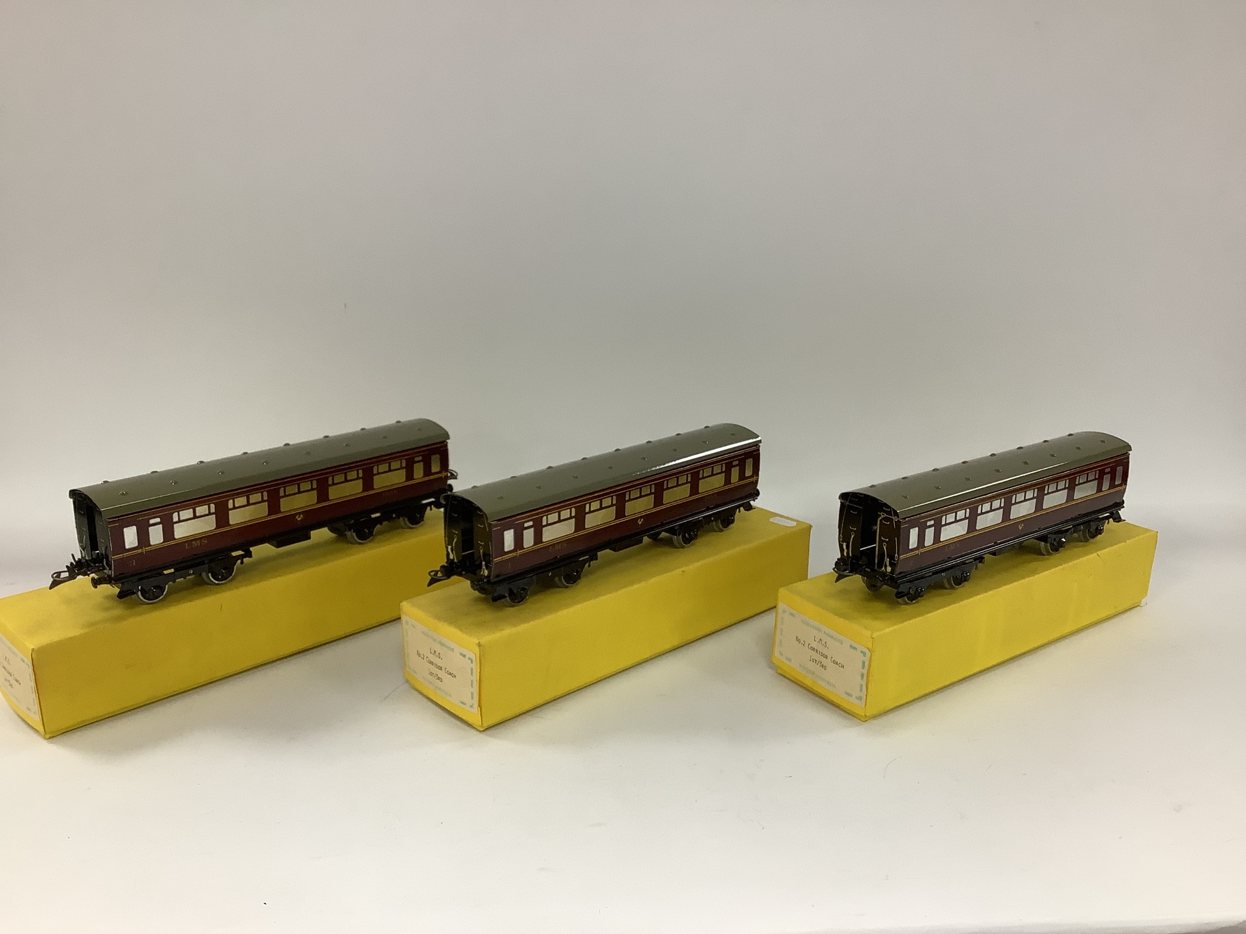 Three 'O' Gauge Middleton Products of Australia Eight Wheel LMS Coaches, in the style of Hornby 'O' Gauge, very good. boxed.