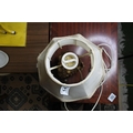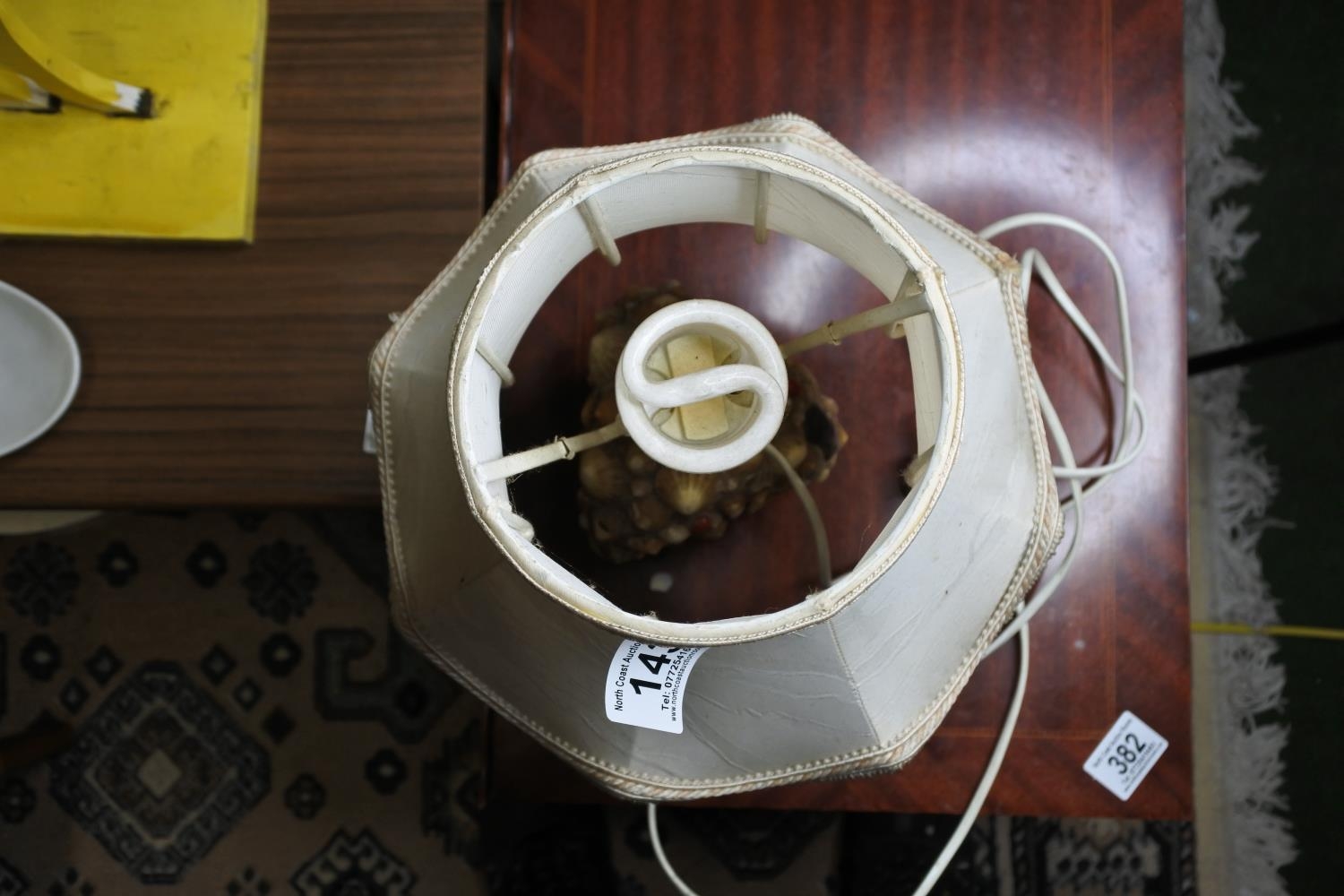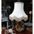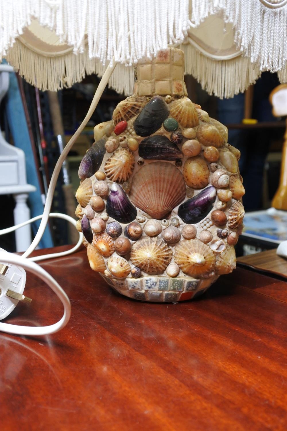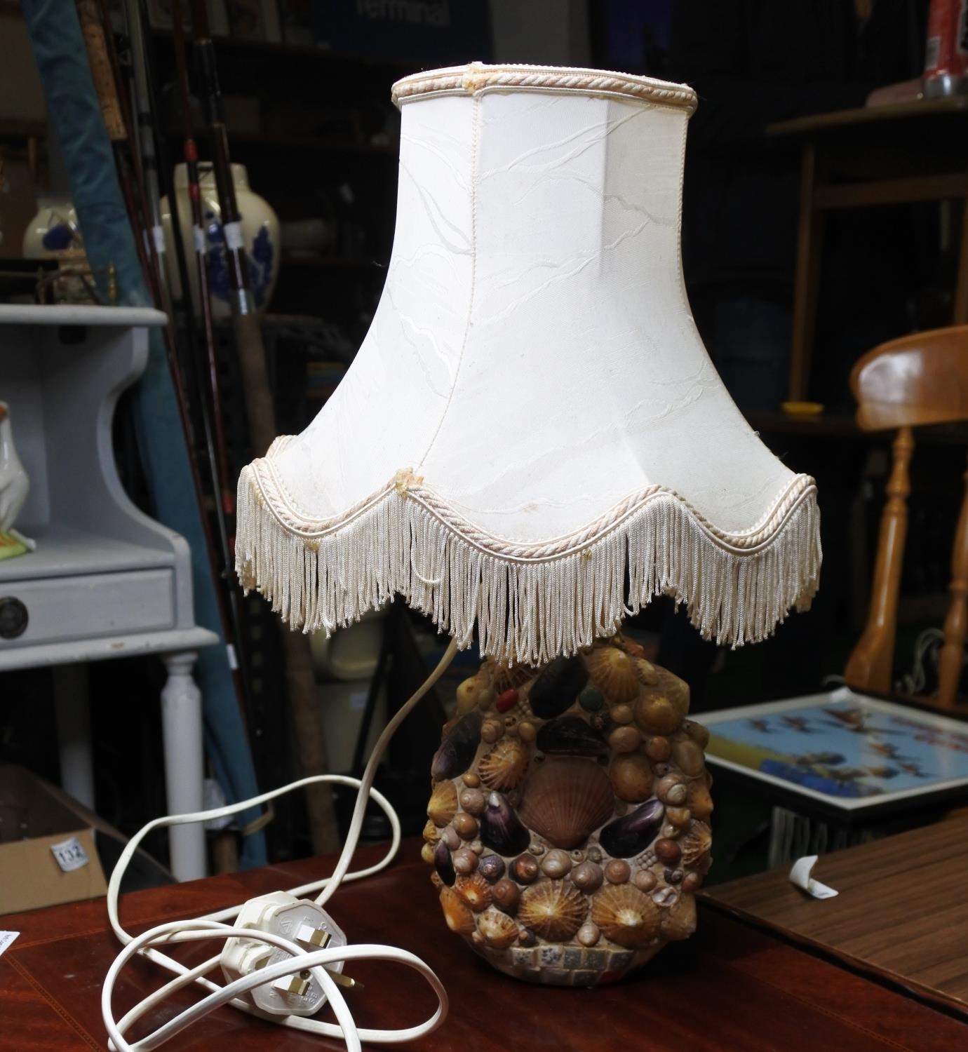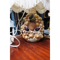 A Dimple's whisky bottle which has been covered in shells and converted into a table lamp.