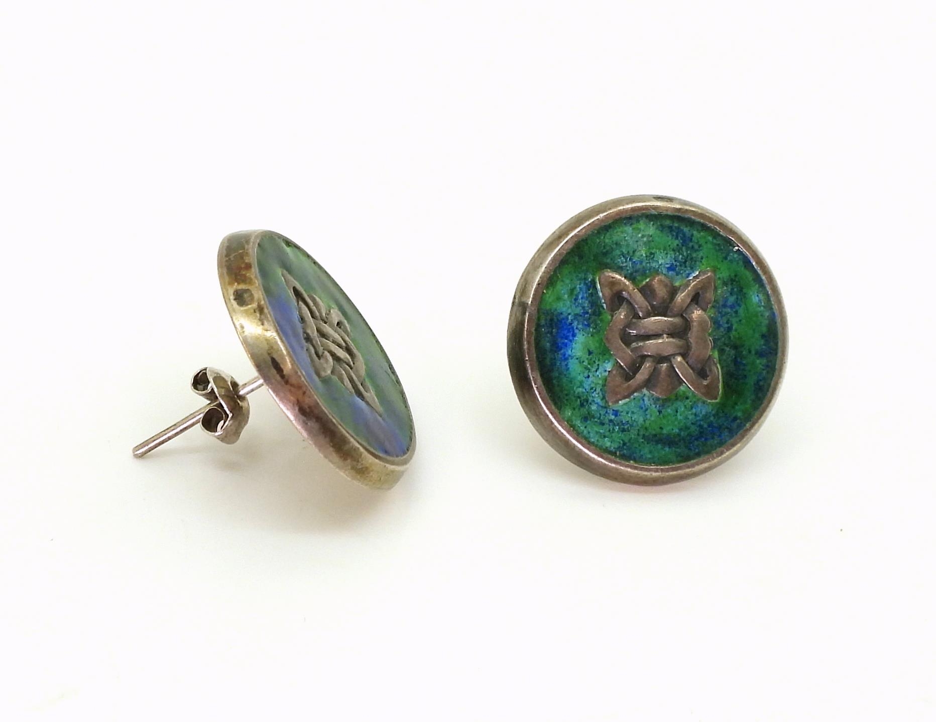 A pair of silver and enamel Cymric earrings, with Liberty & Co Ltd four leaf clover makers mark, with Birmingham hallmarks for 1902-3, further stamped Cymric Silver, diameter 2.2cm, weight 8.5cm