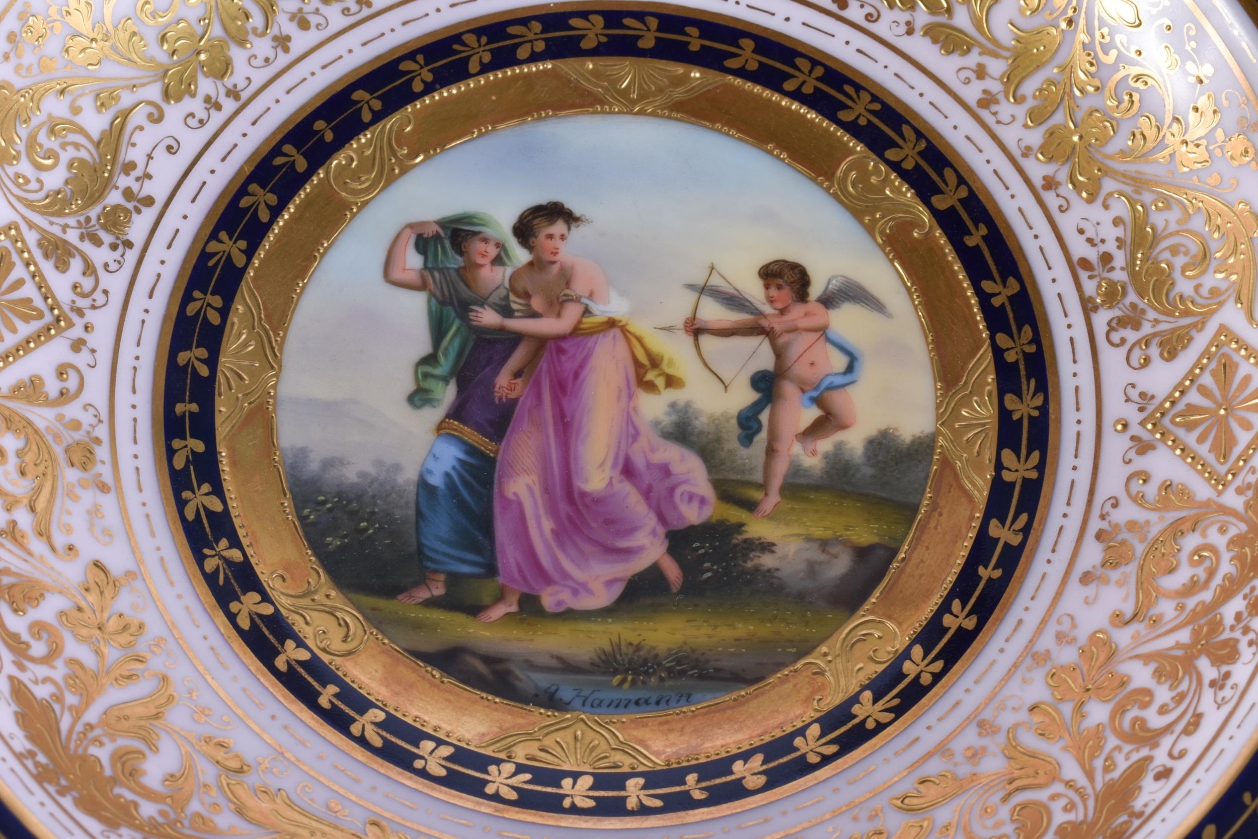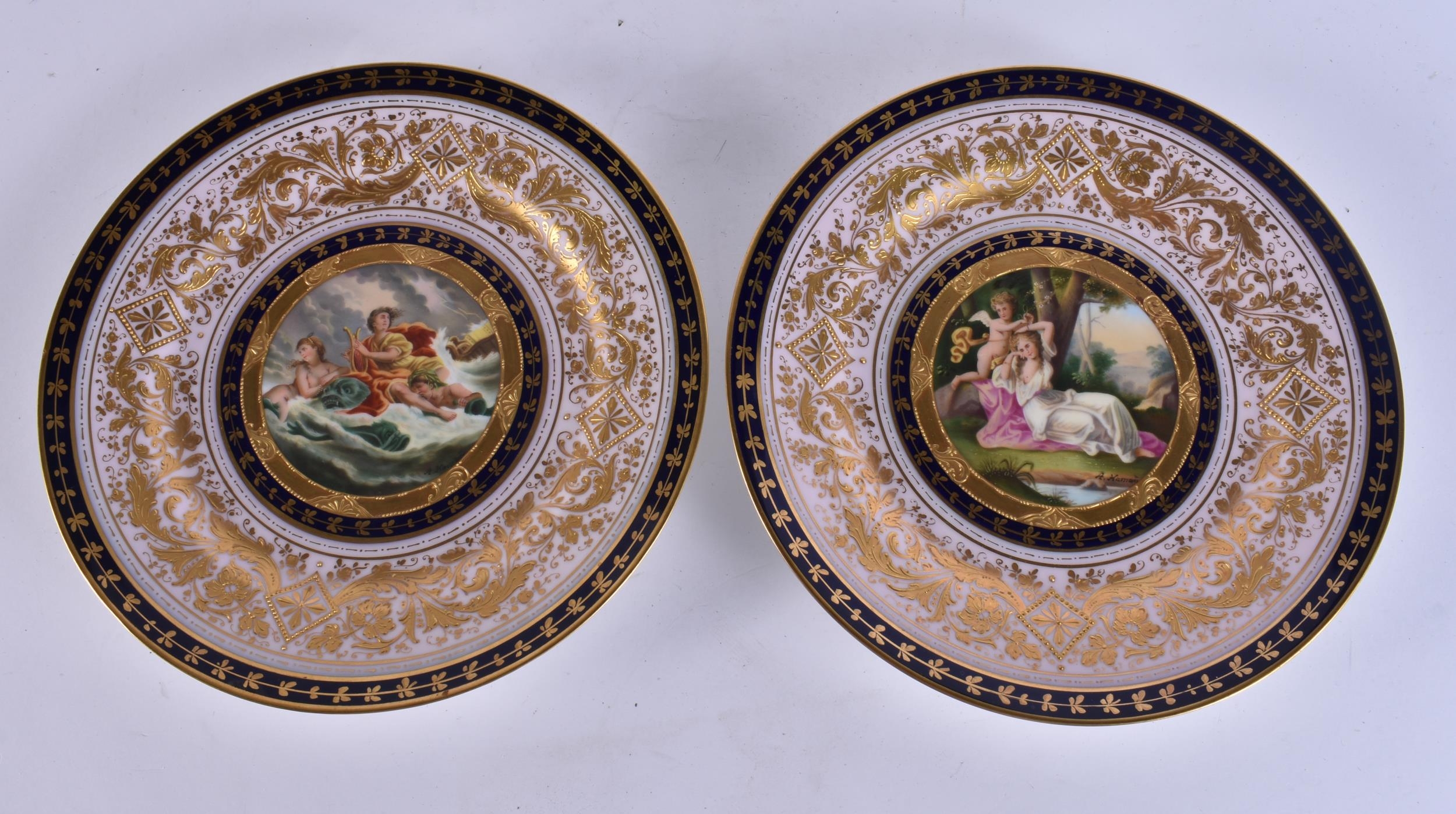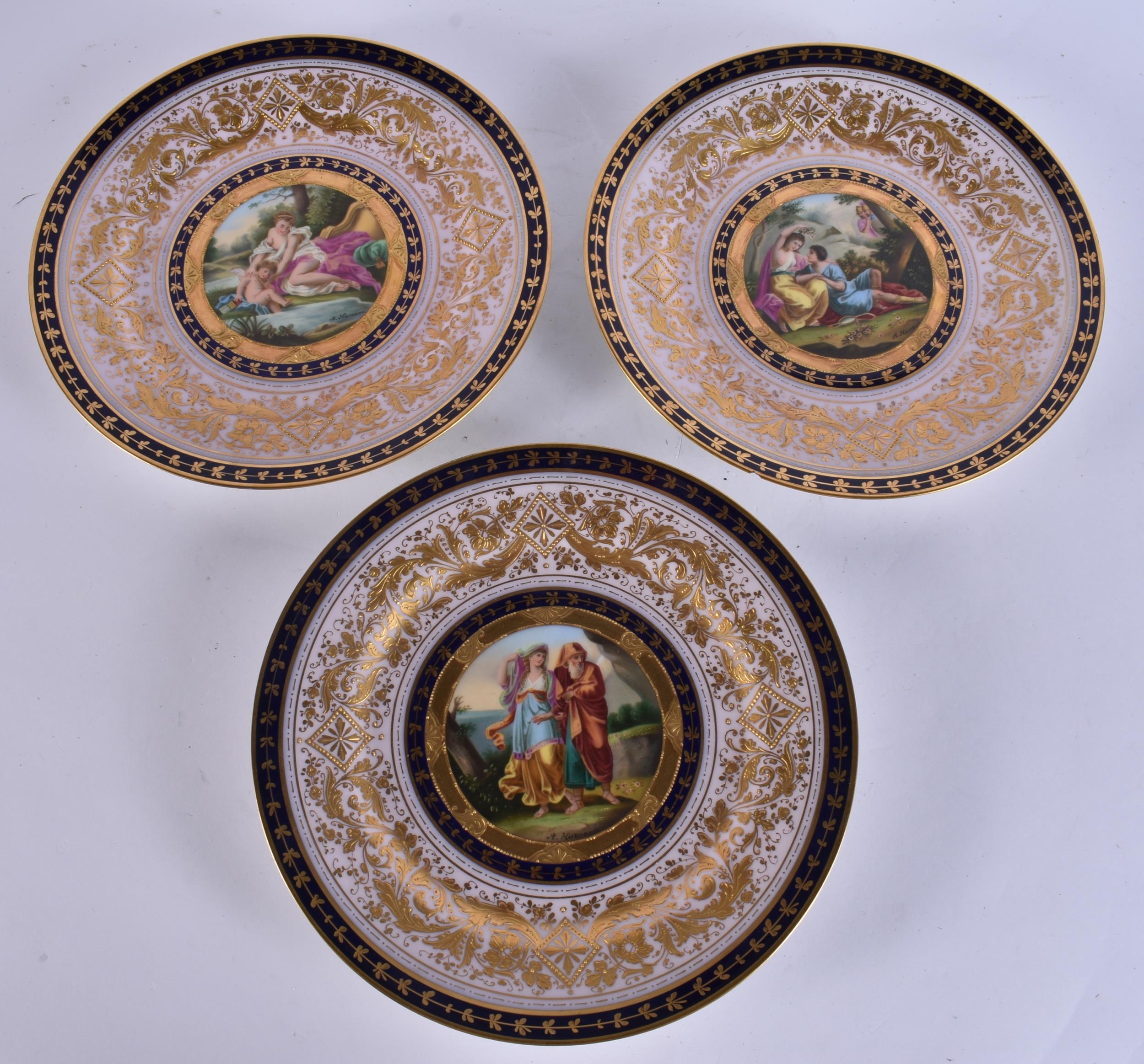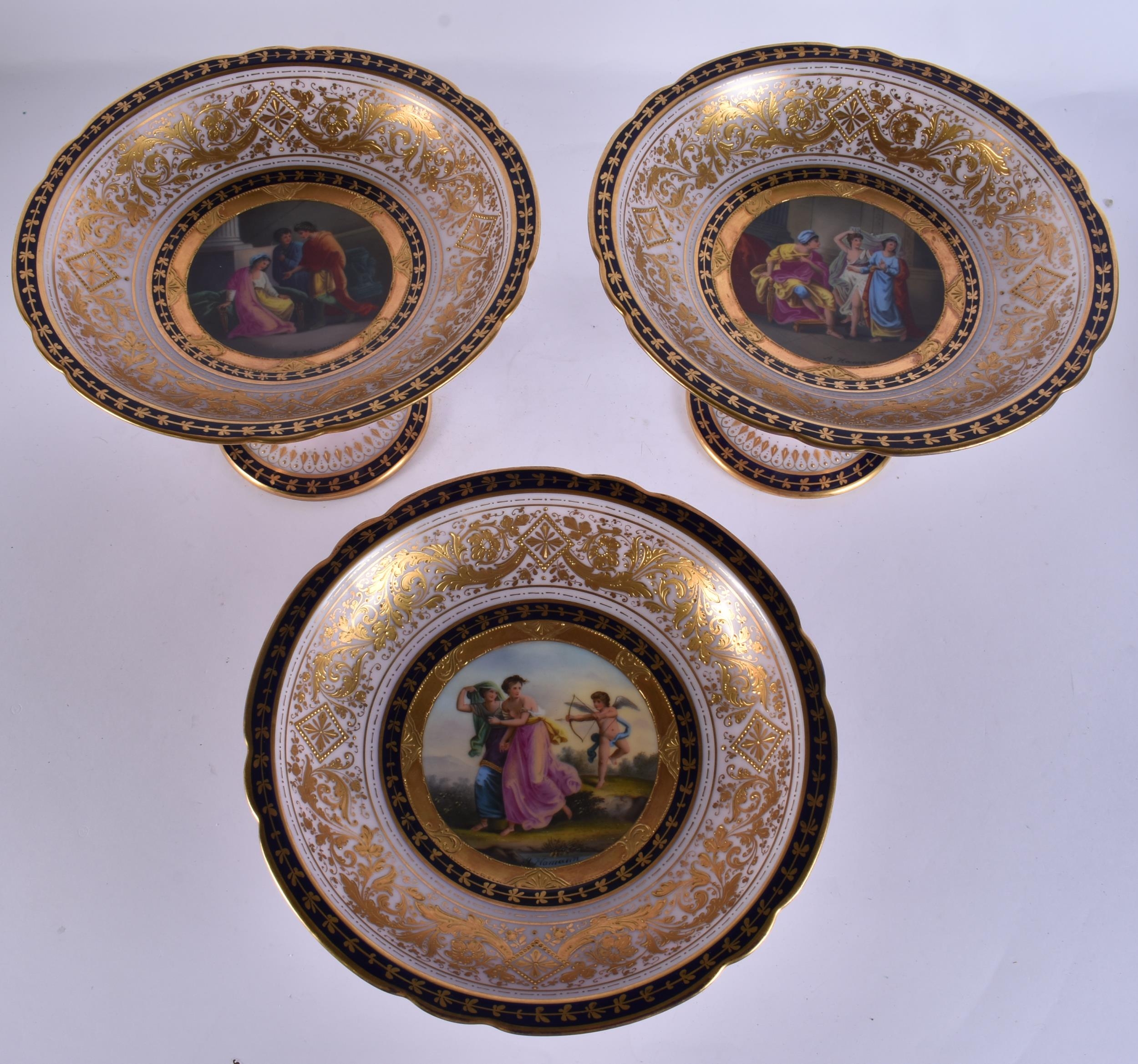 A SUITE OF EARLY 20TH CENTURY AUSTRIAN VIENNA PORCELAIN DESSERT WARES painted with figures in various pursuits. Largest 22 cm x 15 cm. (8)