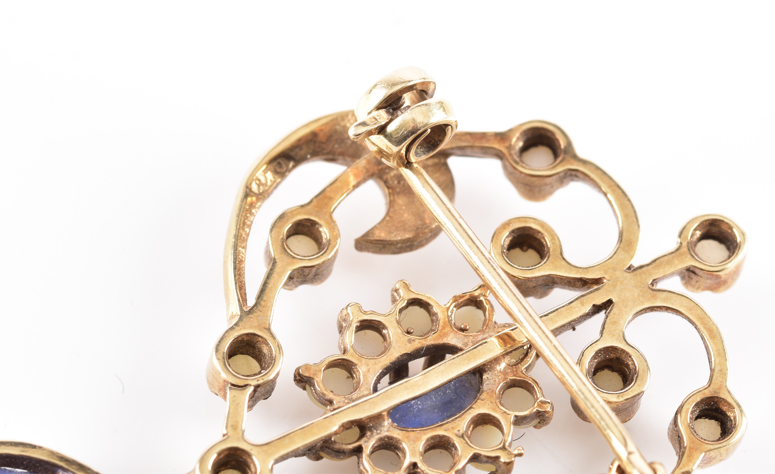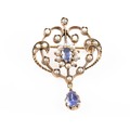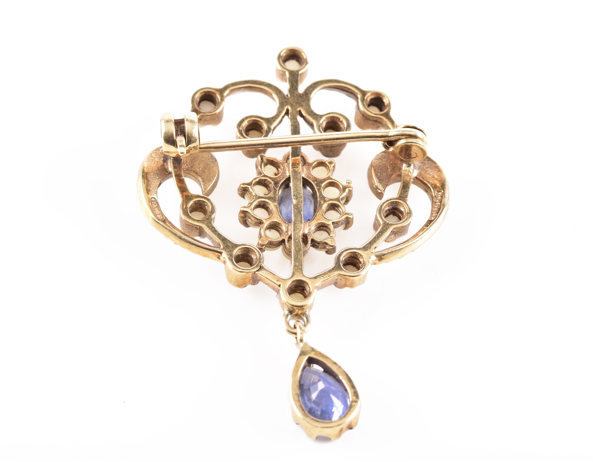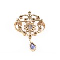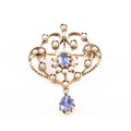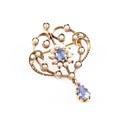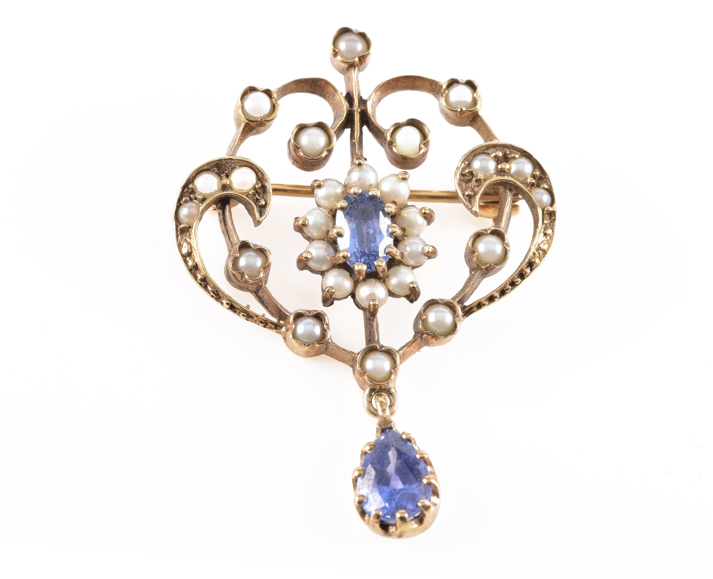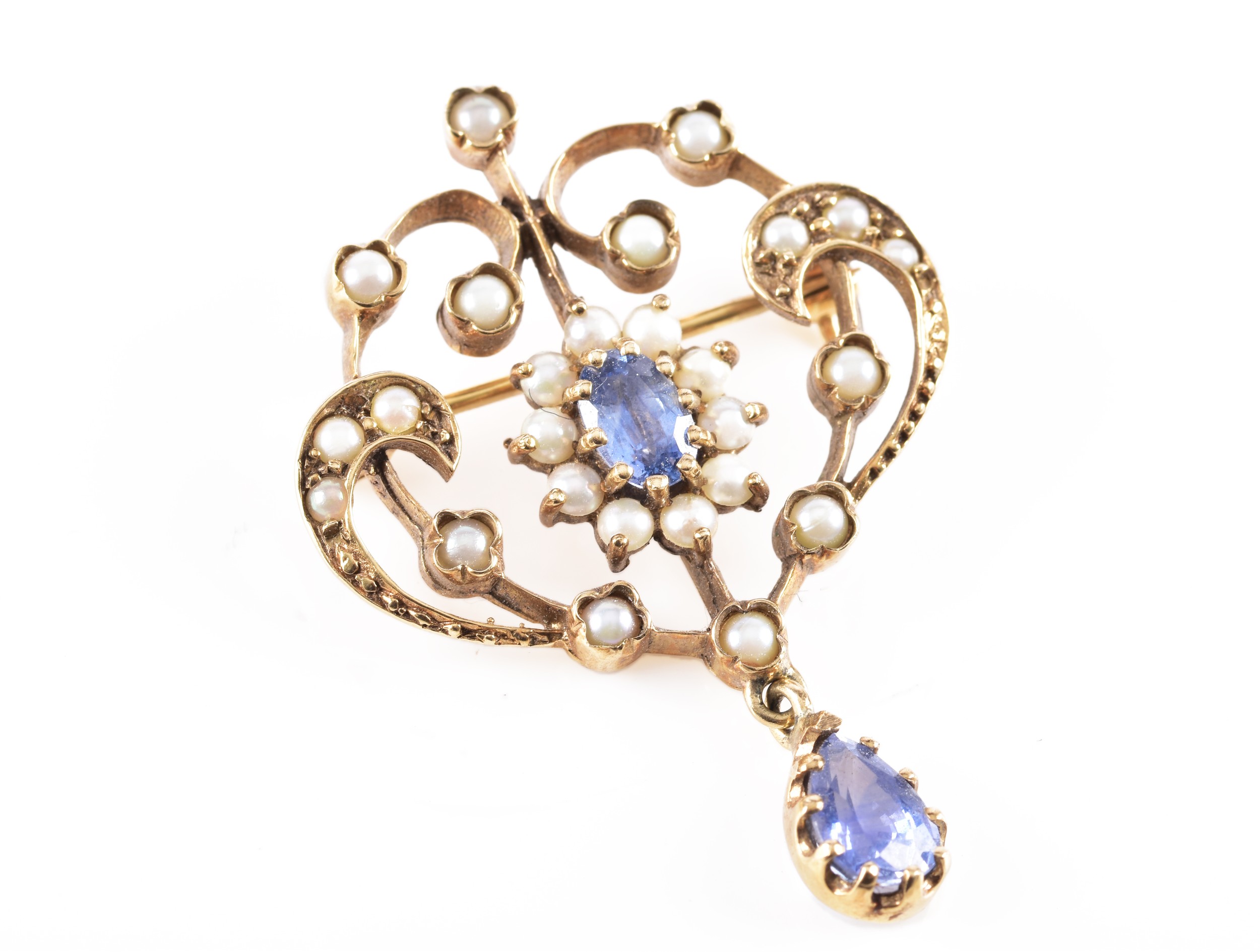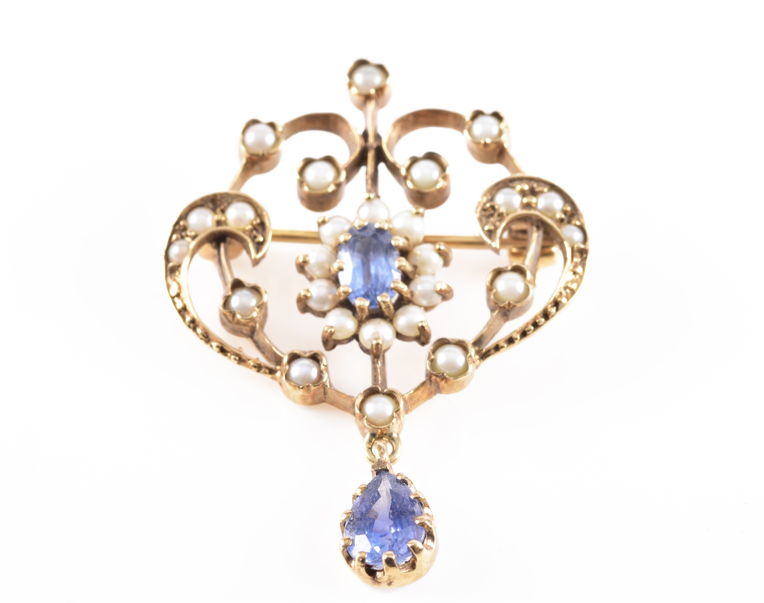 A 9ct yellow gold Art Nouveau style seed pearl and blue stone brooch, featuring intricate gold work with foliate motifs, suspended with an articulated drop shape blue stone, fitted with secure pin, 3.8 cm long.