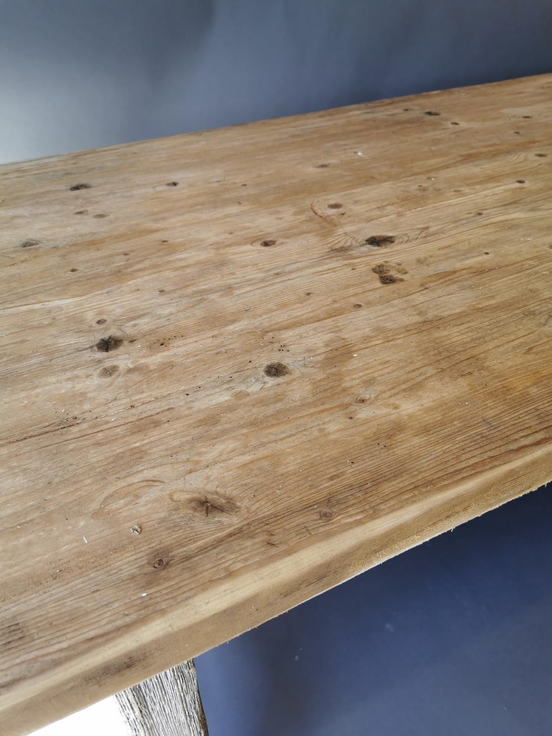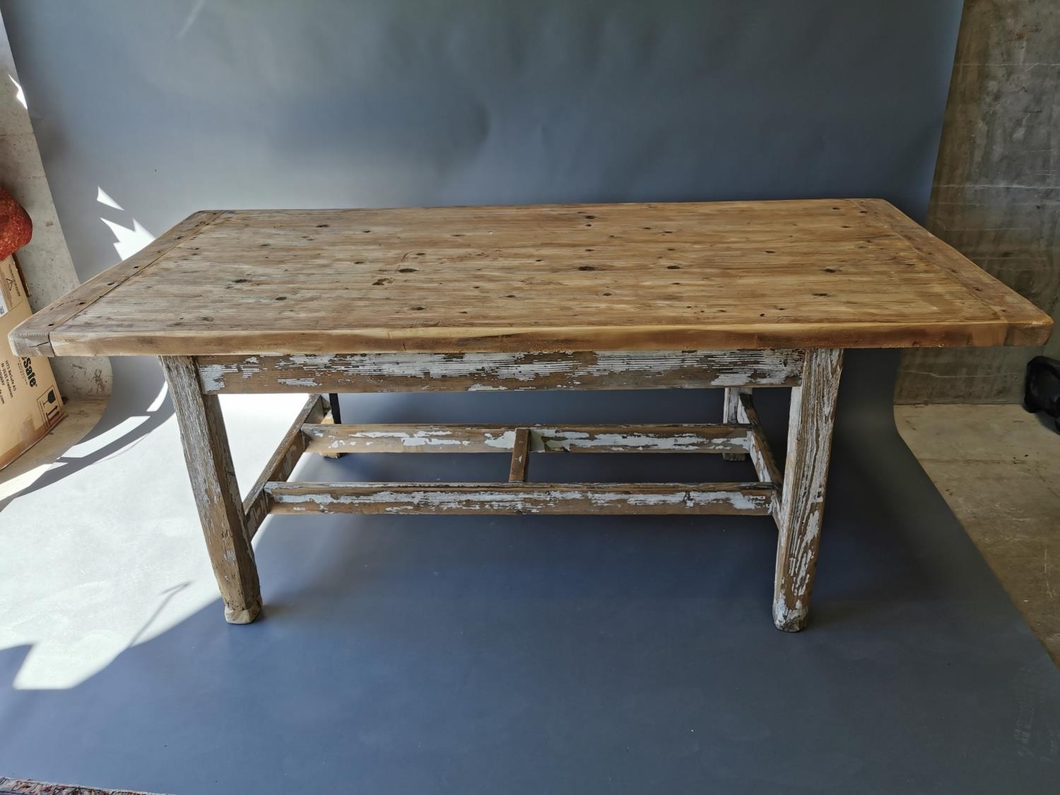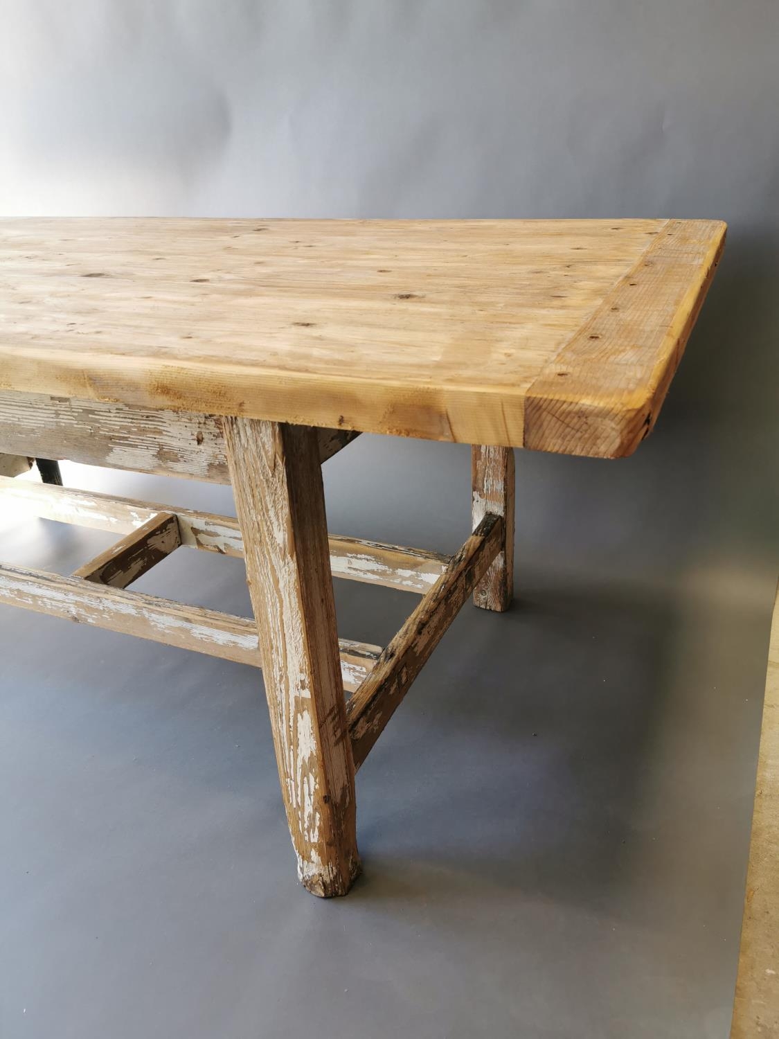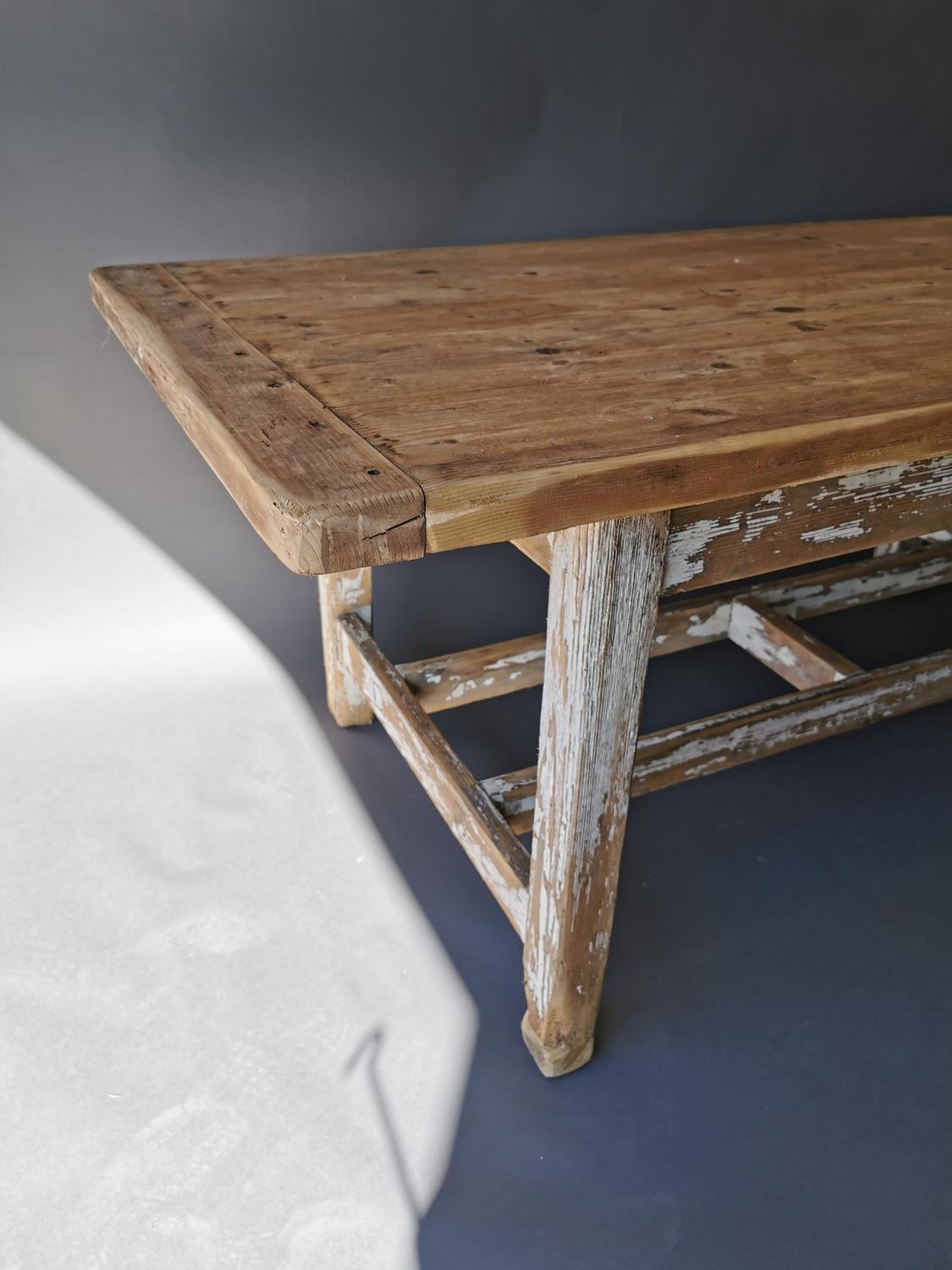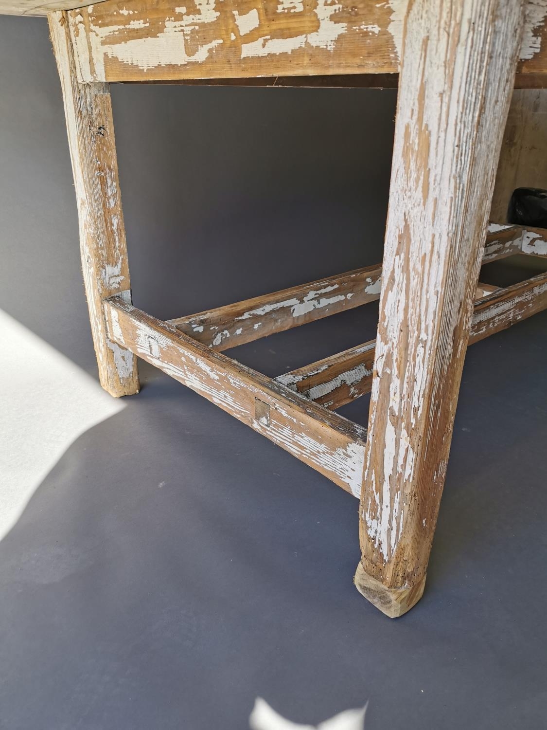 19th C. painted pine kitchen table on square legs and double stretcher {75 cm H x 188 cm L x 95 cm W}.