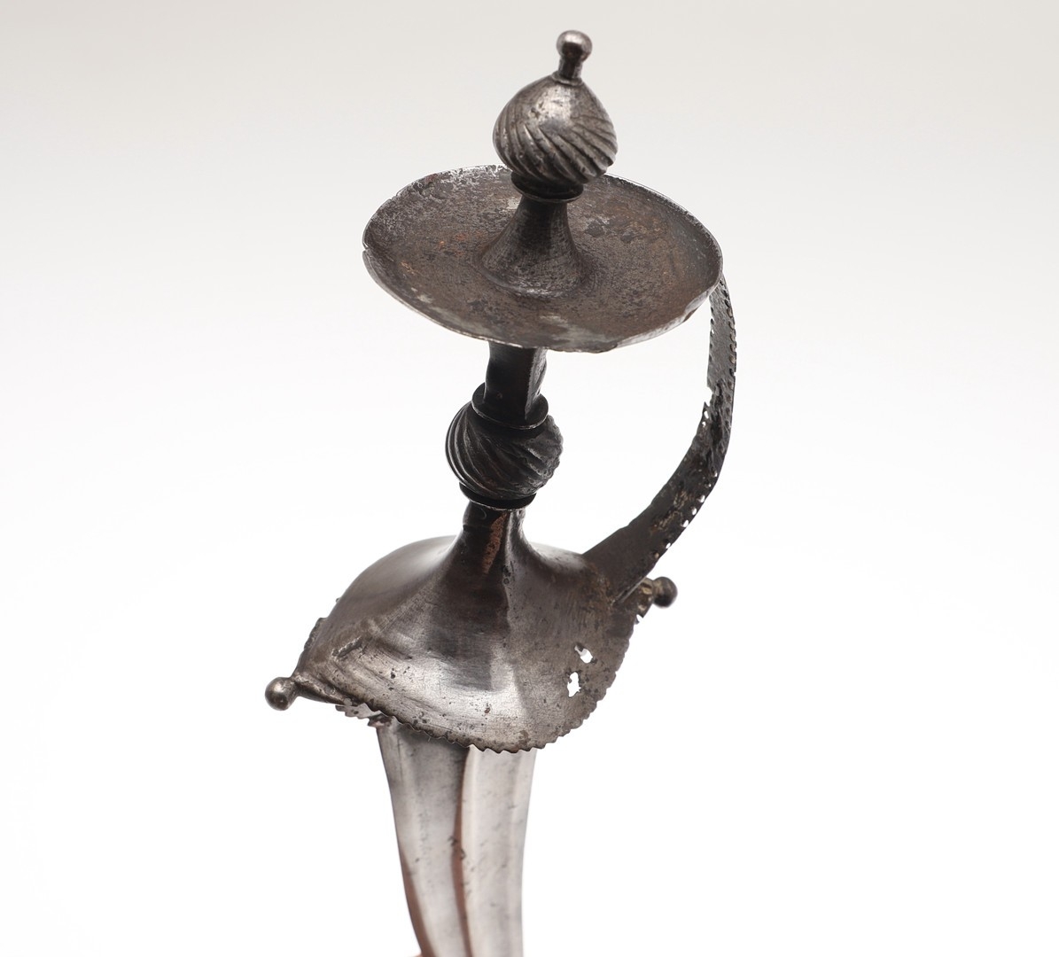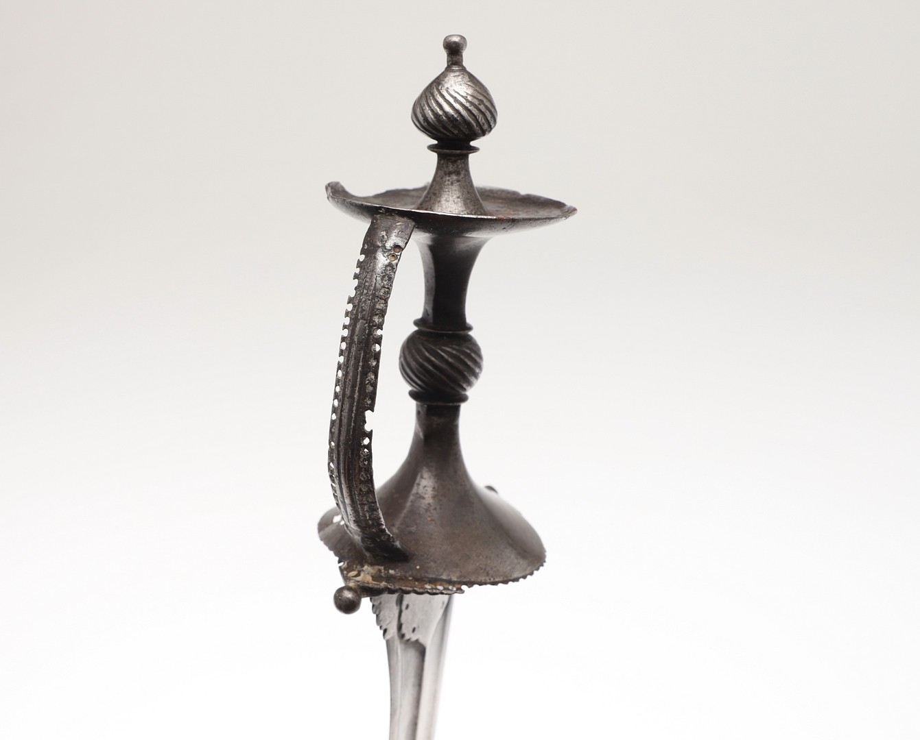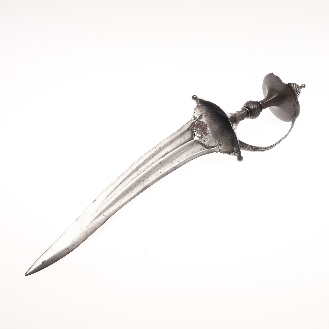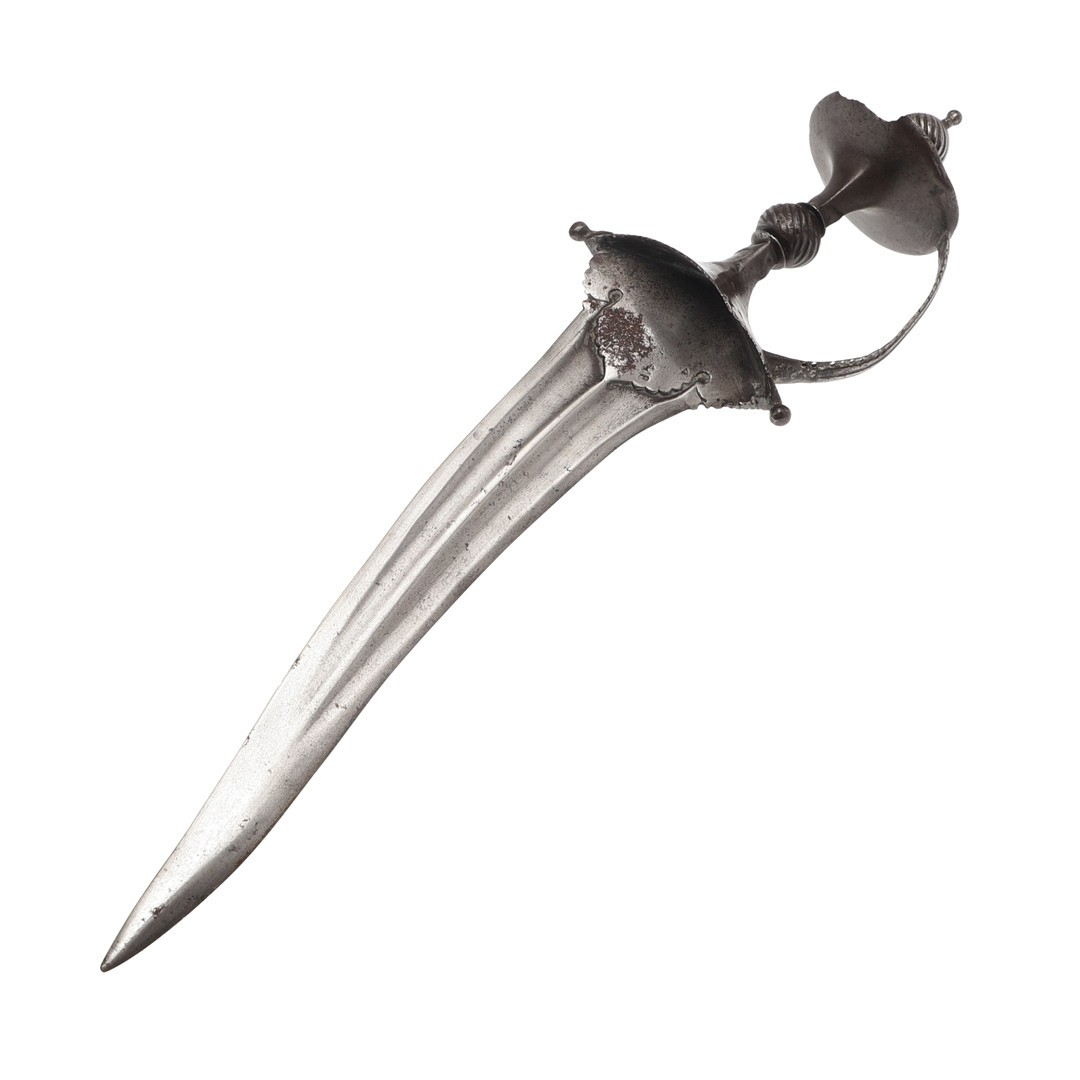A LATE 17TH CENTURY SOUTH INDIAN CHILANUM DAGGER. The 28 cm pointed gently curved blade with a central spine and twin fullers. The blade mounted on a decorative support with conical guard and narrow grip with a central knop, and similar conical pommel and knop. The grip with a slender pierced knuckle guard. 42 cm. "Robert Elgood in his work on Hindu Arms describes this weapon as being in use in Vijayanagara in the 16th and early 17th centuries, it is also associated with the Deccan region.".