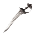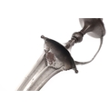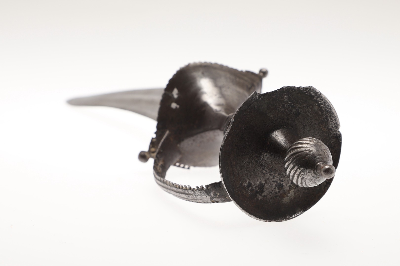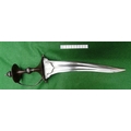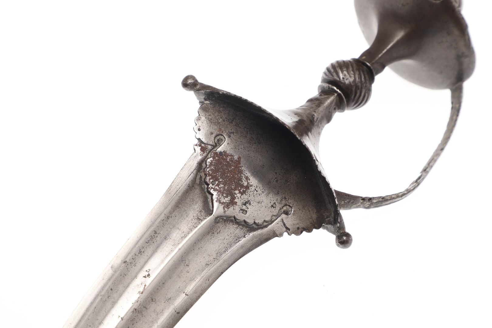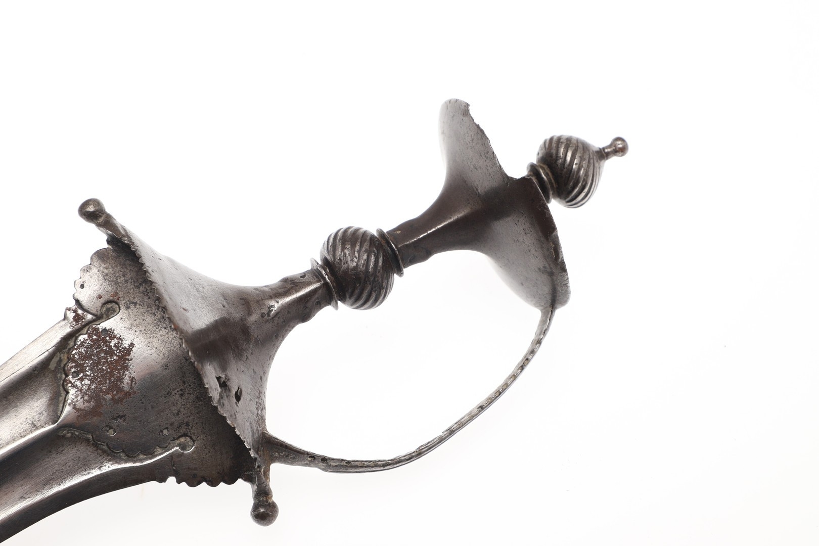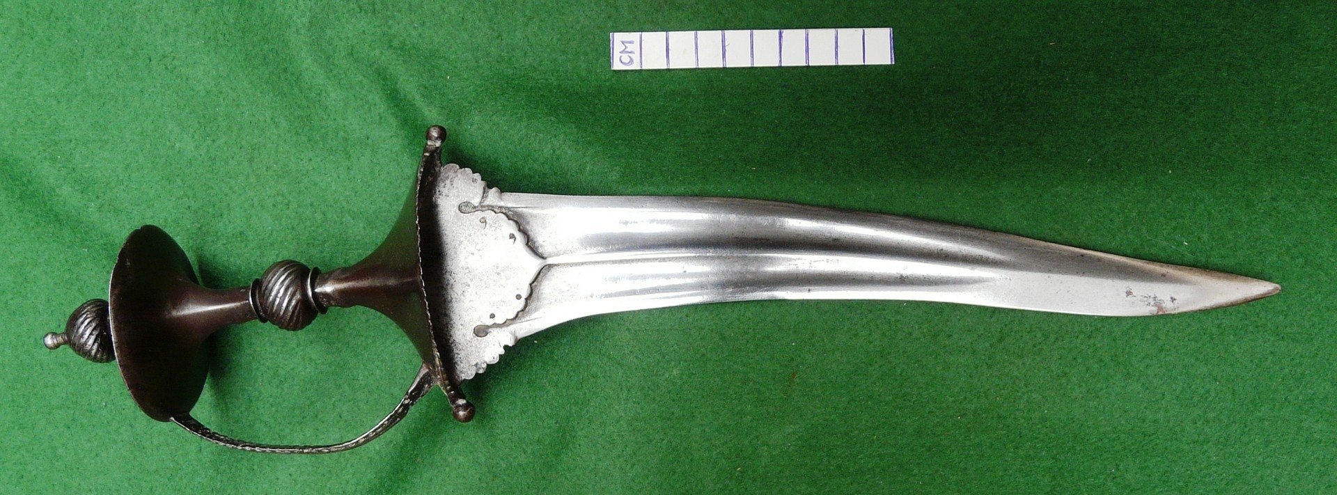 A LATE 17TH CENTURY SOUTH INDIAN CHILANUM DAGGER. The 28 cm pointed gently curved blade with a central spine and twin fullers. The blade mounted on a decorative support with conical guard and narrow grip with a central knop, and similar conical pommel and knop. The grip with a slender pierced knuckle guard. 42 cm. "Robert Elgood in his work on Hindu Arms describes this weapon as being in use in Vijayanagara in the 16th and early 17th centuries, it is also associated with the Deccan region.".