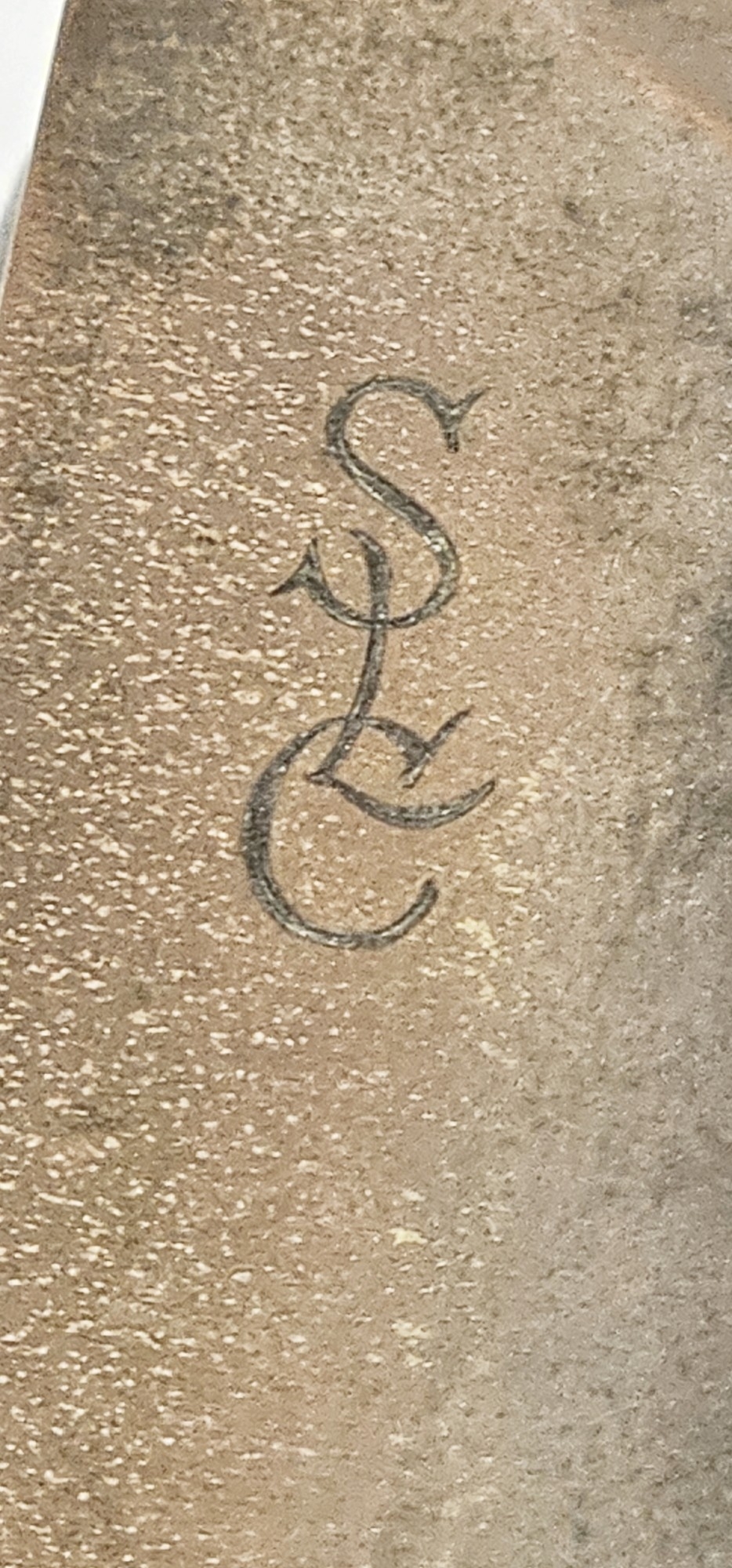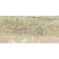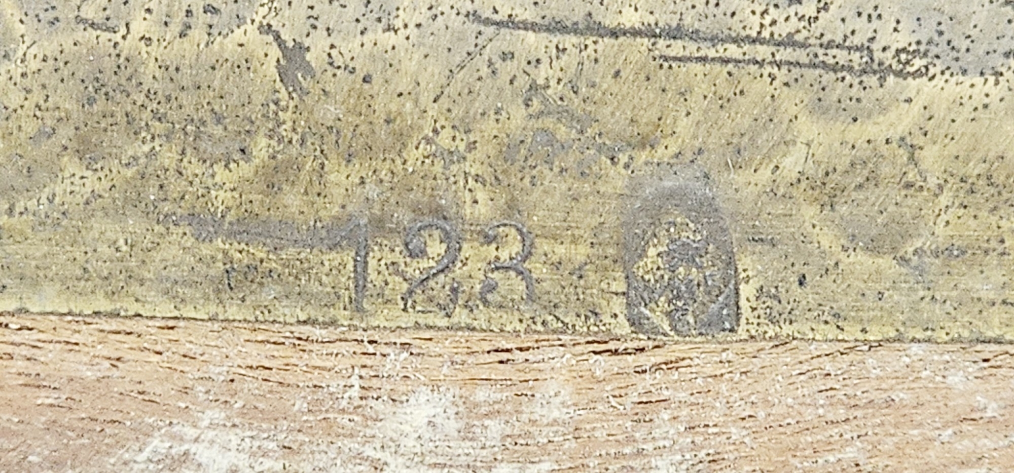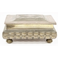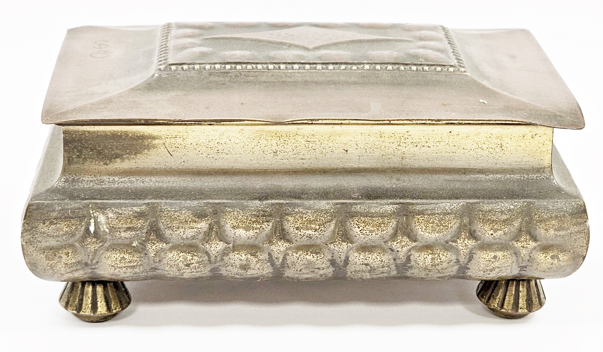 WMF Art Deco brass and wooden mounted cigarette box, with lozenge shaped ornament to cover, engraved with initials SLC and the box with pebble texture on splayed feet, stamped with the WMF cypher and ostrich mark, pattern no.123