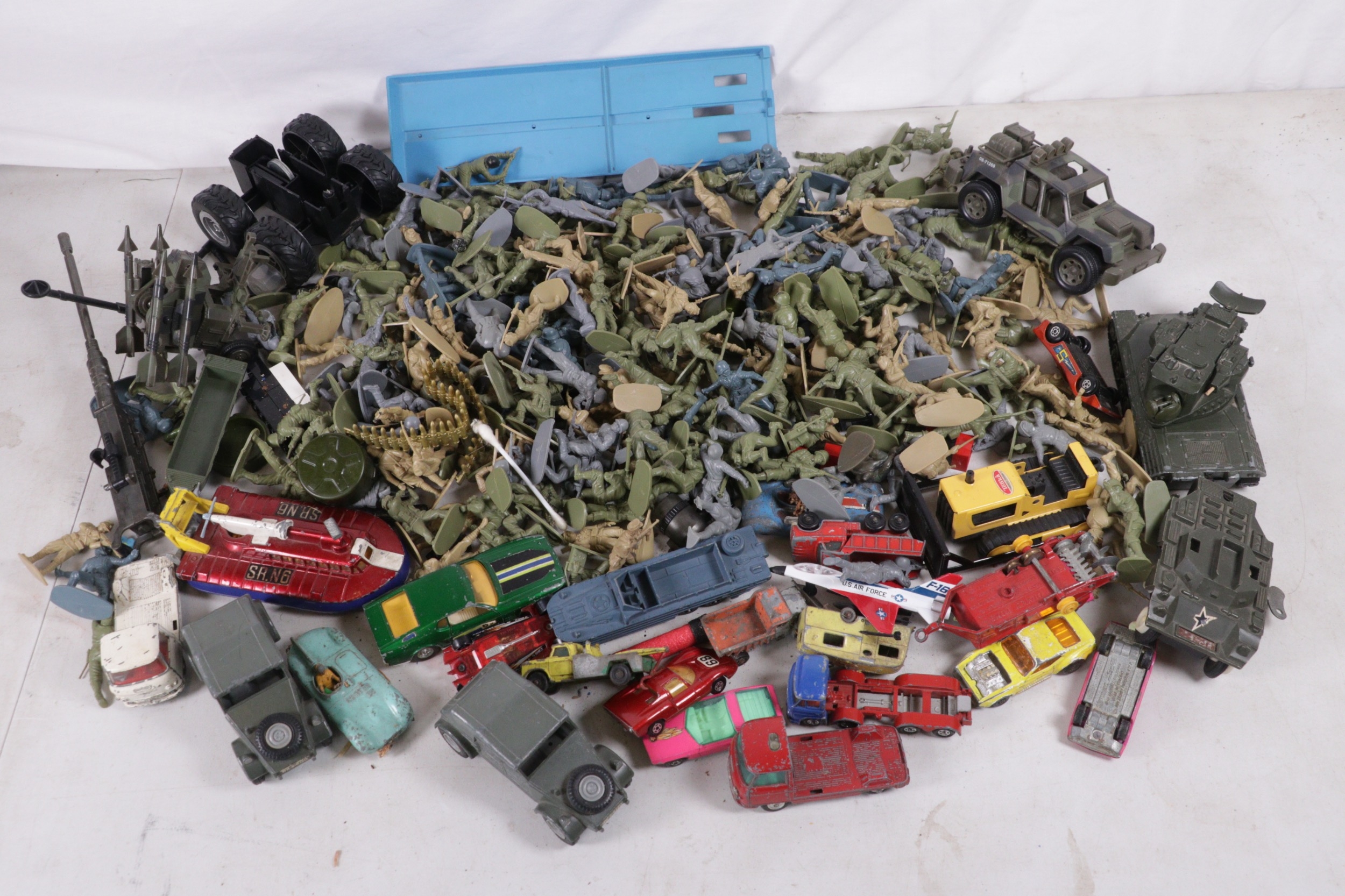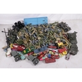 Selection of assorted vintage dievcast vehicles, Dinky military etc, plastic soldiers etc.