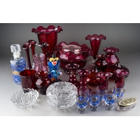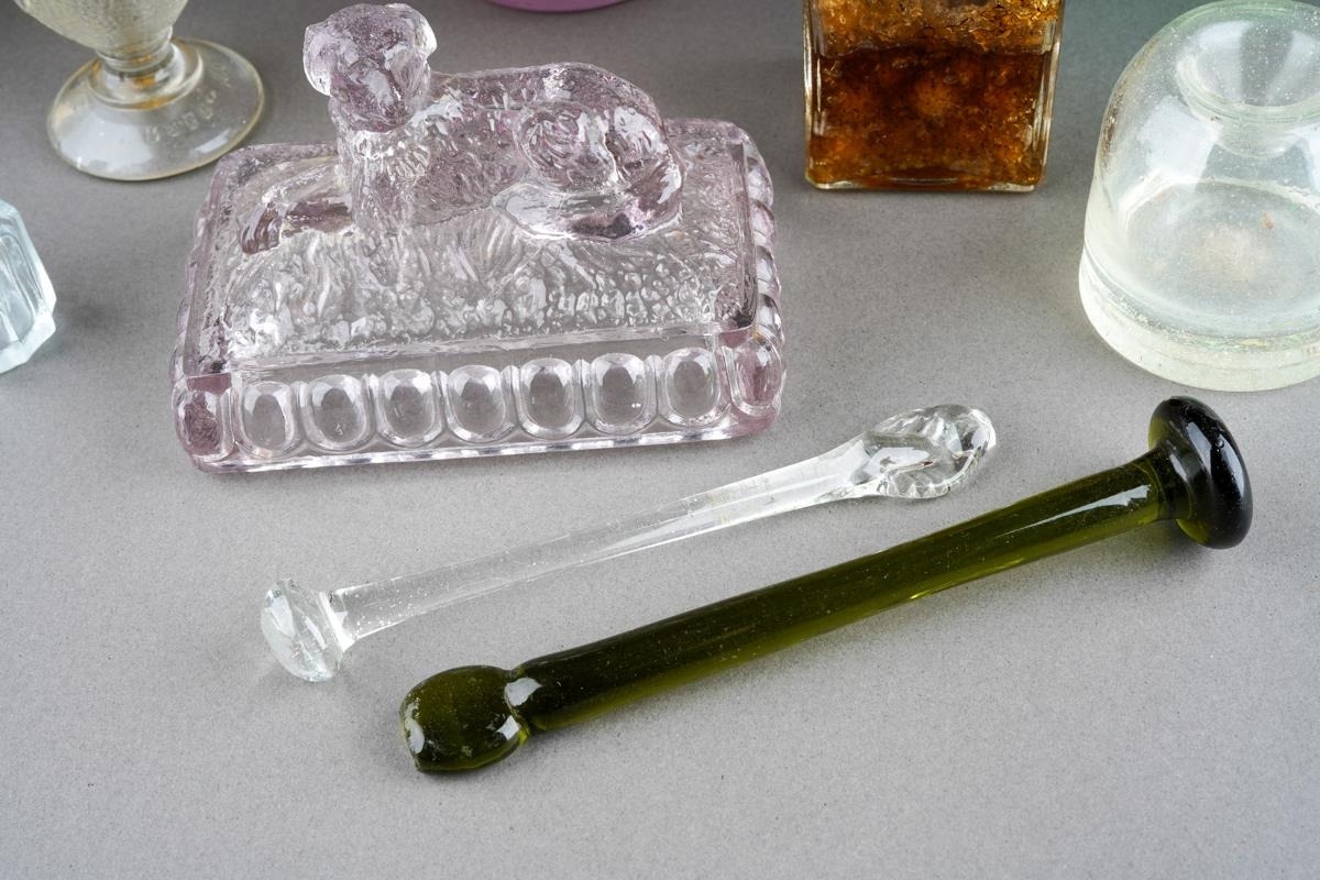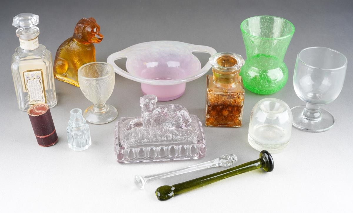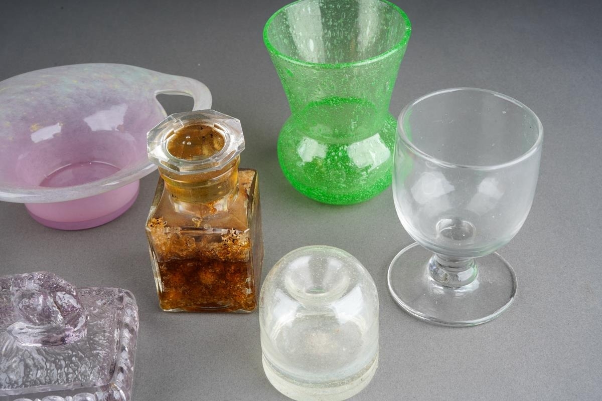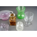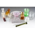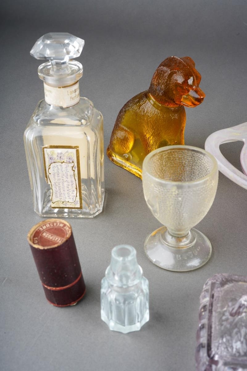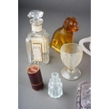Assorted glass to include Vasart style pink two handled bowl, 1930s style vase, moulded glass paperweight surmounted by a dog, a moulded amber glass paperweight modelled as a dog, Yardley Smelling Salts bottle, Violet de Parme bottle, moulded glass egg cup etc [1 box]