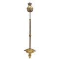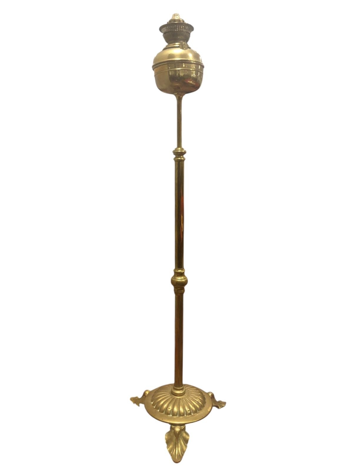 A 19TH CENTURY BRASS FLOOR STANDARD OIL LAMP (now converted) the cylindrical column above a lobed platform on foliate cast feet 184cm (h)