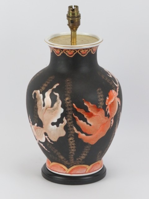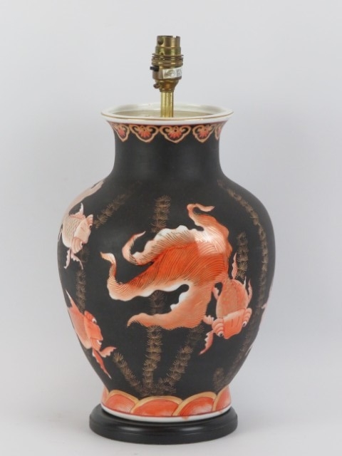 A modern Chinese fantail goldfish porcelain table lamp. 40 cm total height with fitting.