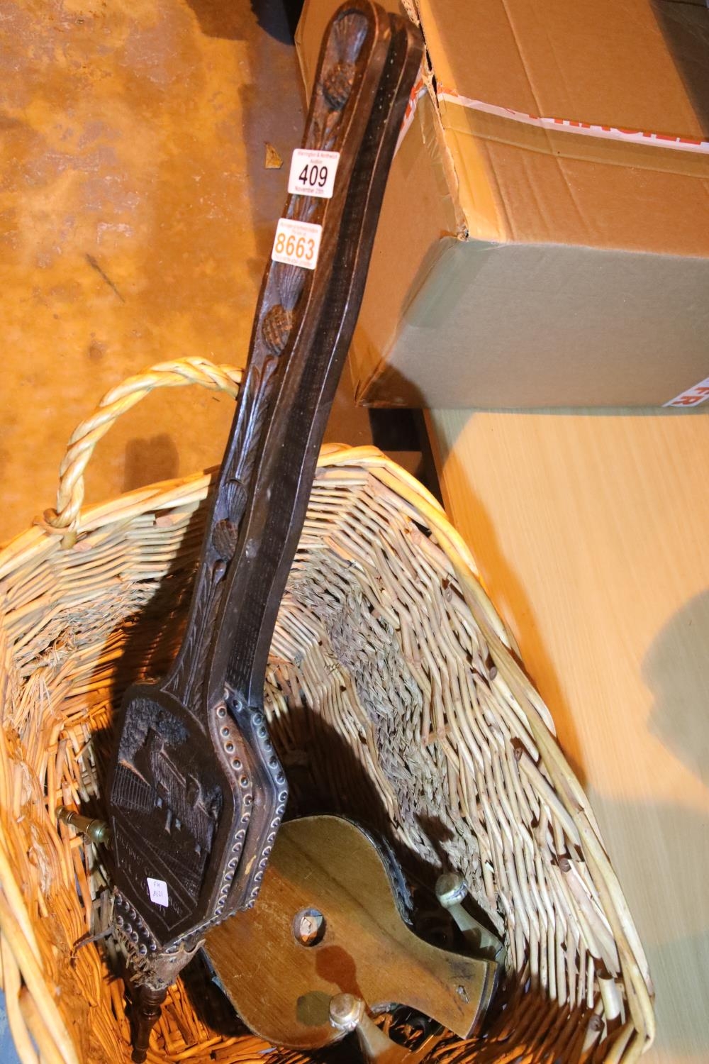 Two brass bellows, a brass trivet and a large two handled basket. Not available for in-house P&P