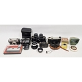 Collection of vintage cameras, binoculars and accessories, comprising Zeiss Ikon Ikonta, Kodak Instamatic 304, Kodak Kodette III, J D Moeller binoculars, Carl Zeiss Pro-Tesser 85mm lens, light meter etc.