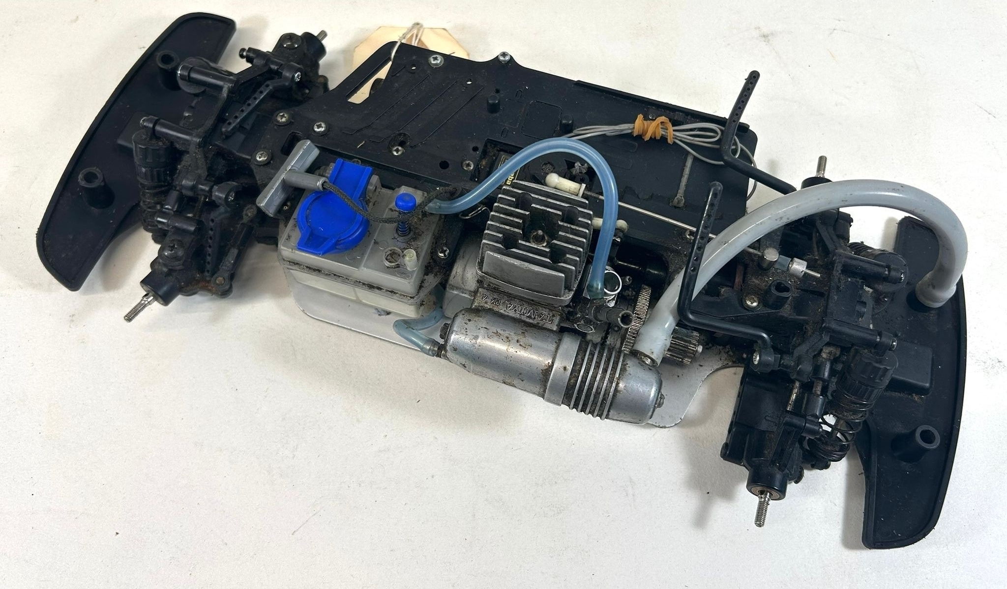 Tamiya TG-10 radio controlled 4x4 chassis fitted with an FS-12LT glow plug engine and TM-4 exhaust. Also fitted with servos. Requires cleaning and servicing before use. Basically GC, some parts may require replacing.