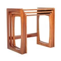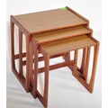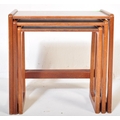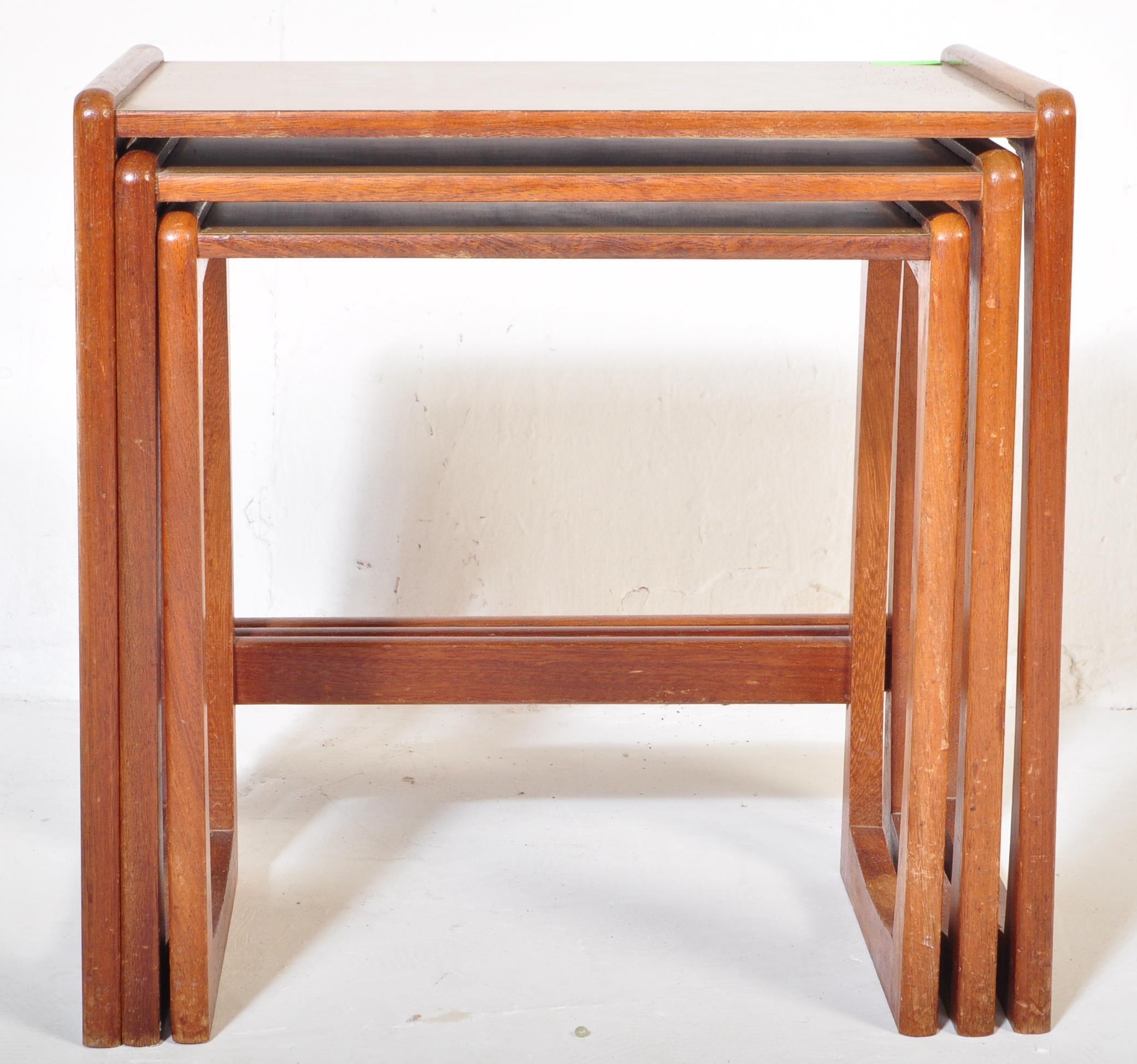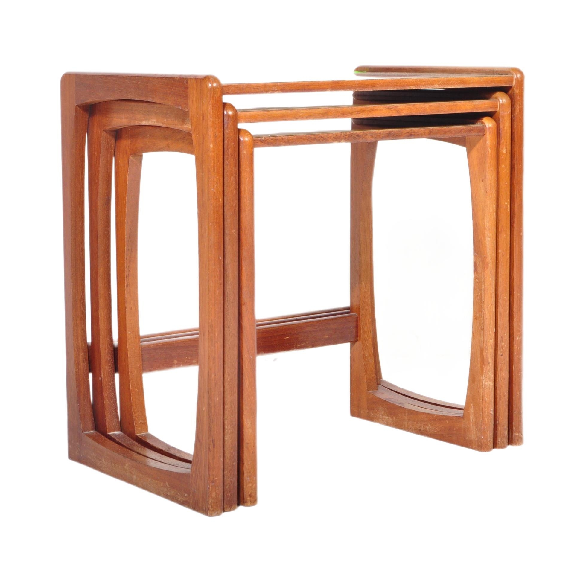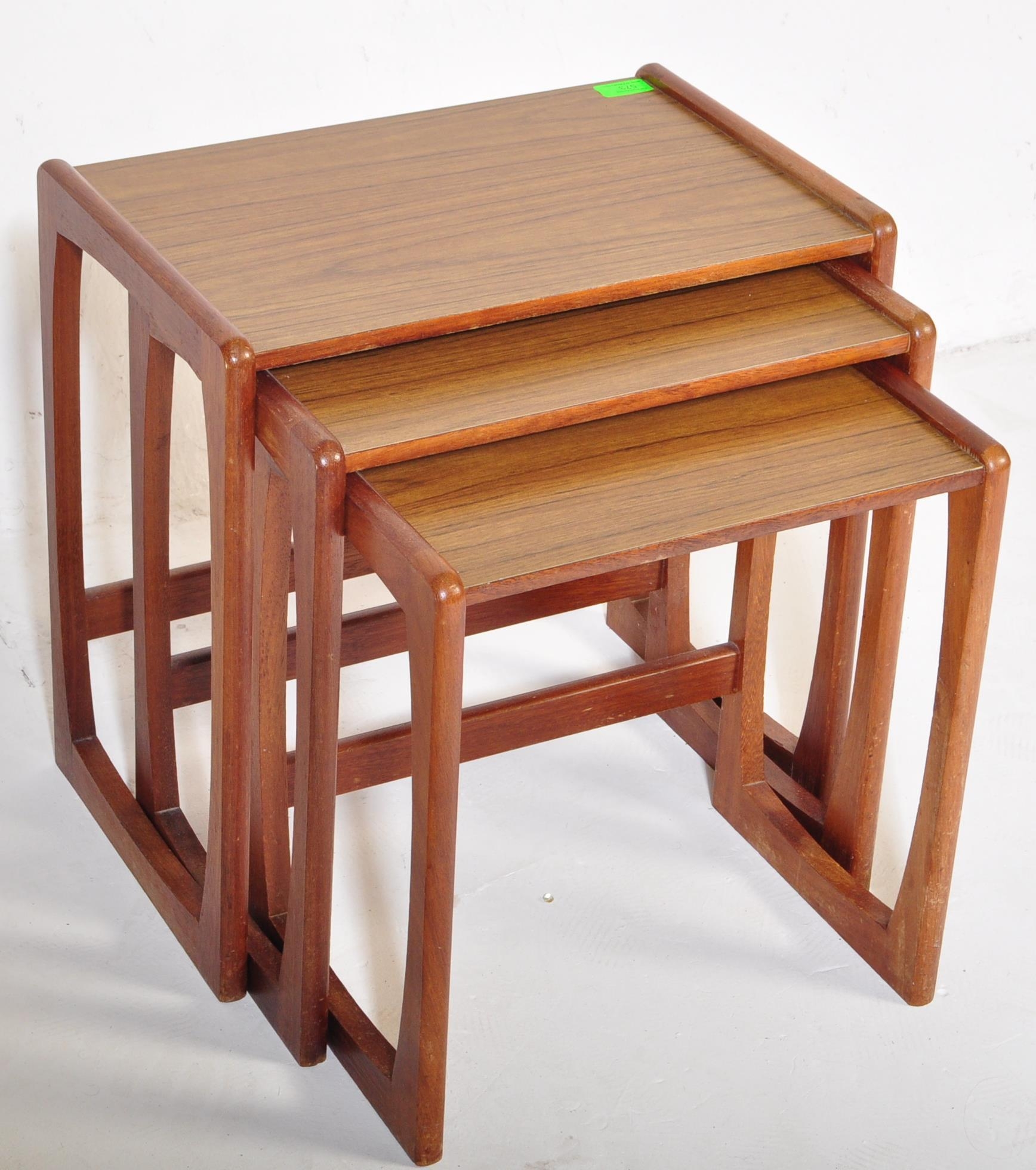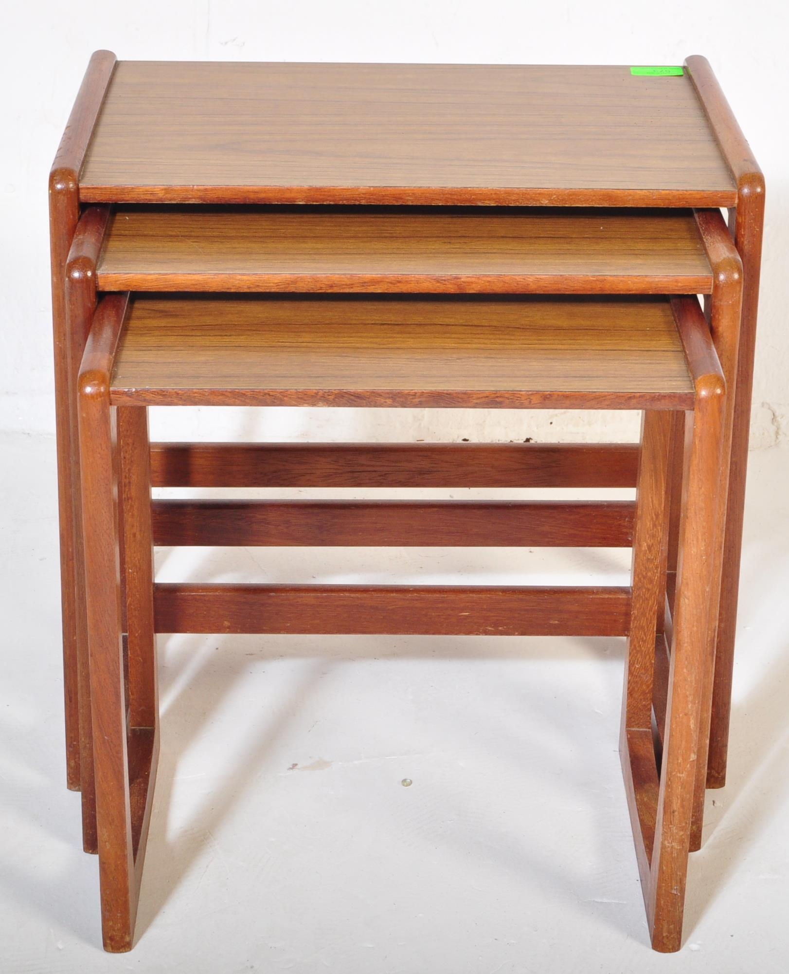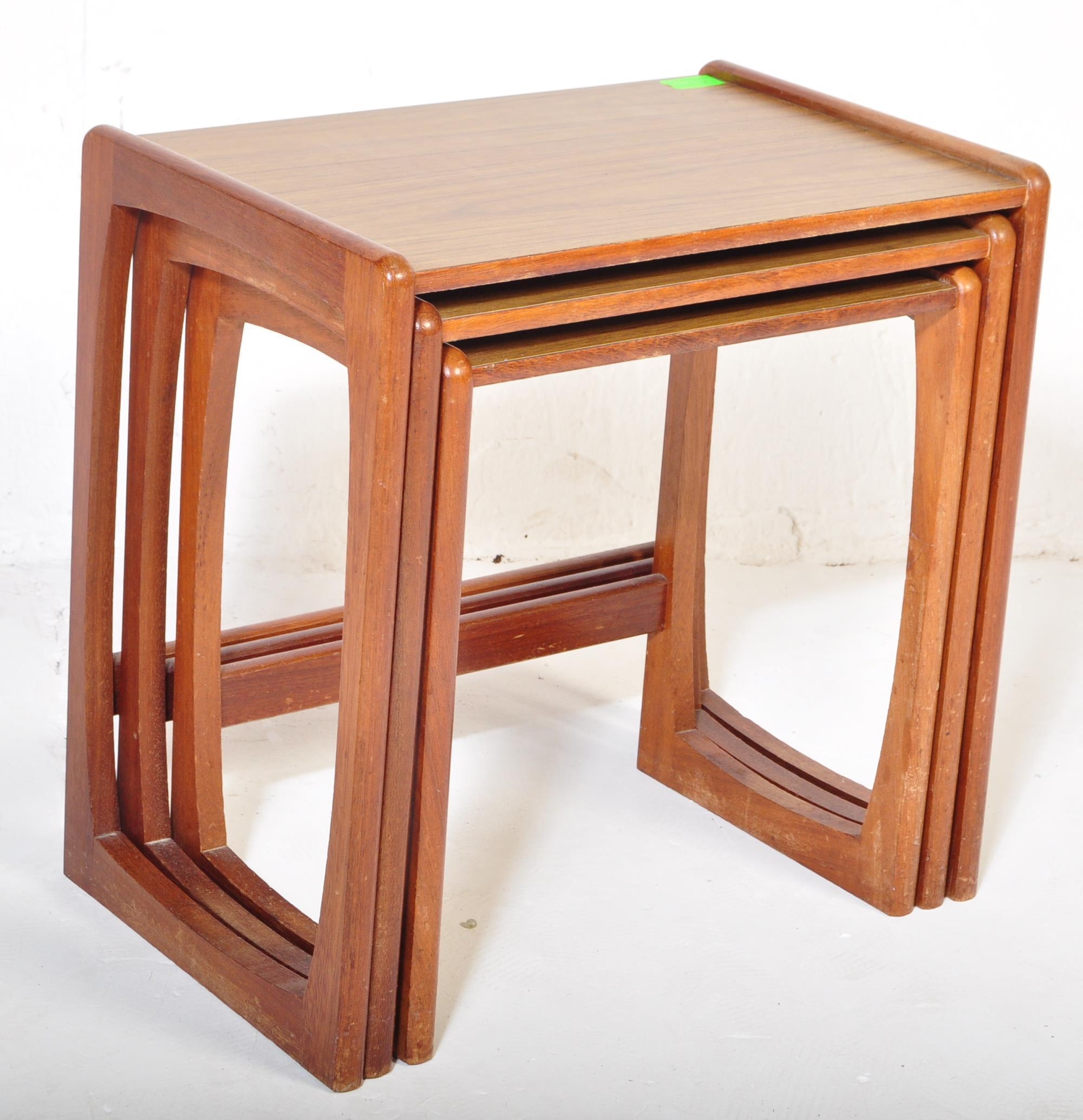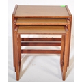 A vintage retro mid 20th century circa. 1960's nest of tables having teak wood supports resembling G Plan Quadrille range and formica faux wood top. Measures approx. 46cm x 47cm x 30cm.