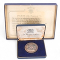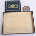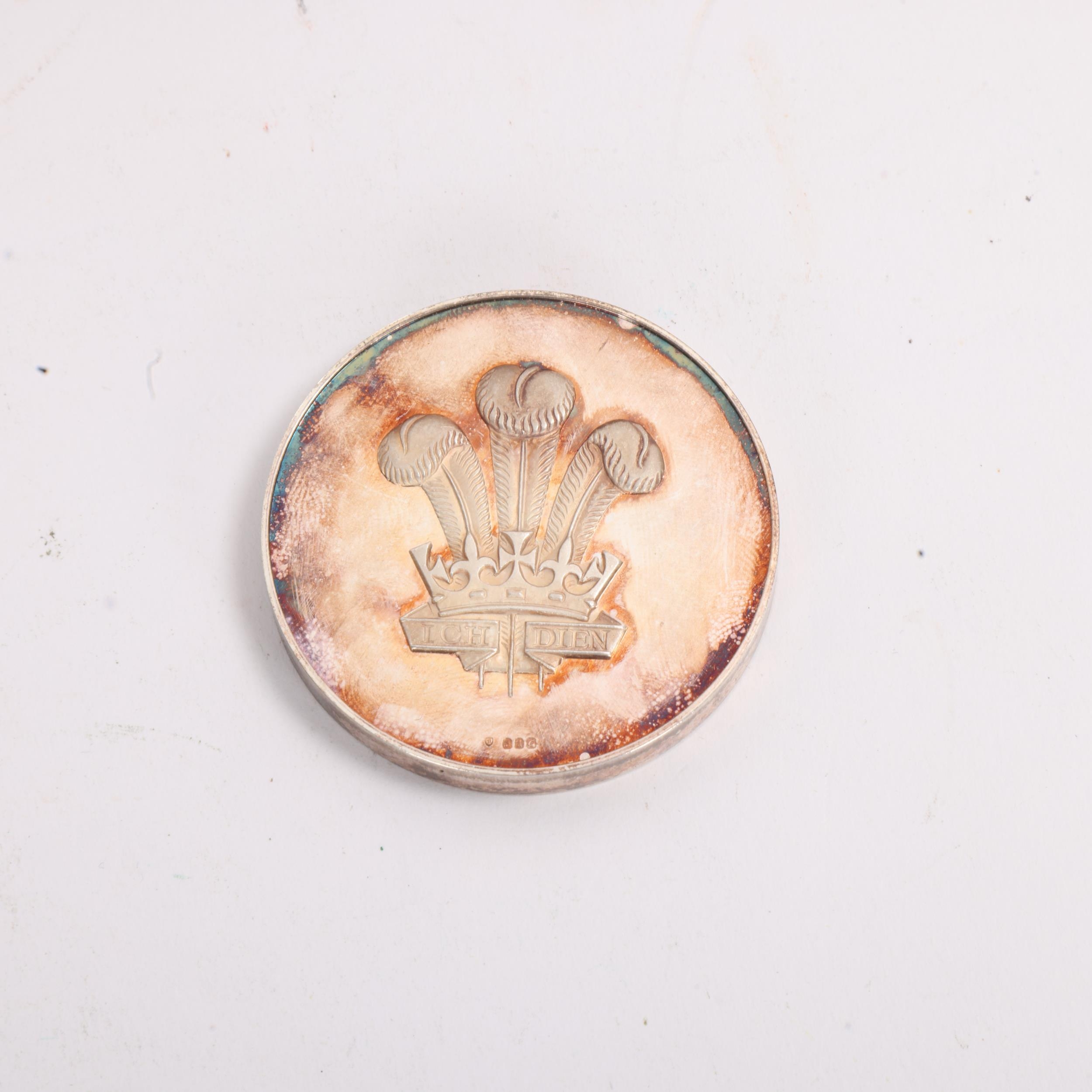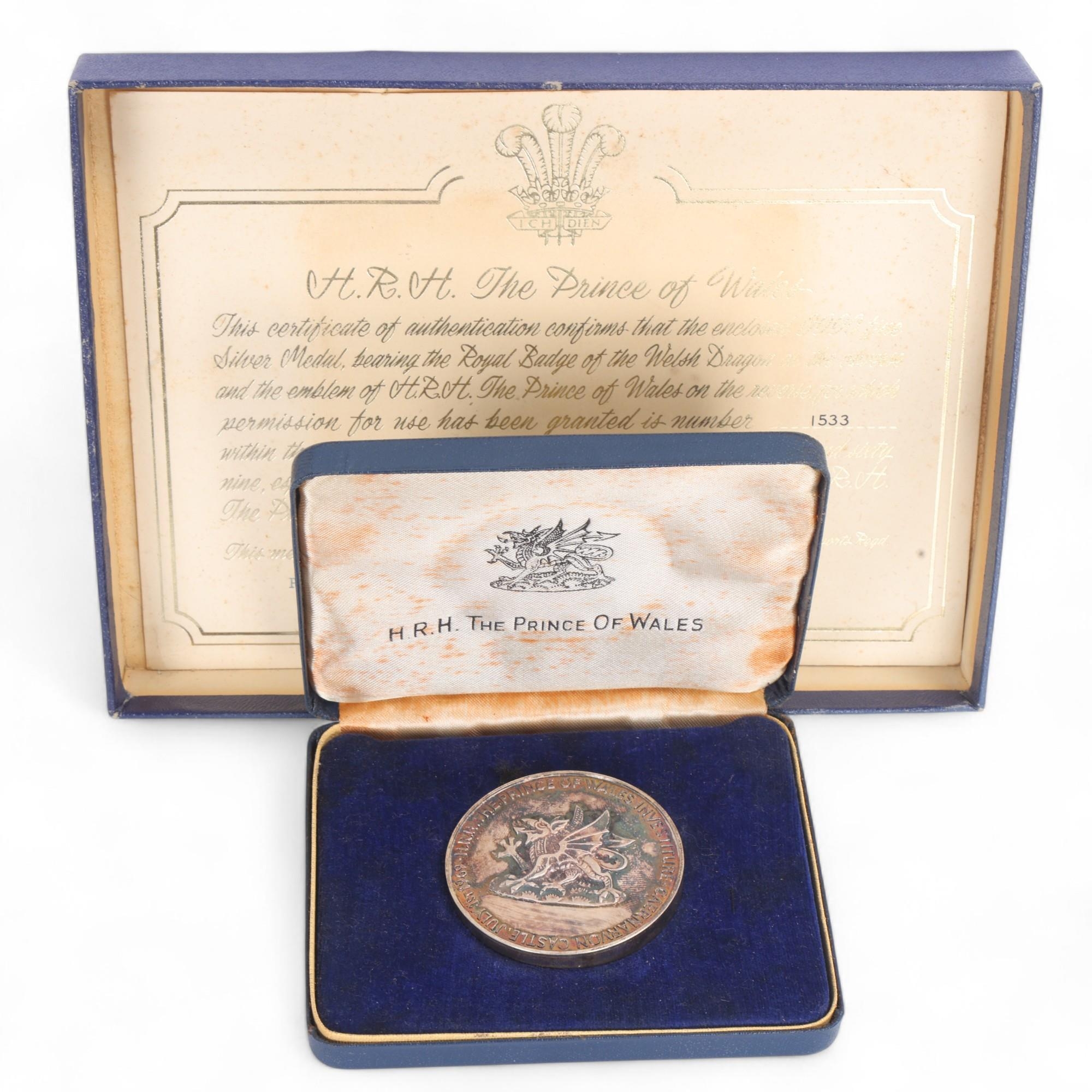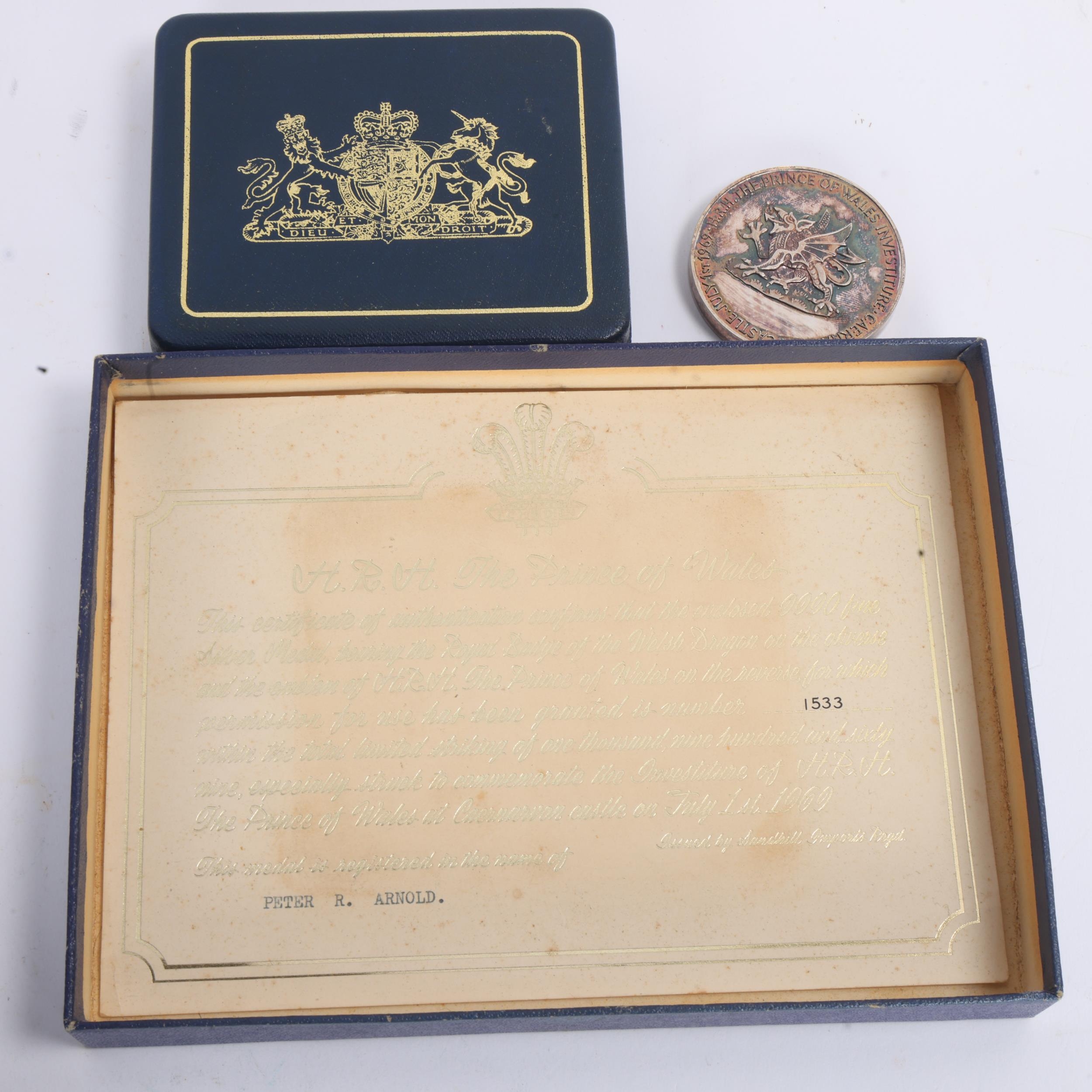 A Commemorative Silver Medal 'Investiture of Prince Charles 1969,' 113g (over 3.6 troy oz), .999 silver; obv. Welsh Dragon, rev. Prince of Wales feathers; limited edition by Sandhill Imports of 1969 medals (this medal No. 1533), with certificate and original boxes.