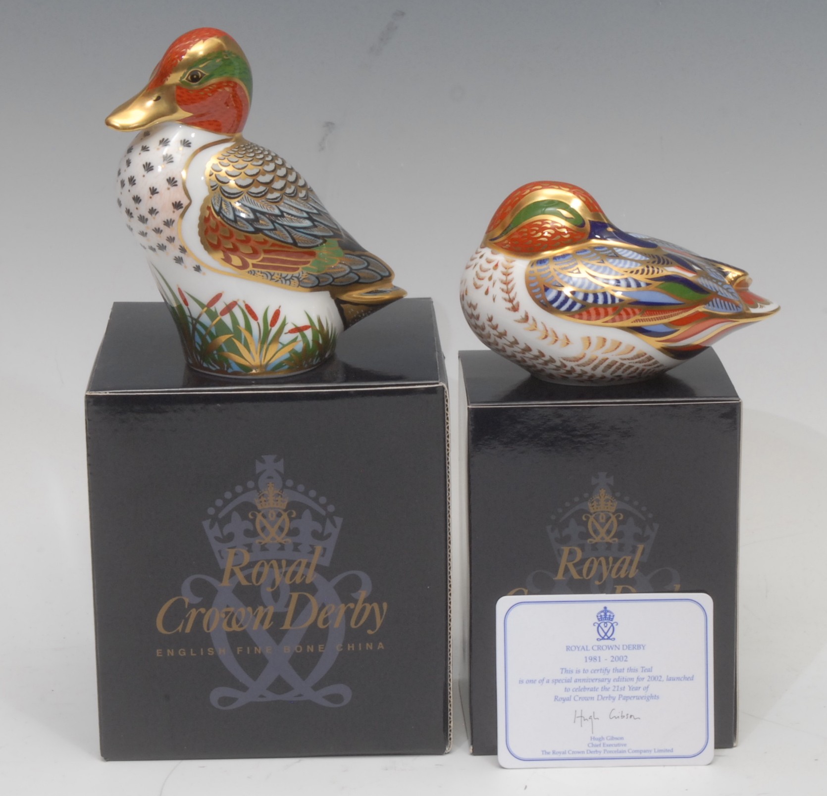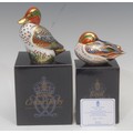 A Royal Crown Derby paperweight, Teal, special anniversary edition for 2002, to celebrate the 21st year, gold stopper, 11.5cm long, printed mark in red, certificate, boxed; another, Green Winged Teal, gold stopper, 12cm, printed mark in red, boxed (2)