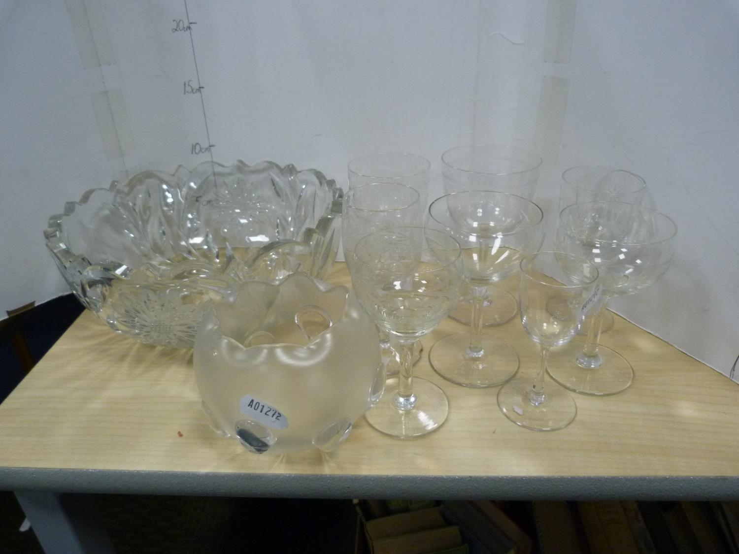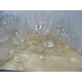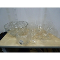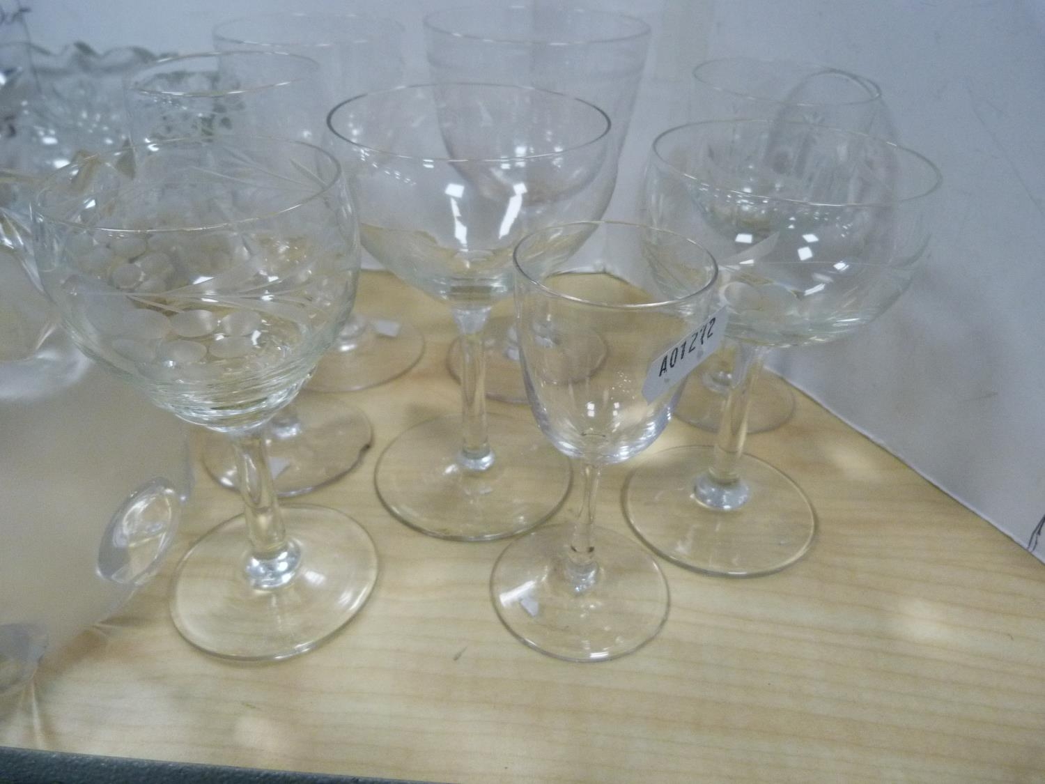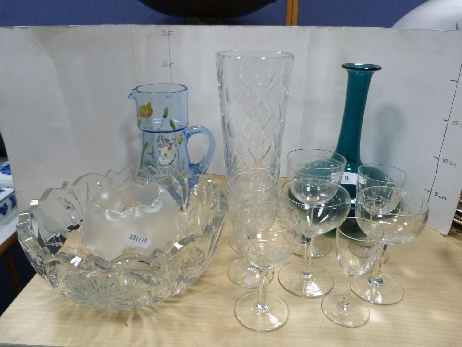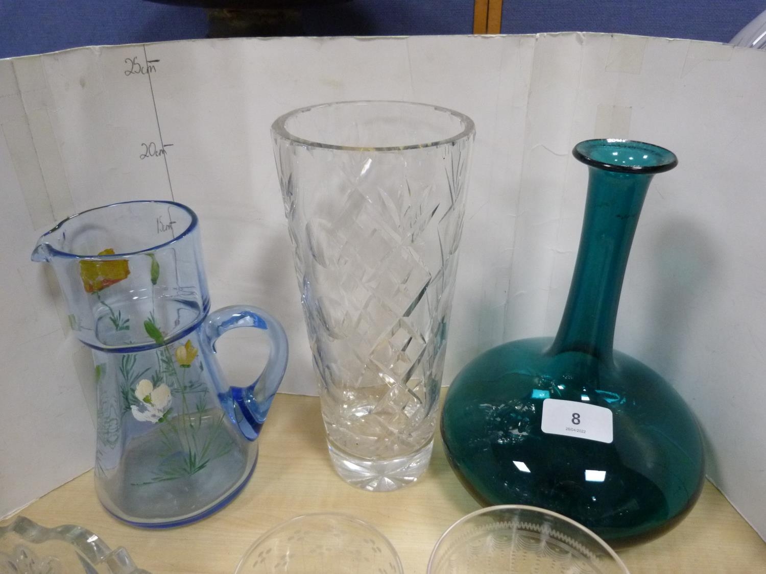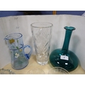 Glassware to include antique turquoise glass decanter, painted water jug, crystal vase, Art Nouveau-style shade, crystal bowl and a collection of etched and other glasses. (13)
