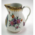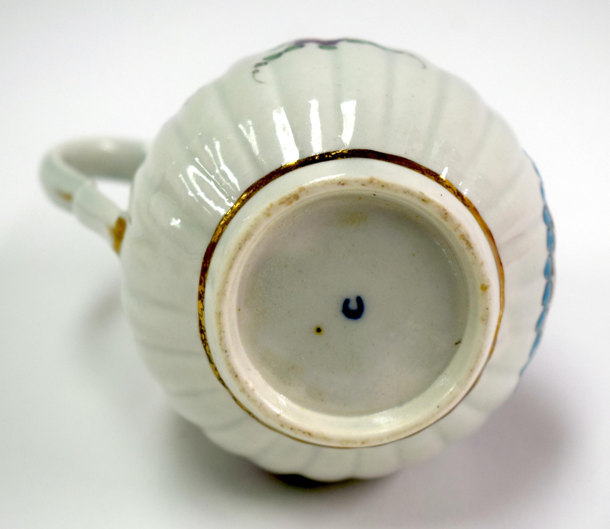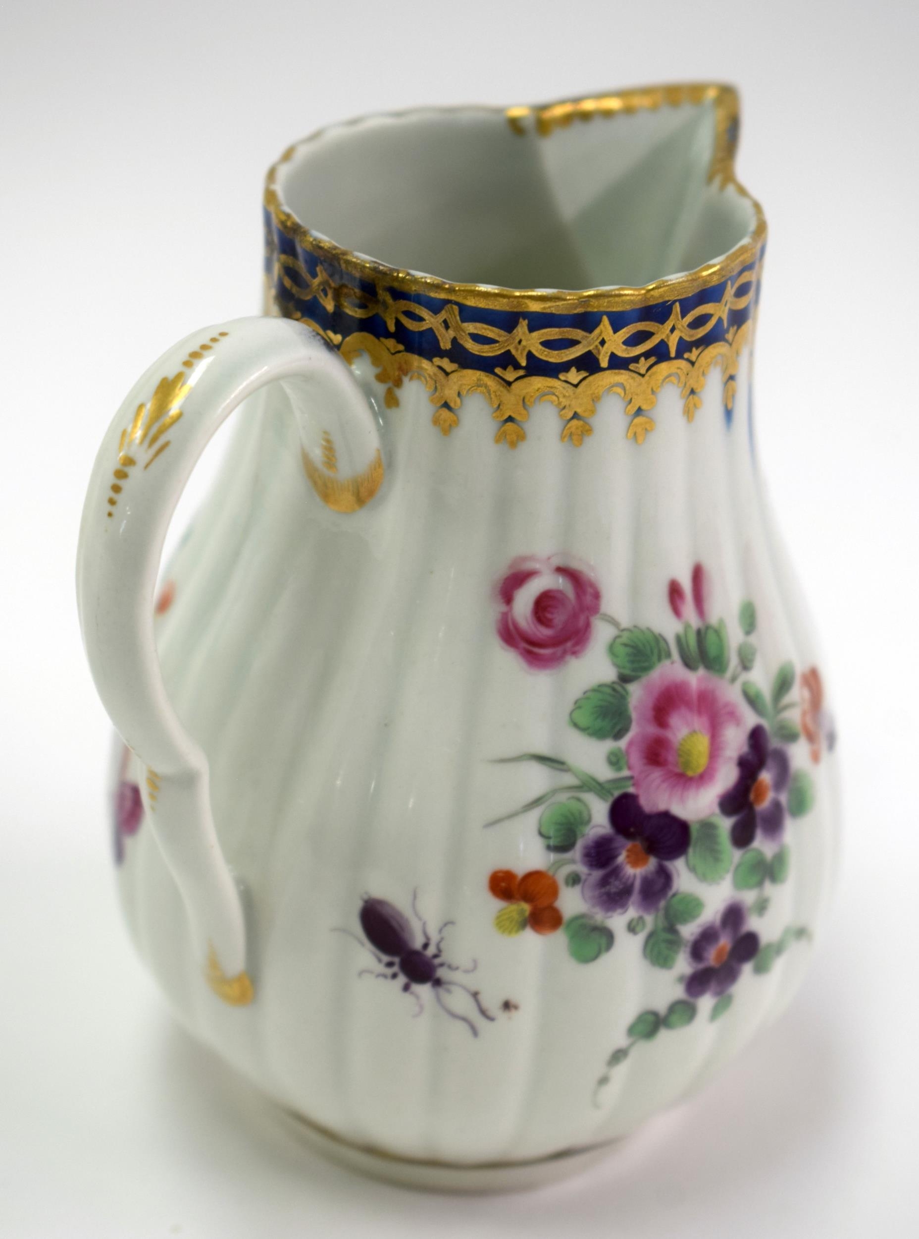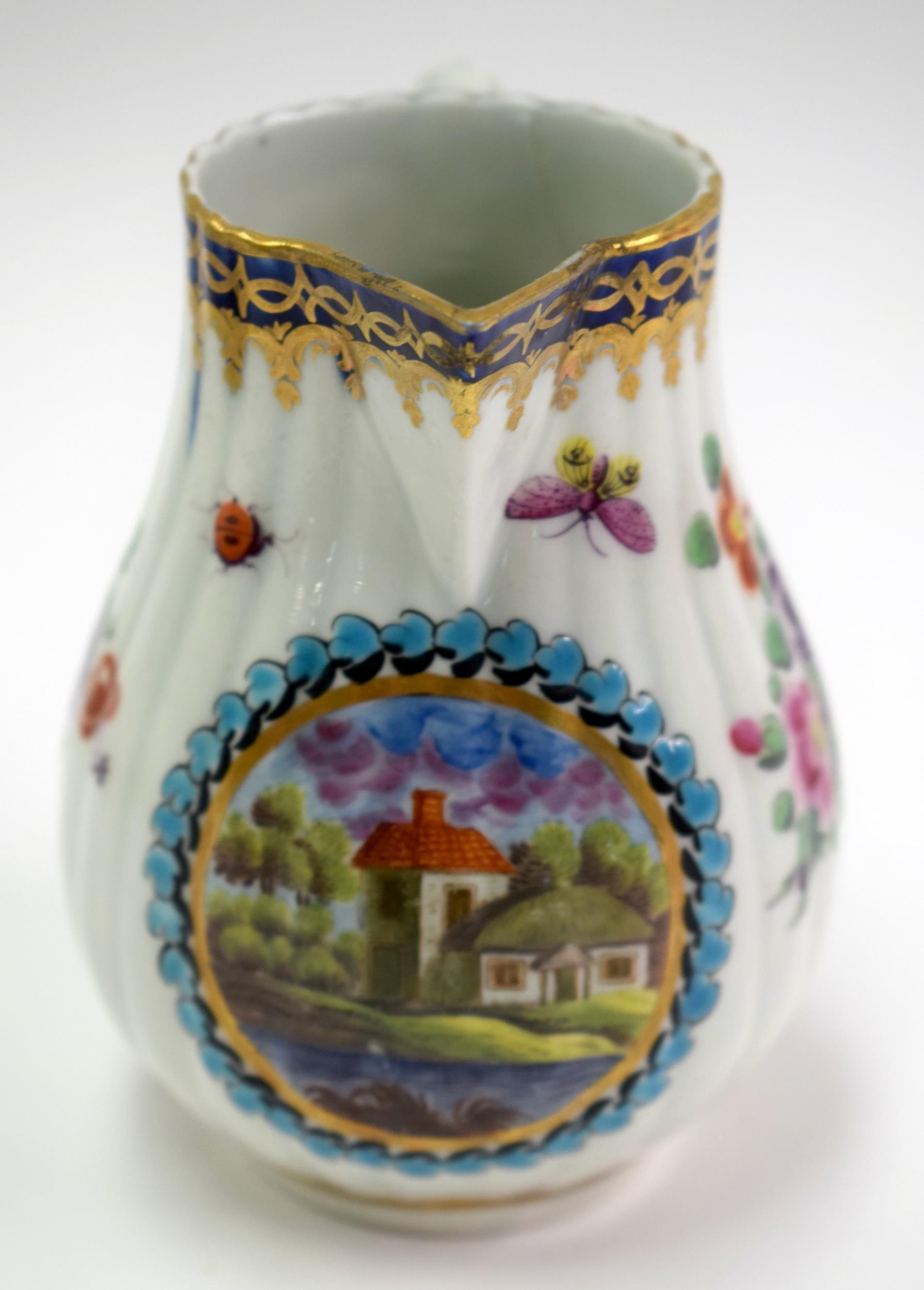 18th century Worcester fluted sparrowbeak jug painted with the Delhousie pattern having a landscape in a circular panel, scattered flowers and insects, all under a gilt and blue border. 11cm high