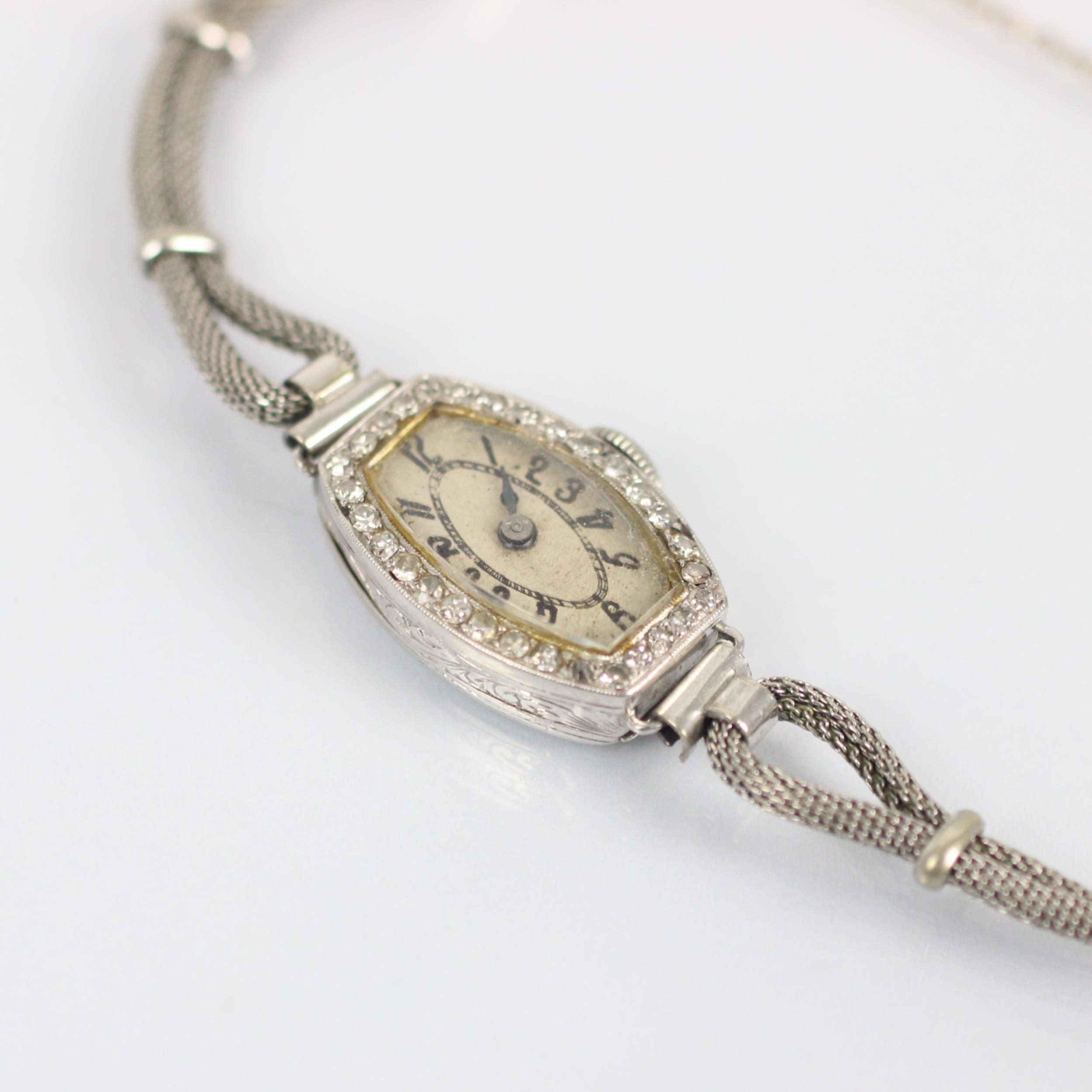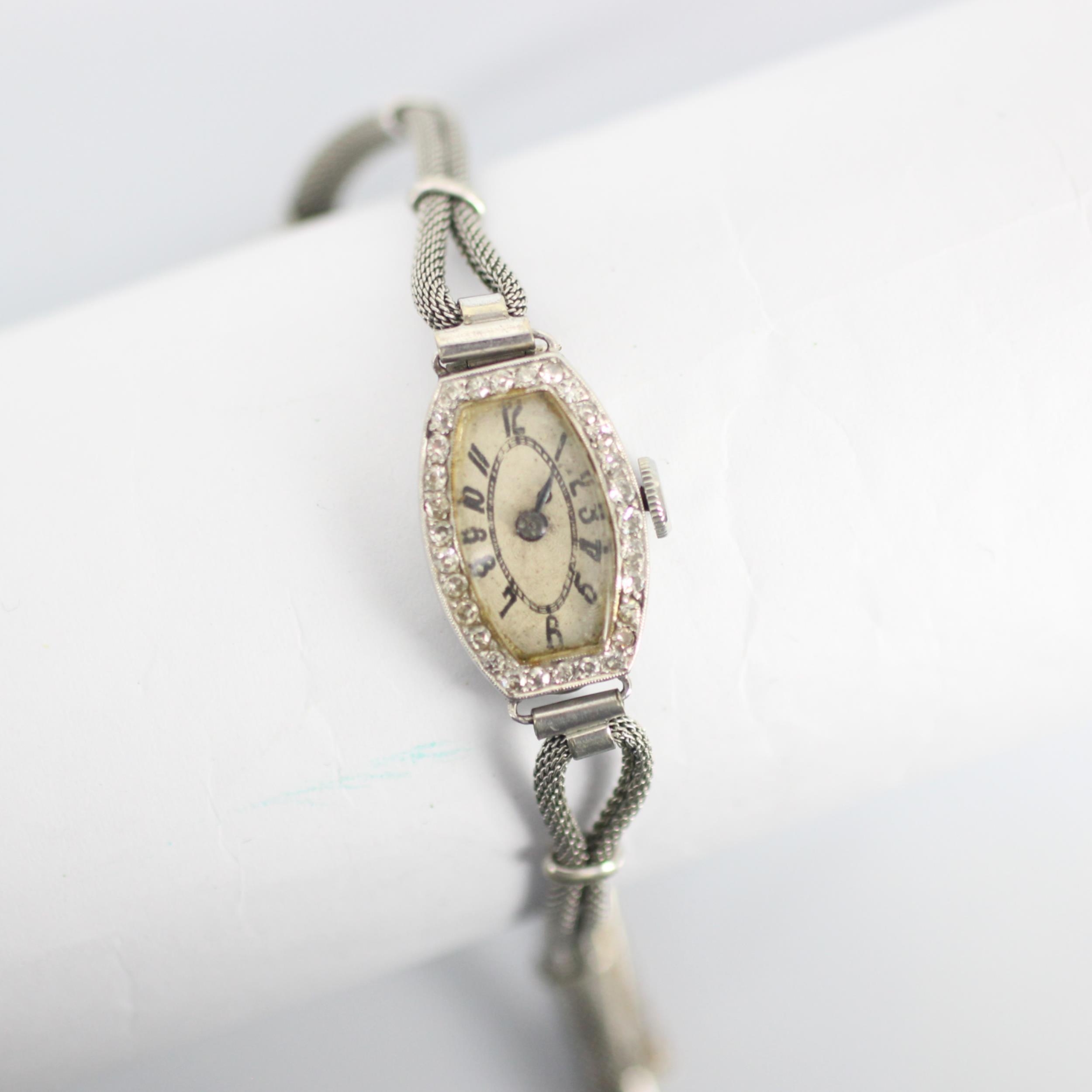An Art Deco ladies diamond cocktail wristwatch, the tonneau shaped dial with Arabic numerals, within a mixed cut diamond surround and engraved case, stamped to interior ‘Platinum London made’ 2cm long, upon an integral mesh link bracelet with ladder snap clasp stamped ‘Netonia Rhod plt’ gross weight 12gms (including movement and bracelet) total diamond weight estimated 0.50ct