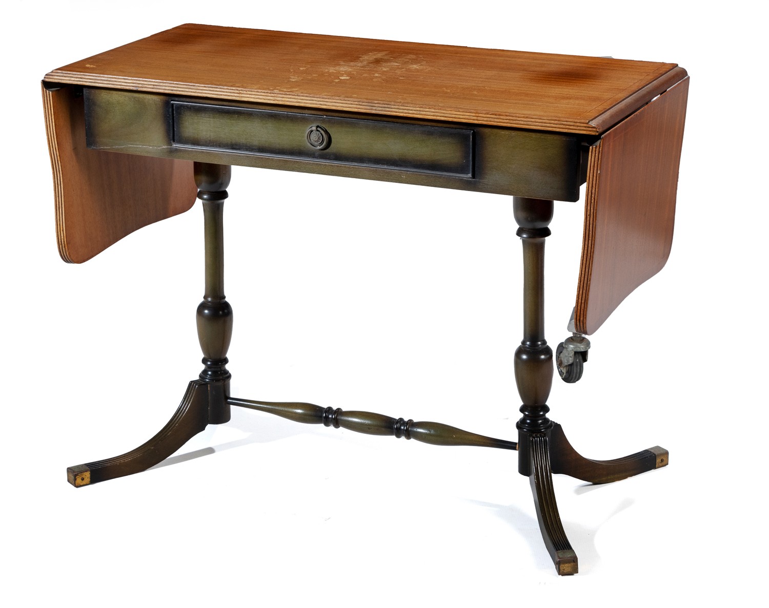 The hinged, moulded rectangular top above a frieze drawer, on turned baluster supports, on splayed legs, joined by a turned stretcher, distress