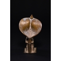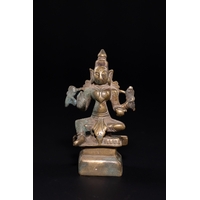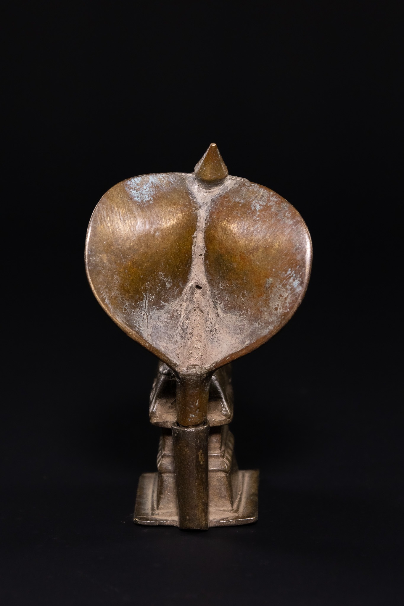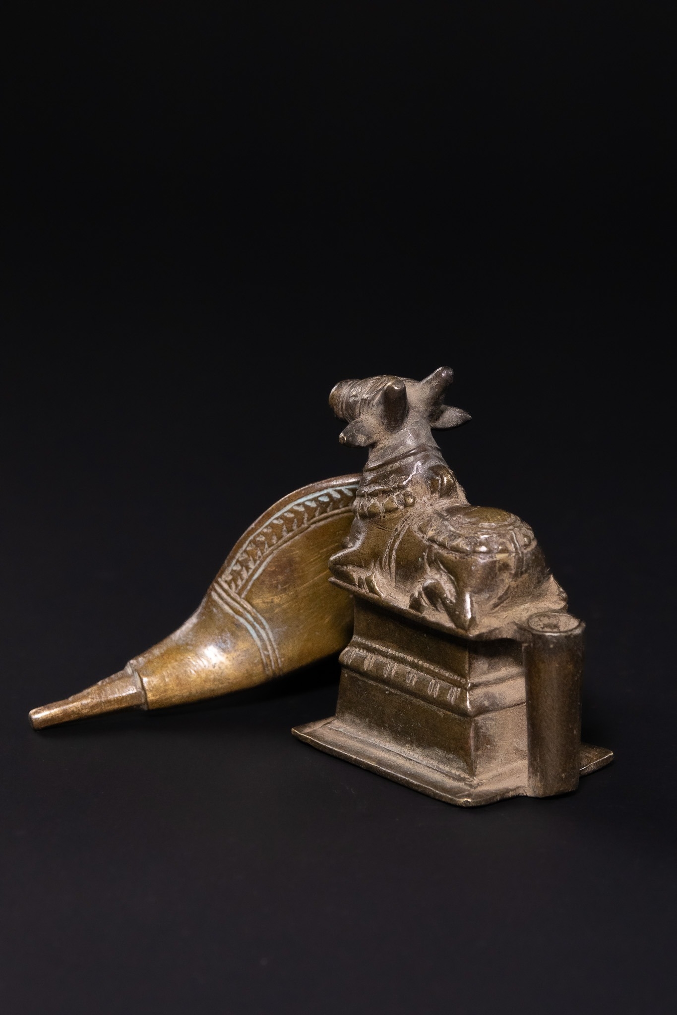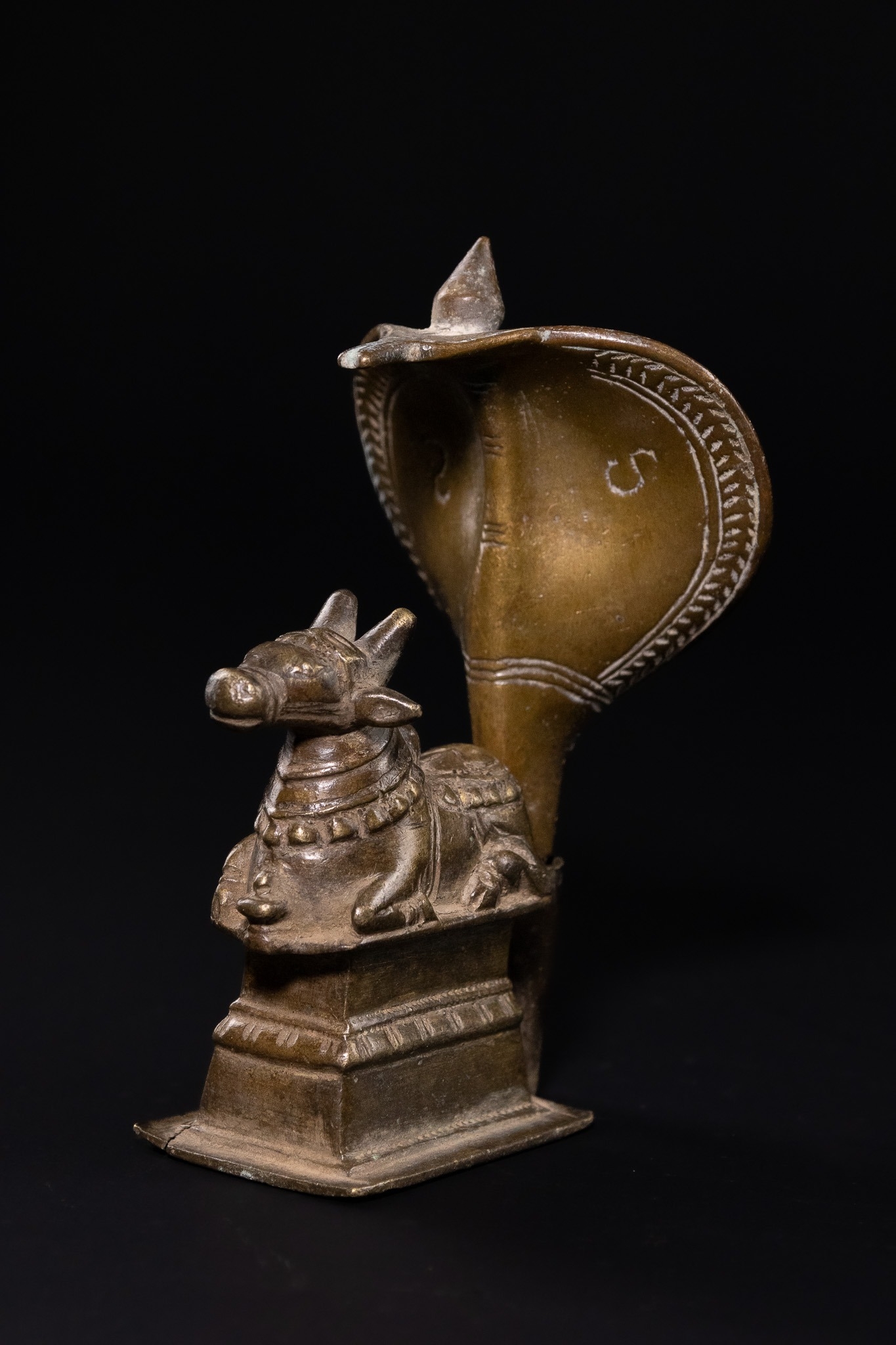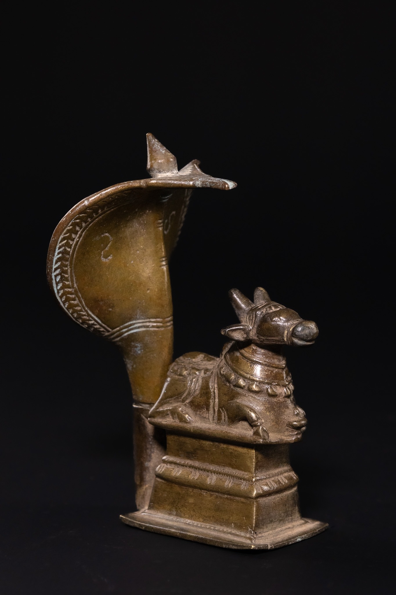 A traditional Indian ritual sculpture from the Deccan region. This Shaivite devotional object consists of two separate components: a seated figure of Nandi, the sacred bull and vahana (mount) of Lord Shiva, and a removable backpiece in the form of a flared Naga (cobra). Nandi is depicted in a couchant posture upon a tiered rectangular pedestal, adorned with a bell collar and ornamental saddlecloth. The Naga backpiece slots into the rear of the base, its broad hood providing a protective canopy over the bull. The interior of the cobra hood is decorated with engraved geometric borders and stylized markings.