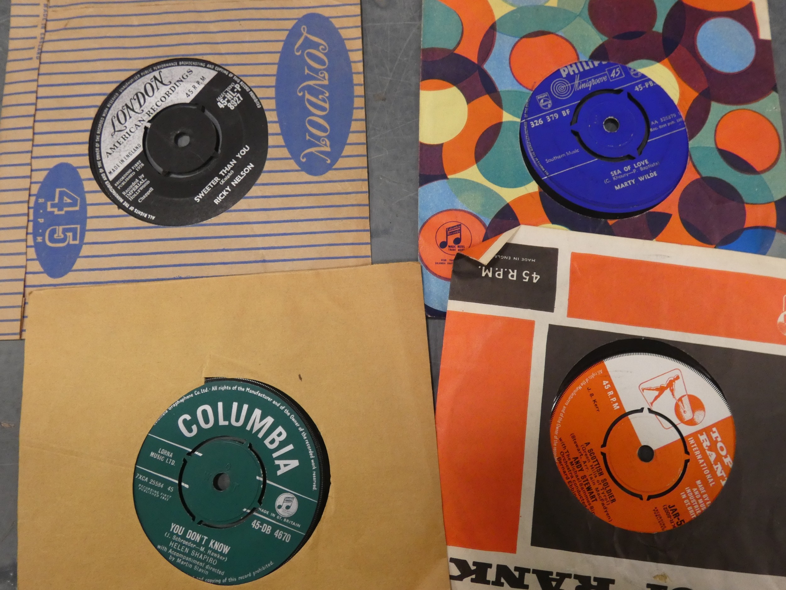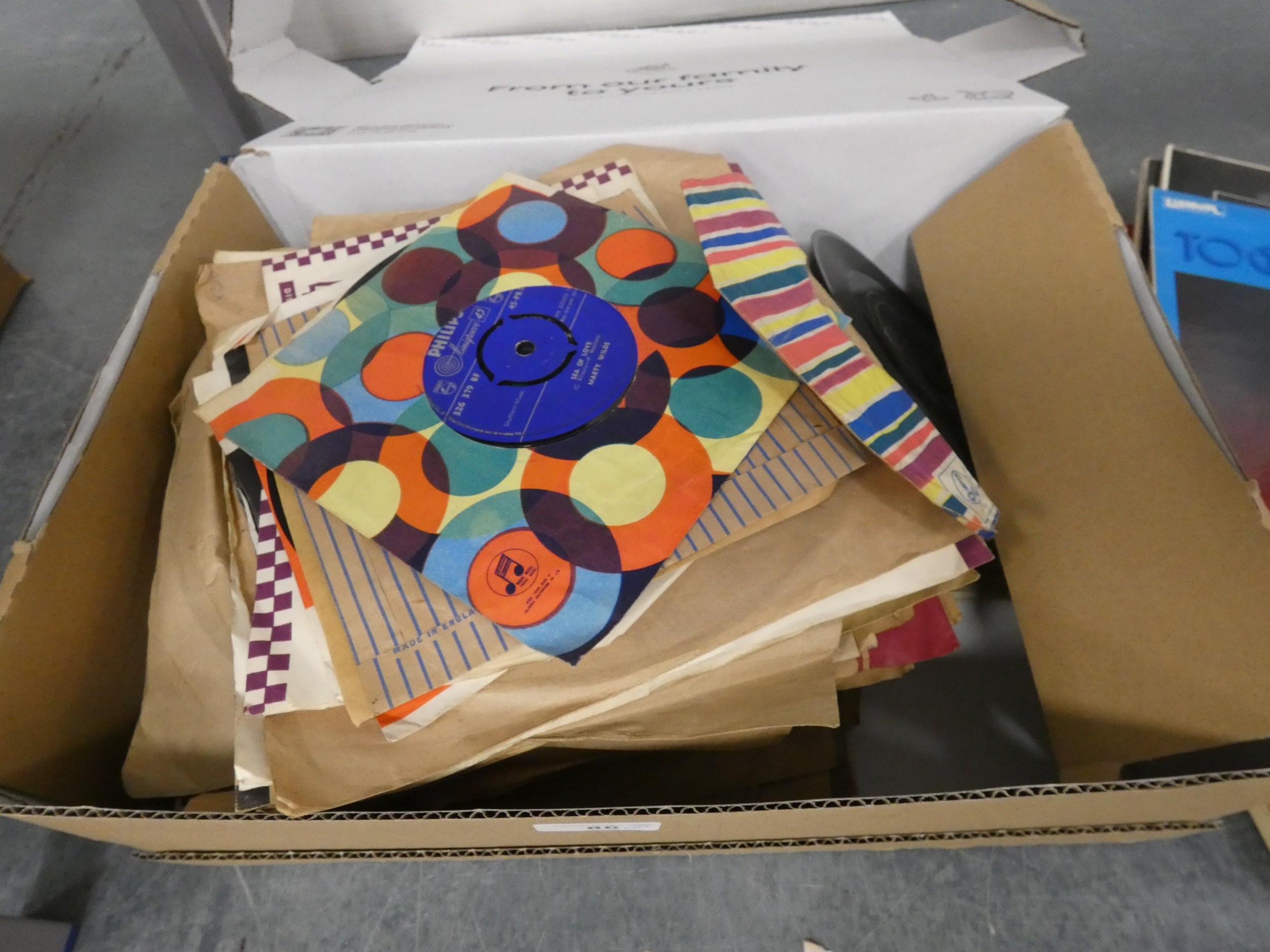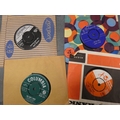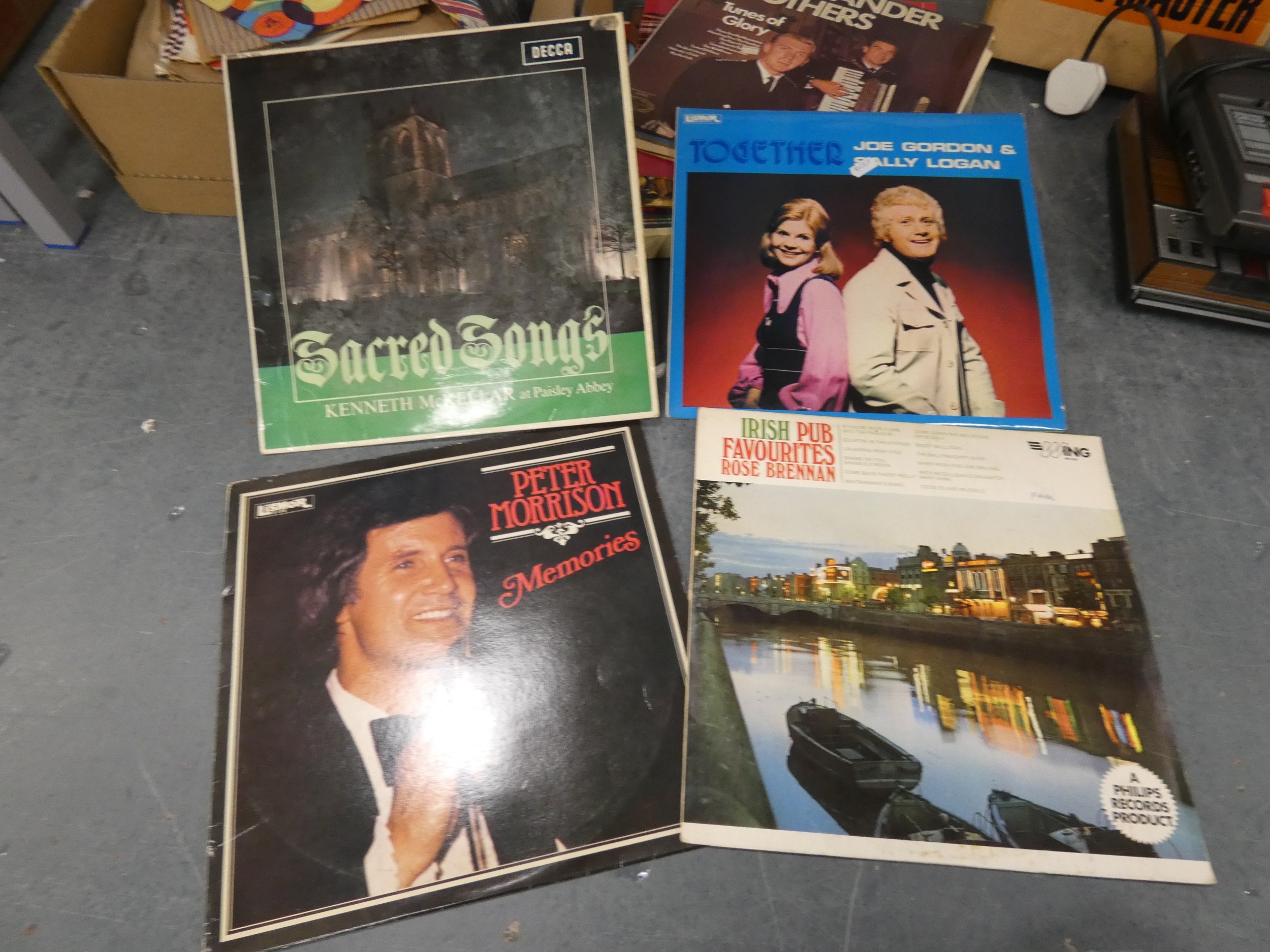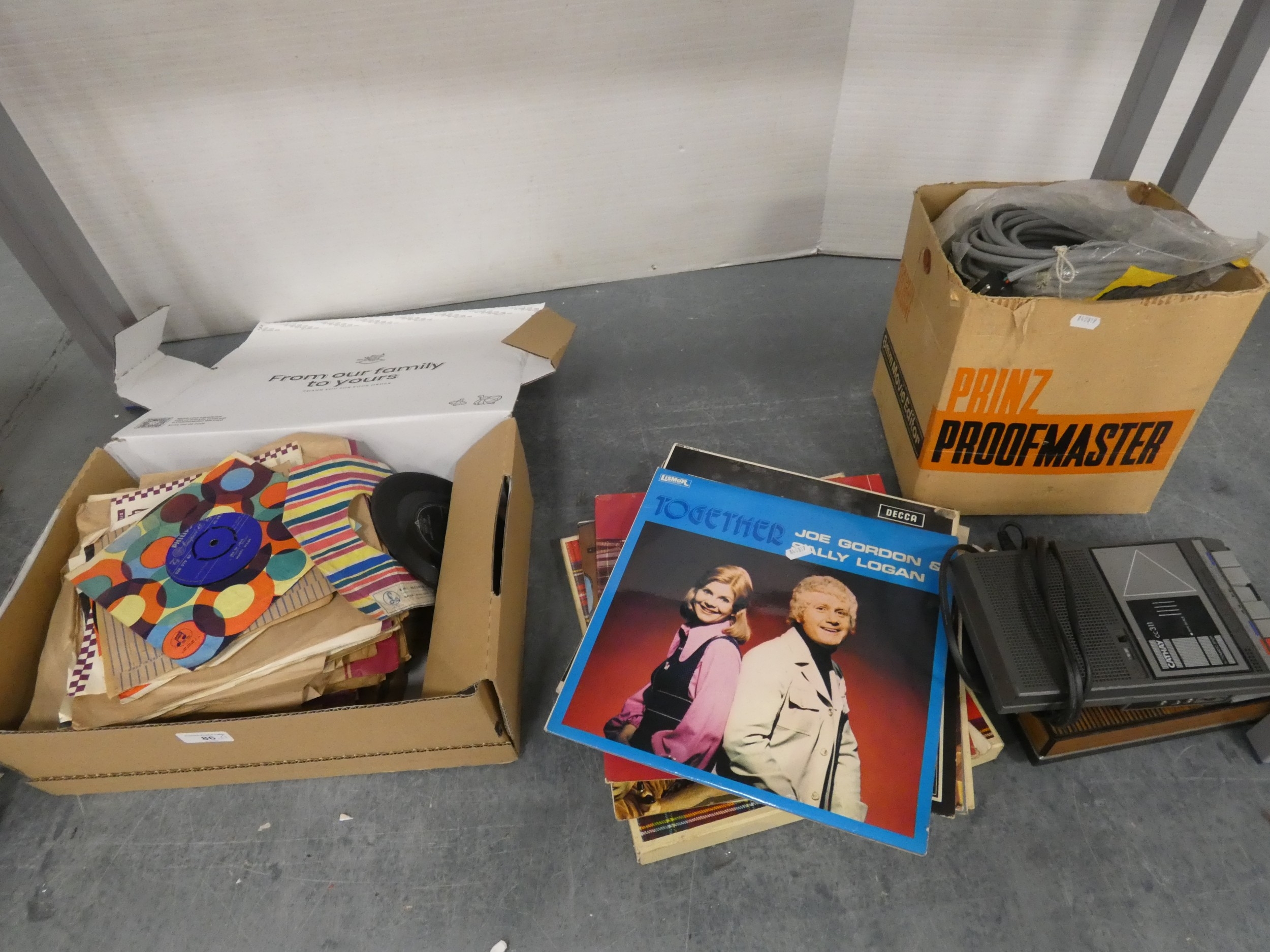 Group of easy listening vinyl top include 45s and LPs, Prinz Proofmaster 8mm movie editor in box and tape recorders.