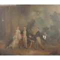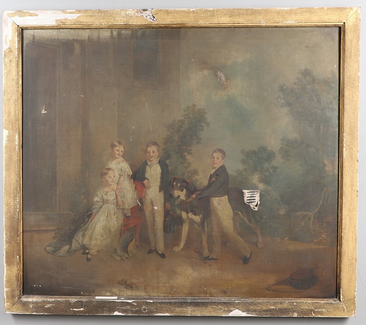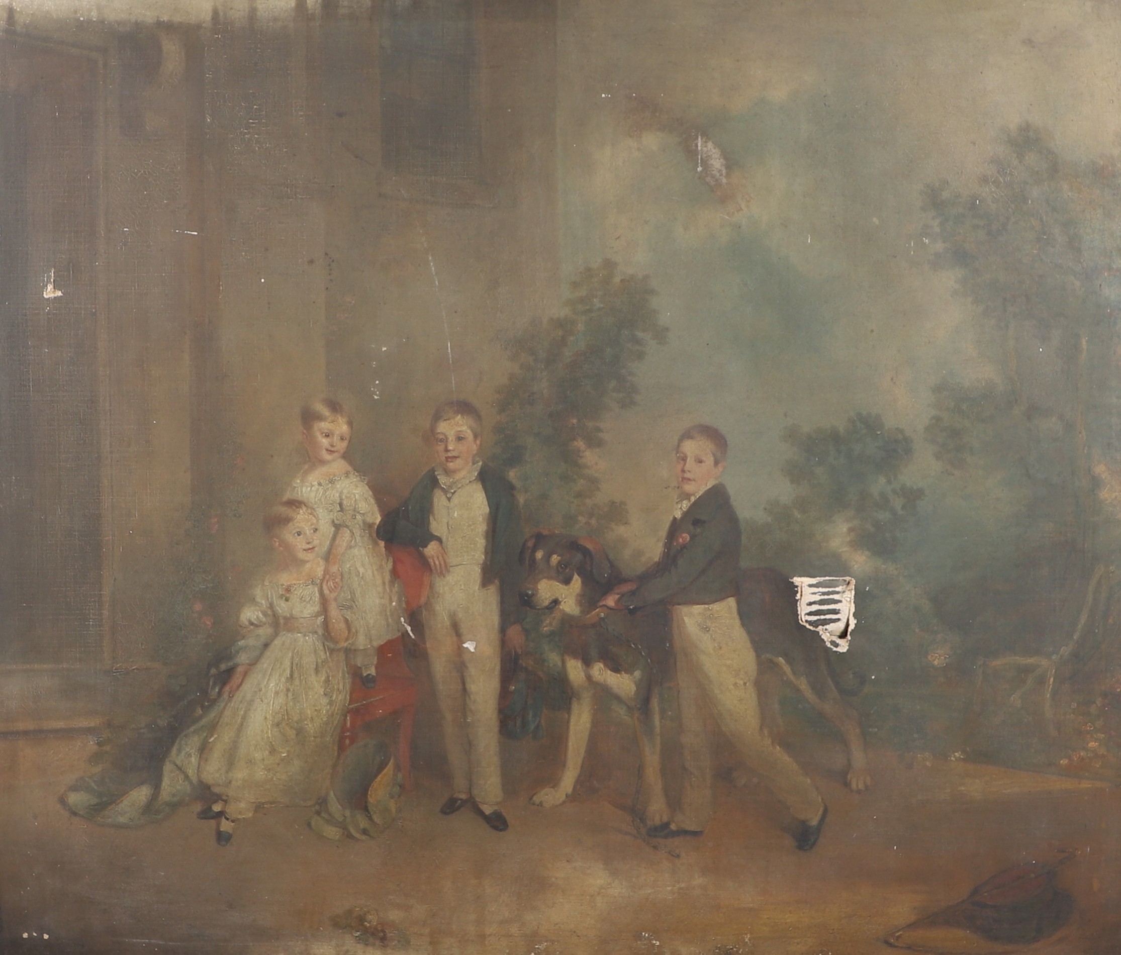 CIRCLE OF THOMAS PHILLIPS, RA (1770-1845). PORTRAIT OF FOUR CHILDREN WITH THE FAMILY DOG. All depicted in the garden of a country house, oil on canvas, slip frame