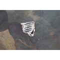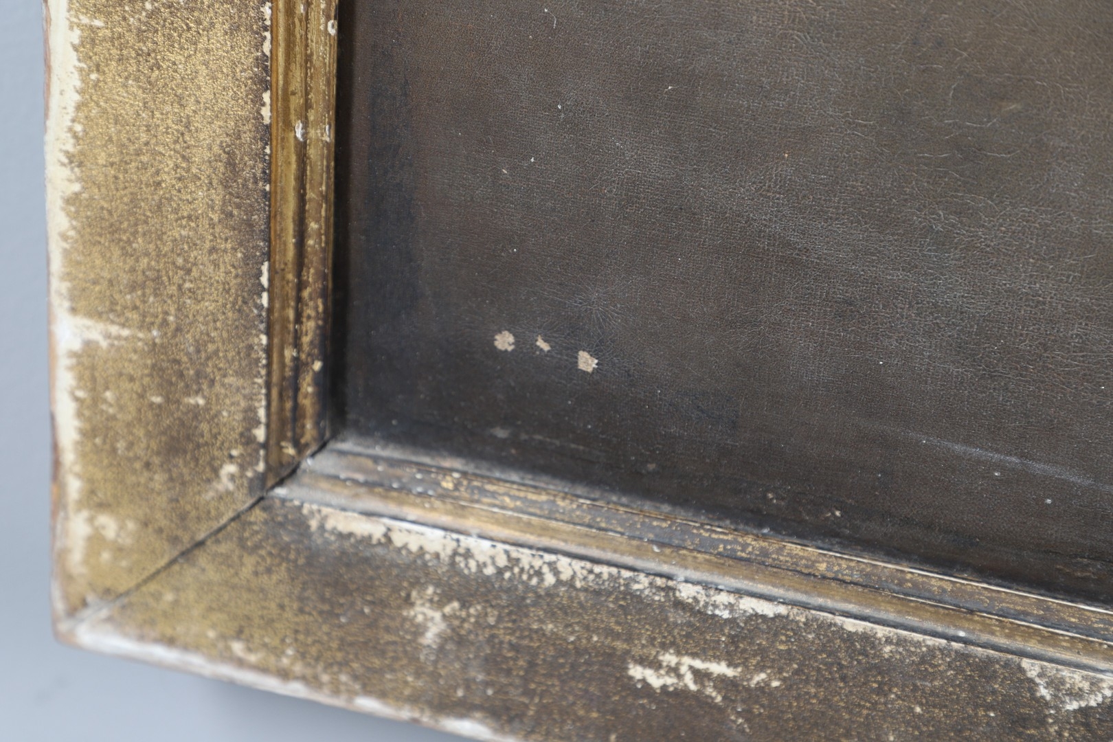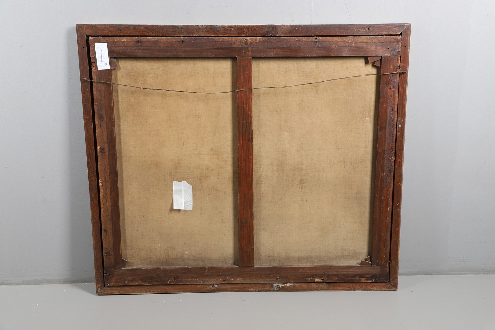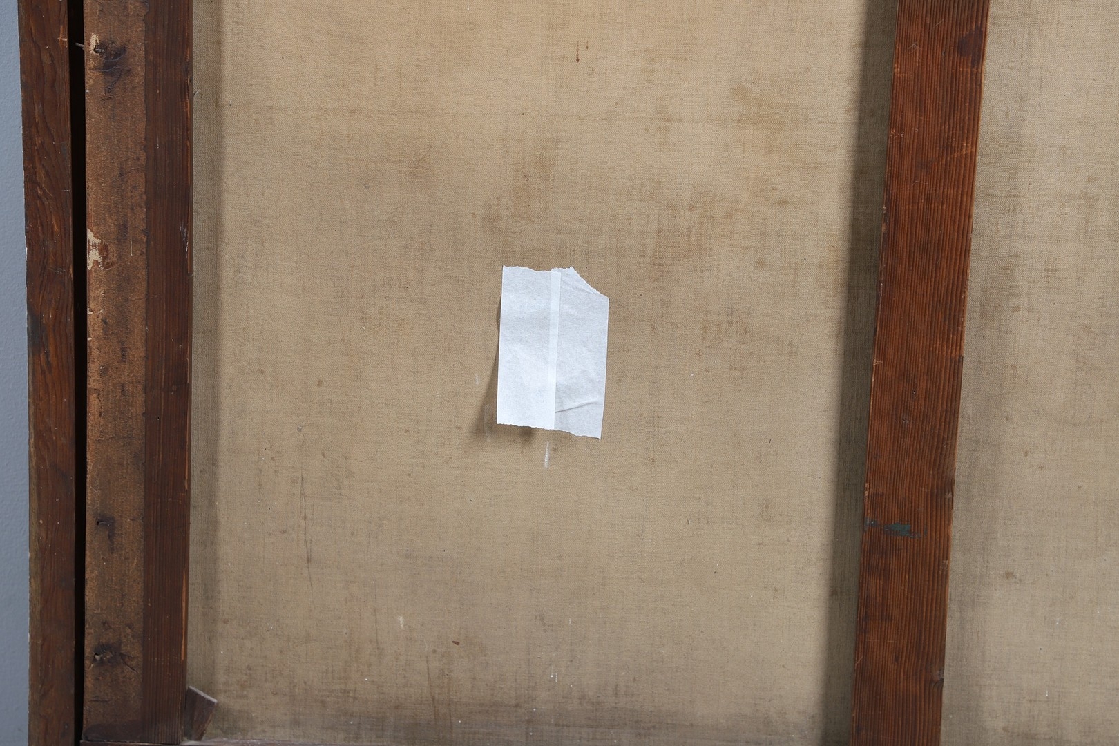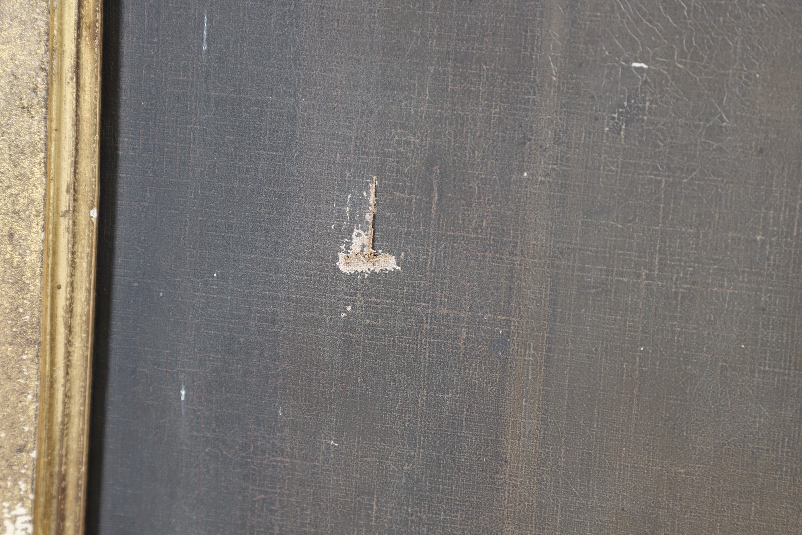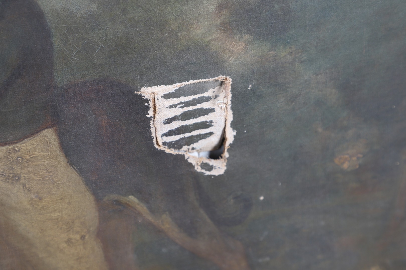 Evident tear near dog's tail; scattered small damages and faults elsewhere (grazes, flaked losses, some craquelure); needs a clean and general renovation.